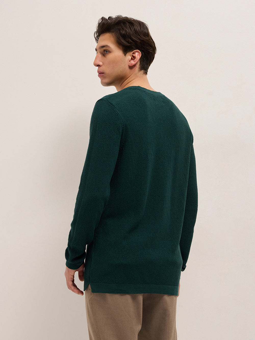 Green Regular Fit Full Sleeve Flat Knit T-Shirt with Solid Texture