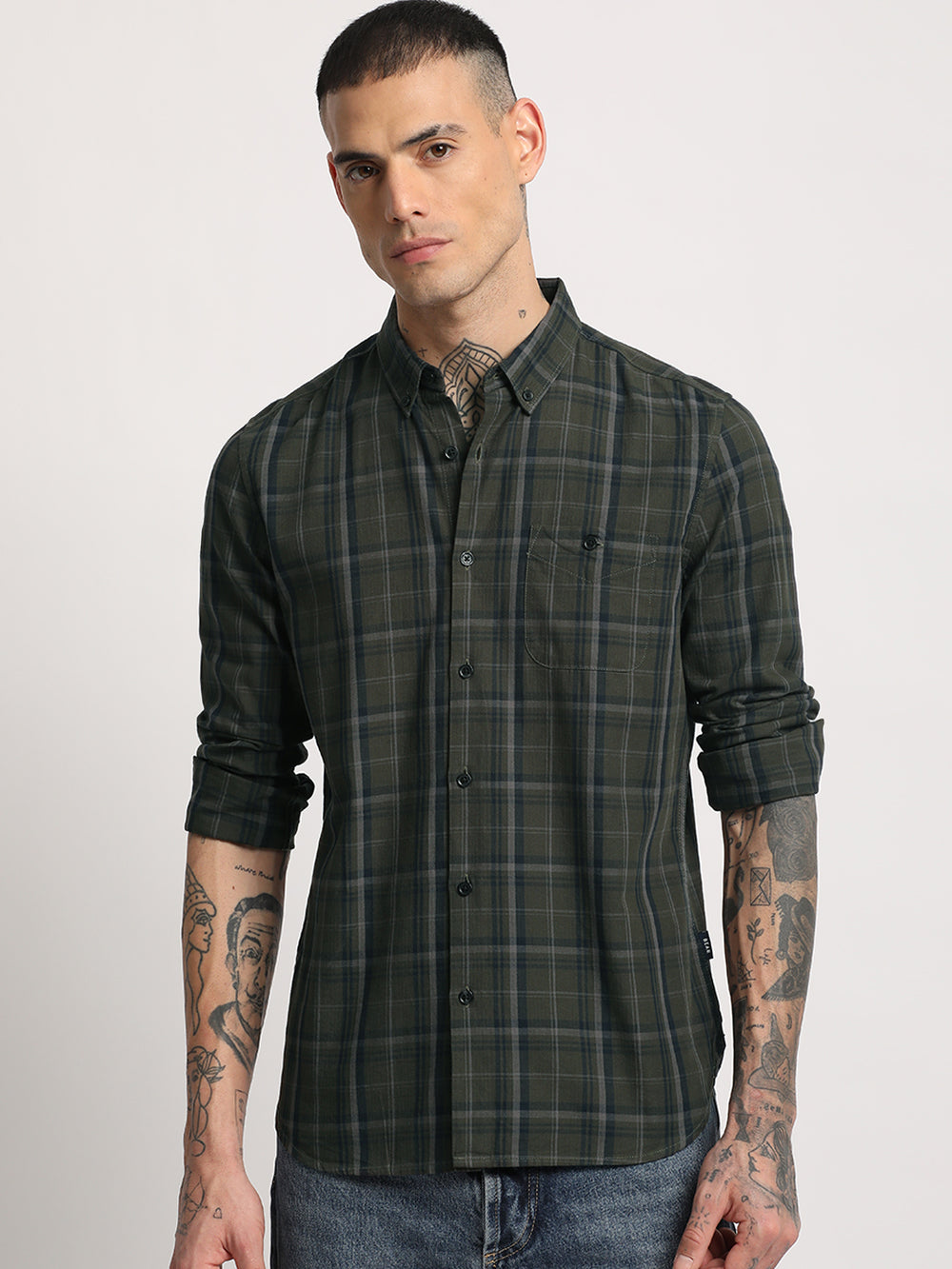 Men Green Checked Slim Fit Cotton Casual Shirt