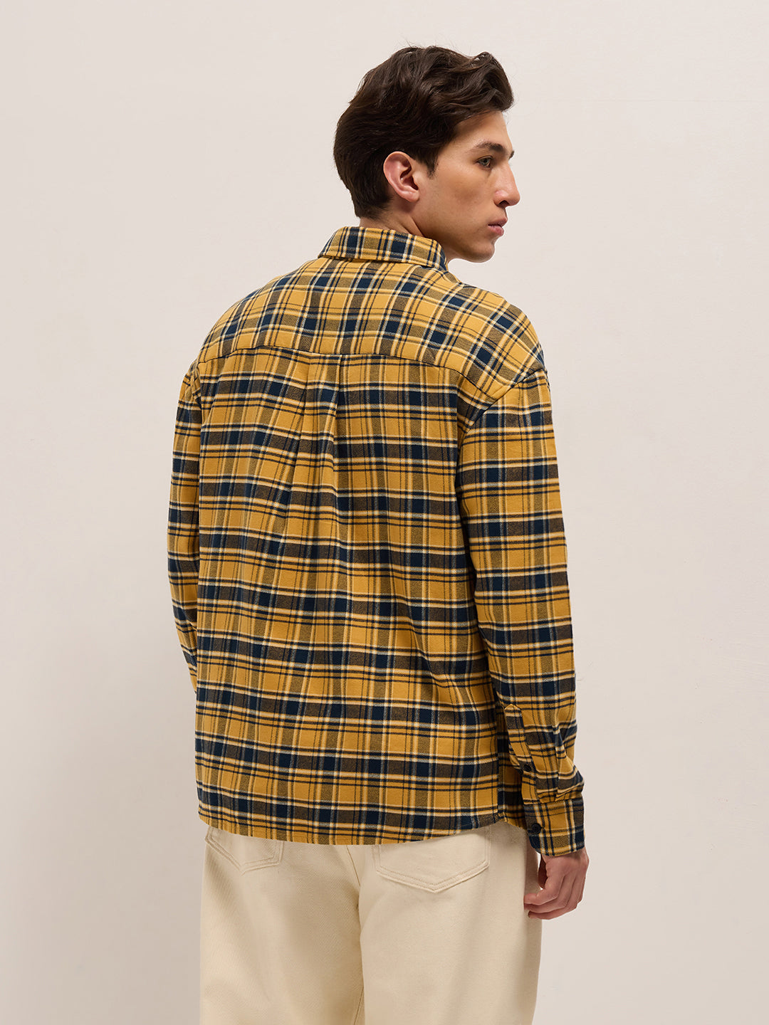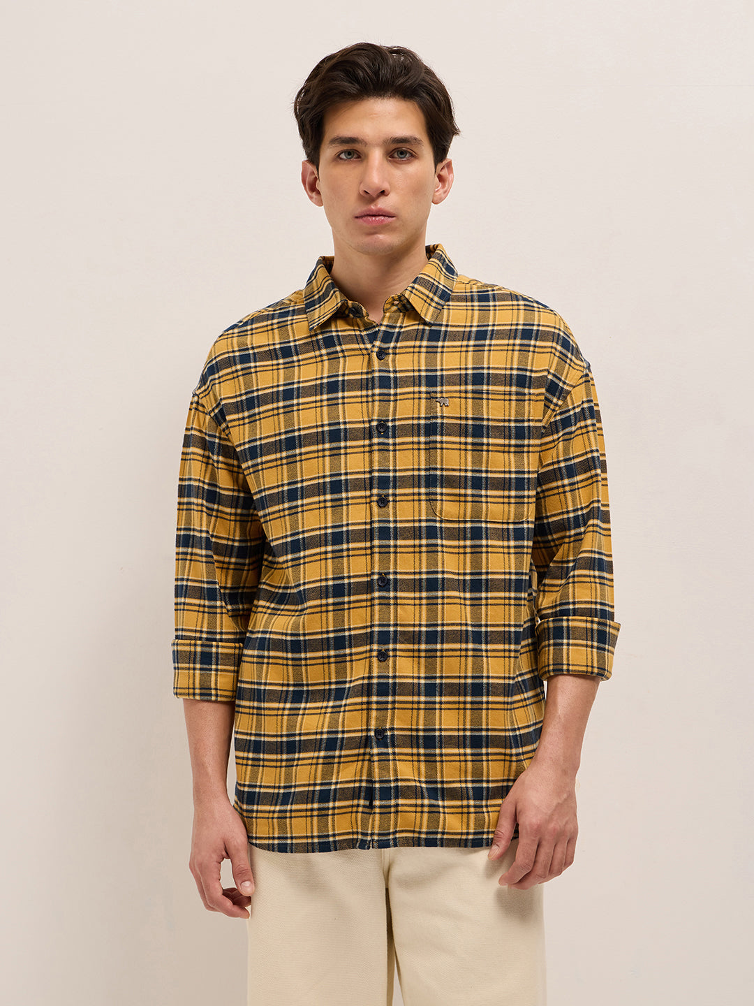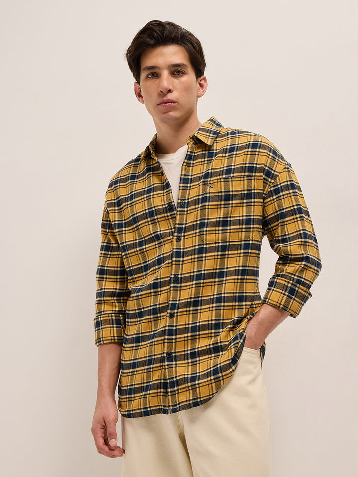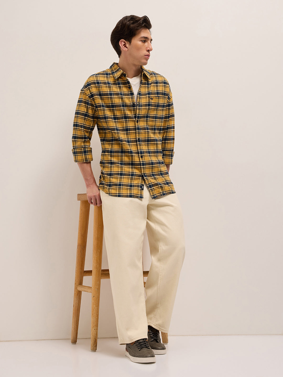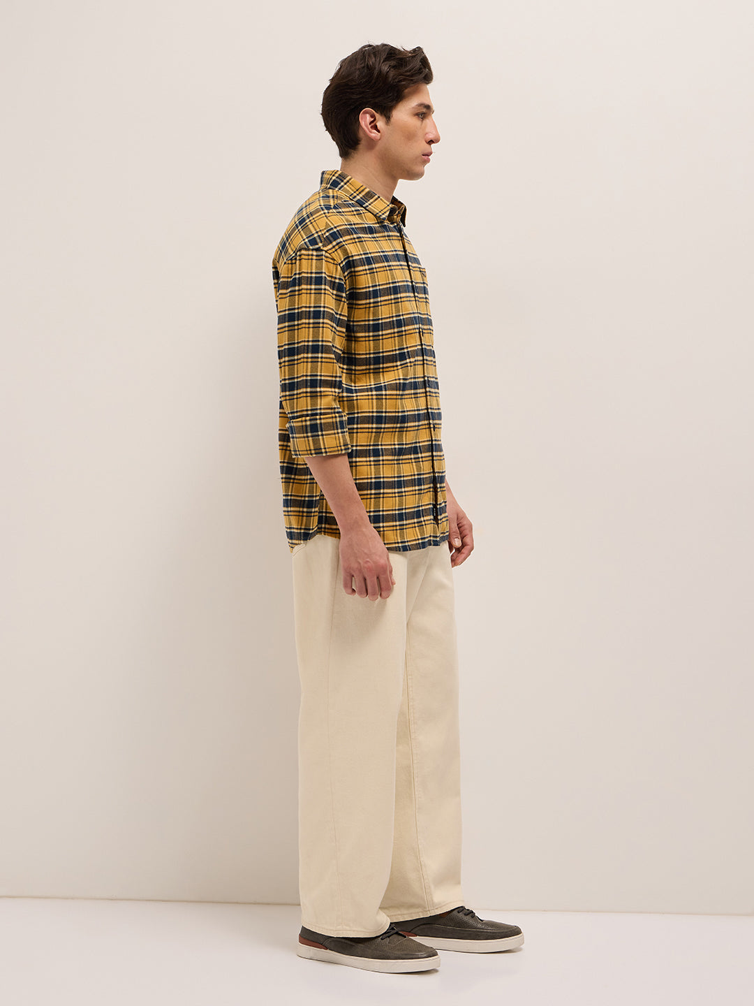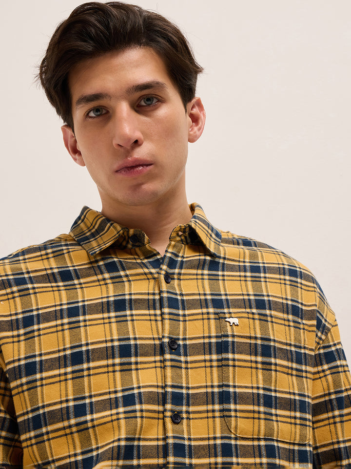 Yellow with Teal Checked Cotton Relaxed Fit Casual Shirt