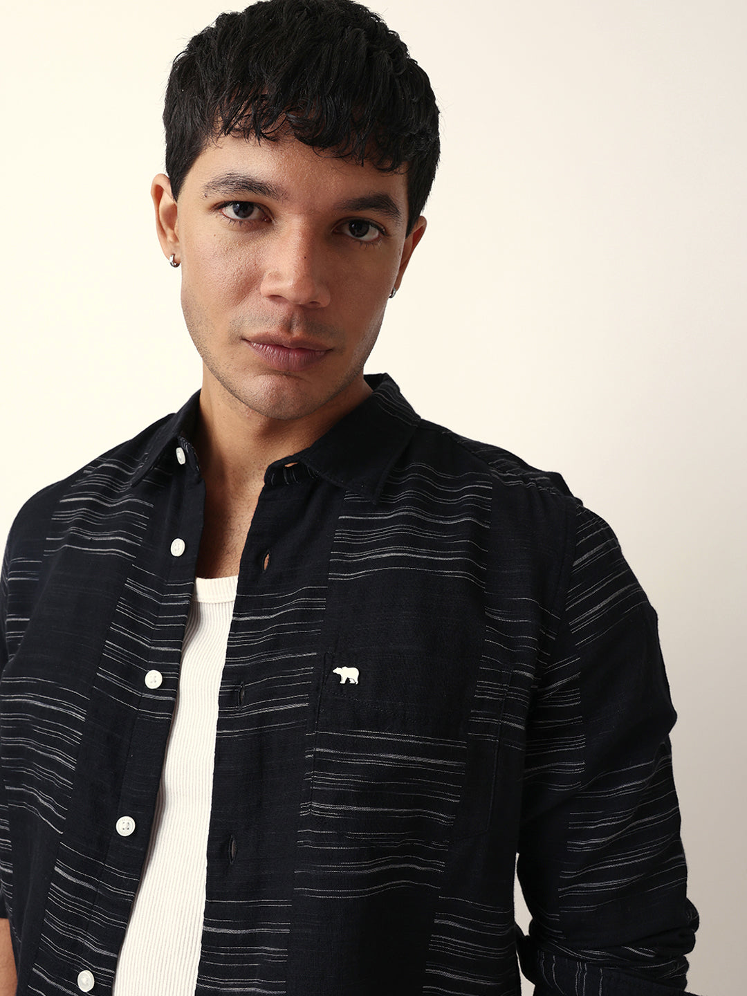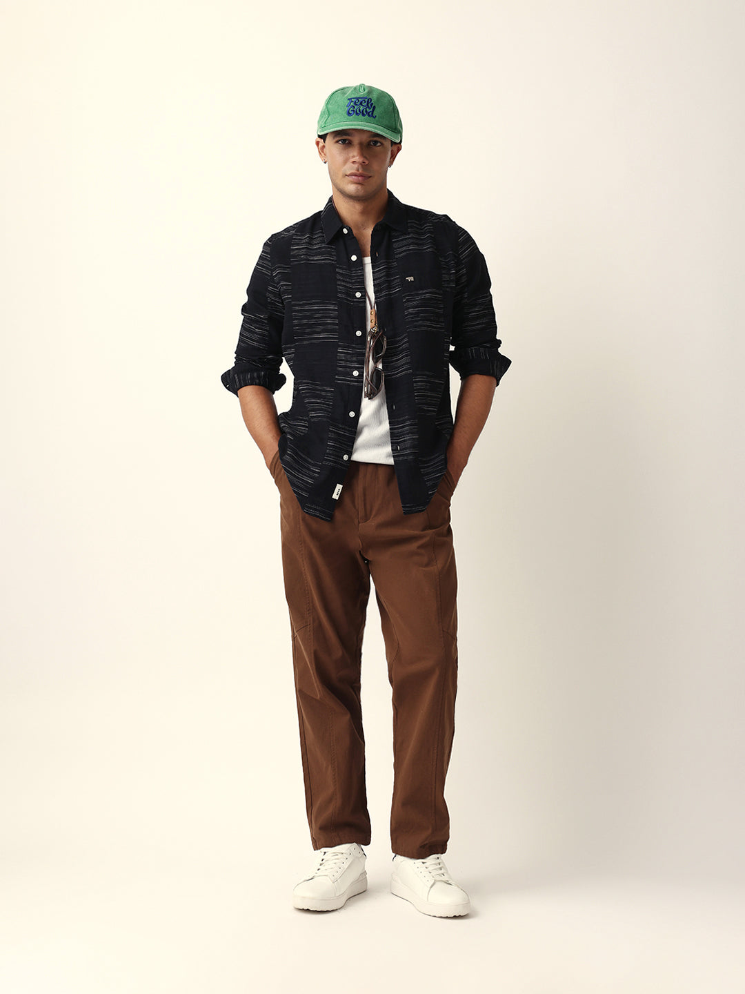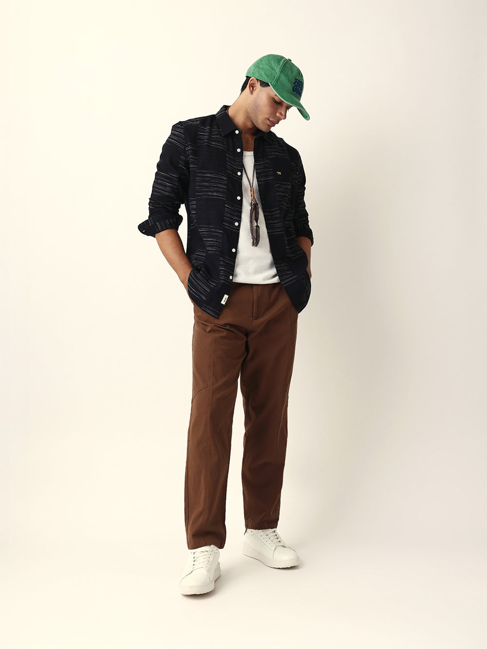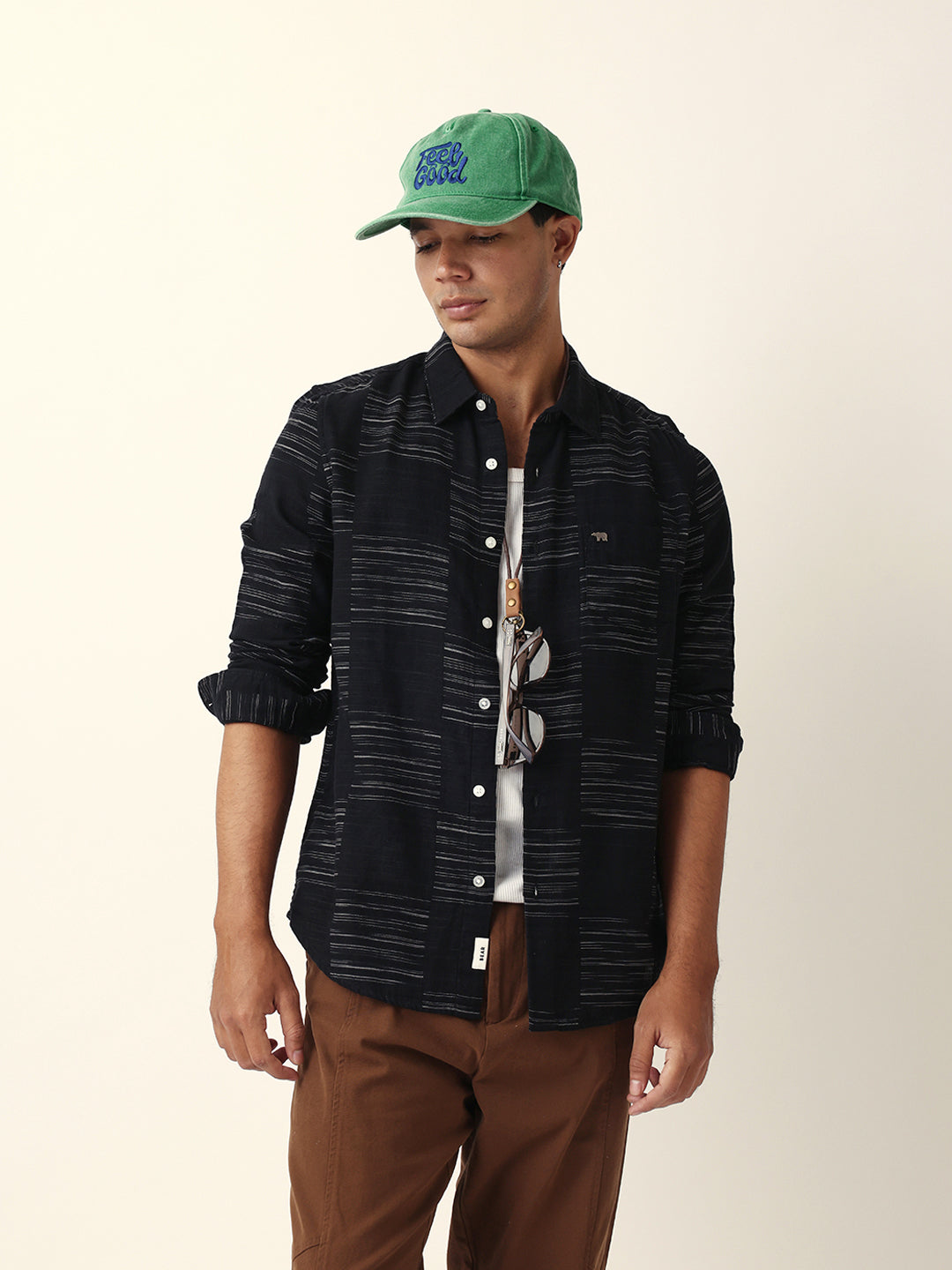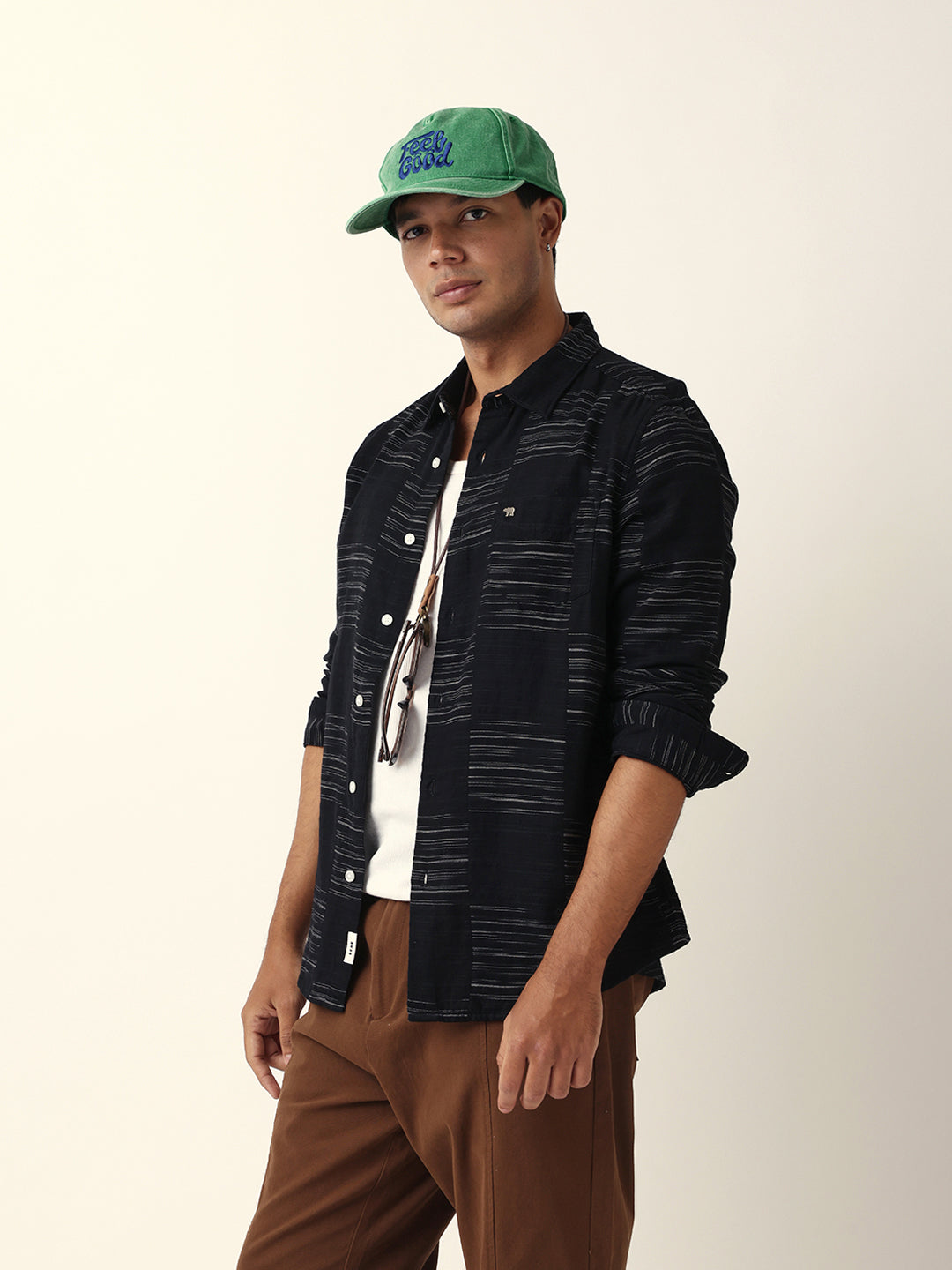 Shop Black Woven Patch Block Check Slim Fit Casual Shirt Online.