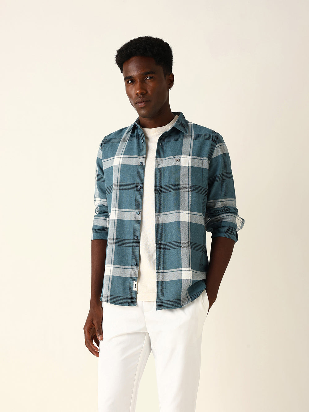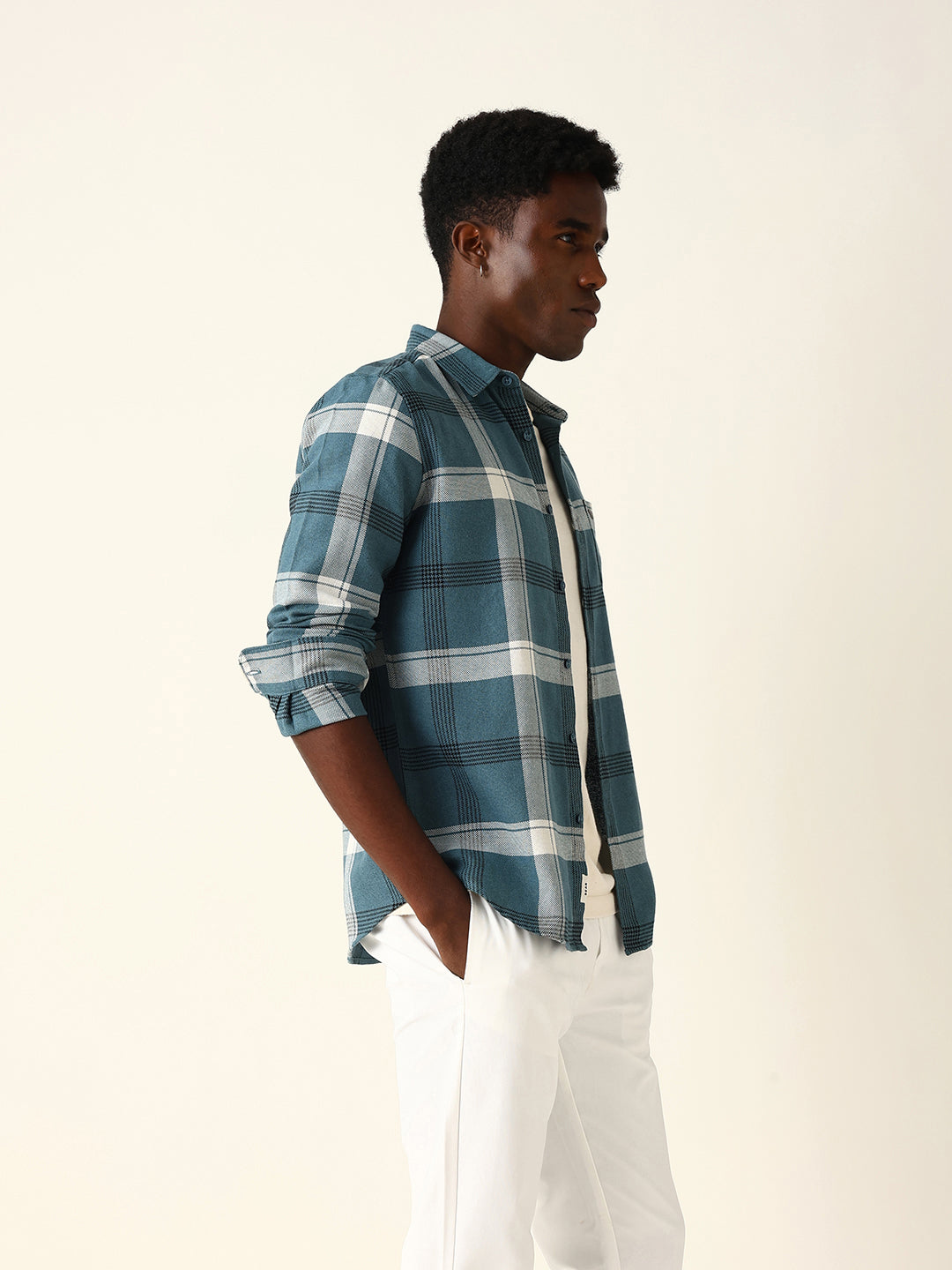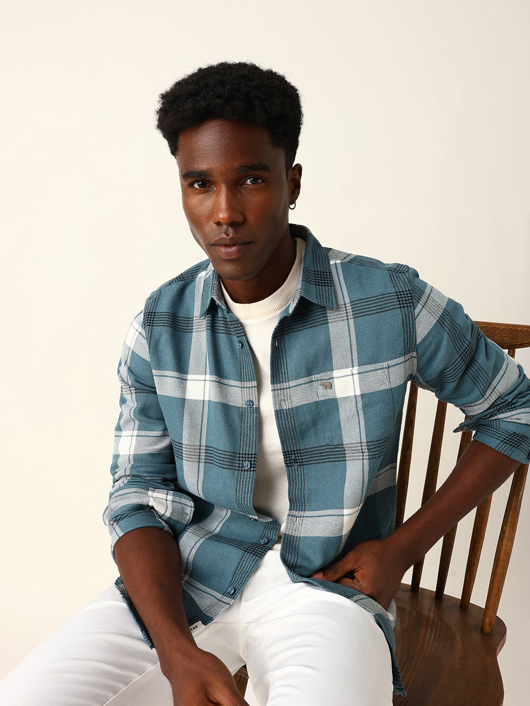 Shop Blue Woven Check Slim Fit Casual Shirt Online.