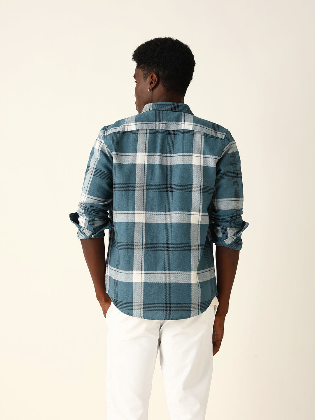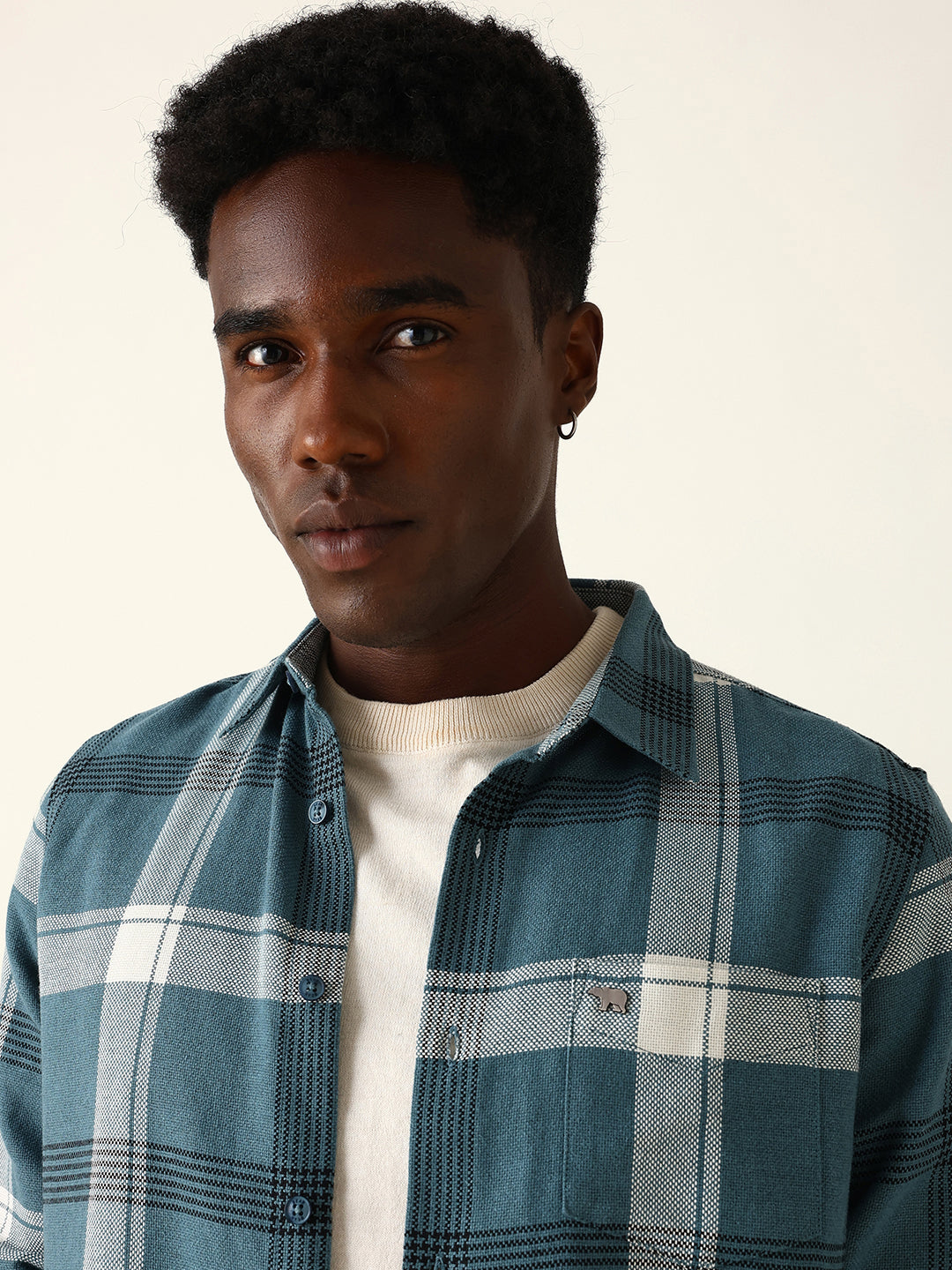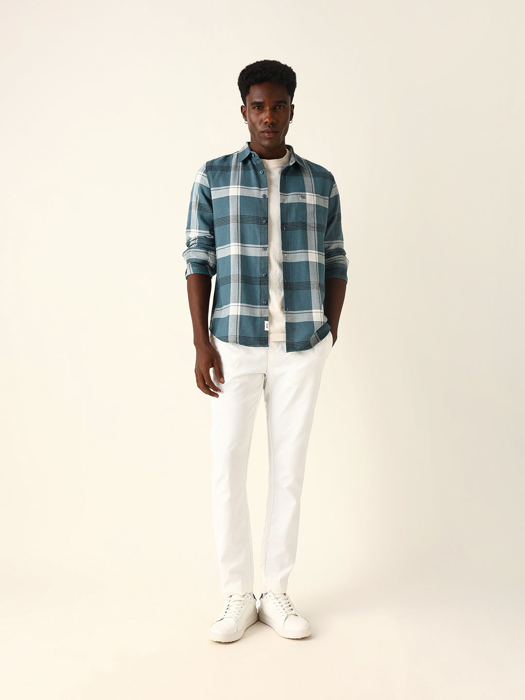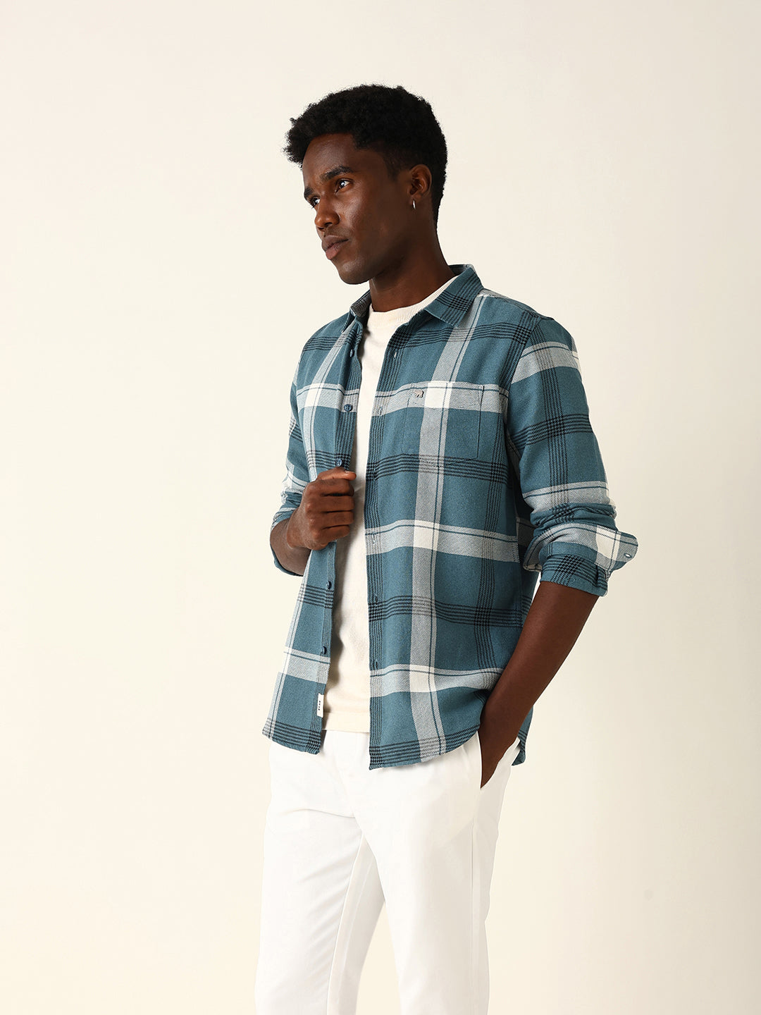 Shop Blue Woven Check Slim Fit Casual Shirt Online.