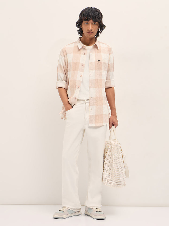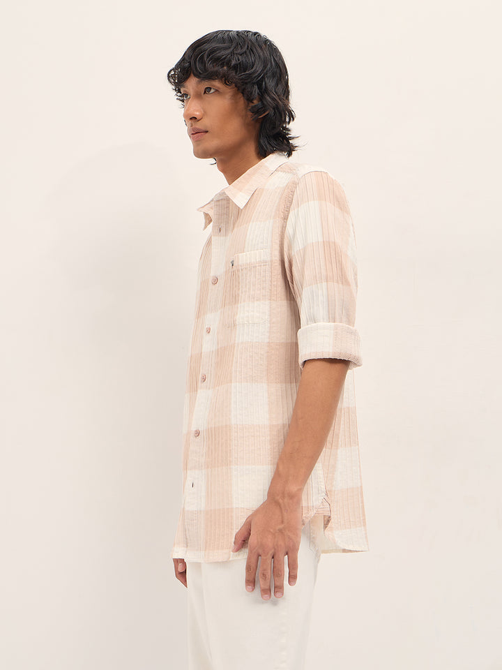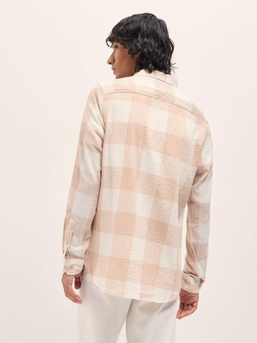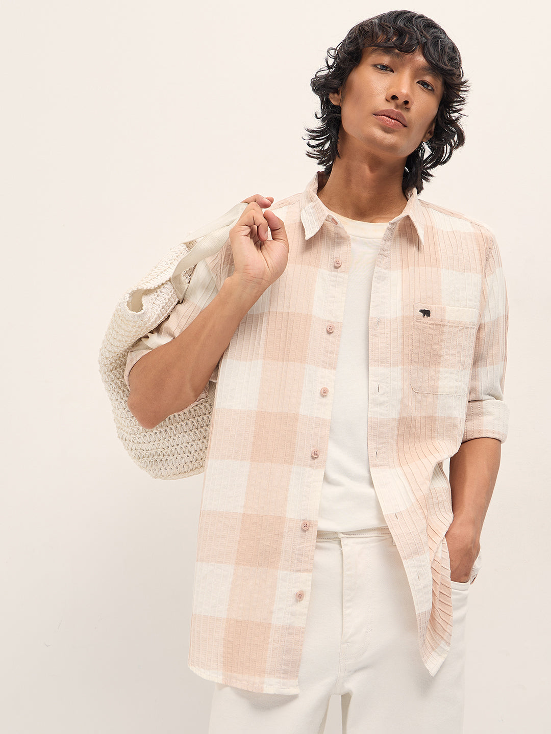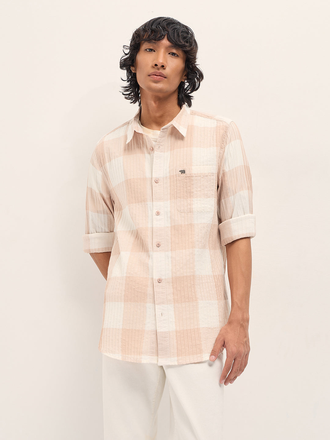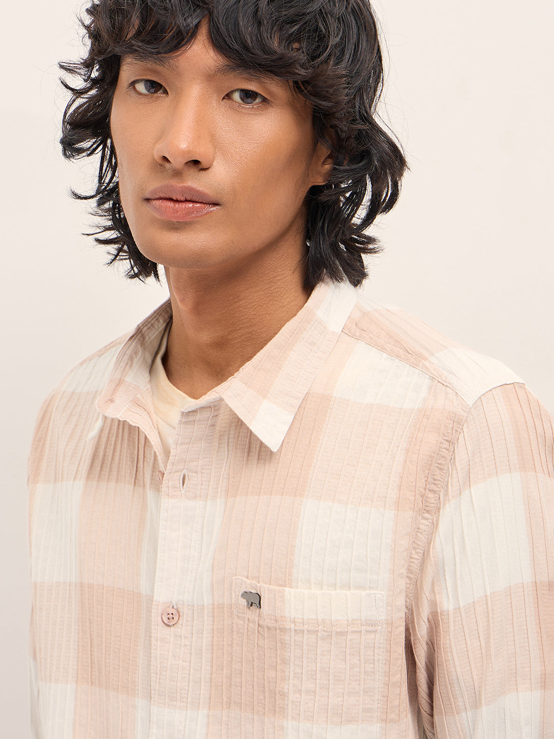 Peach Slim Fit Casual Shirt with Textured Stripe and Block Check Design
