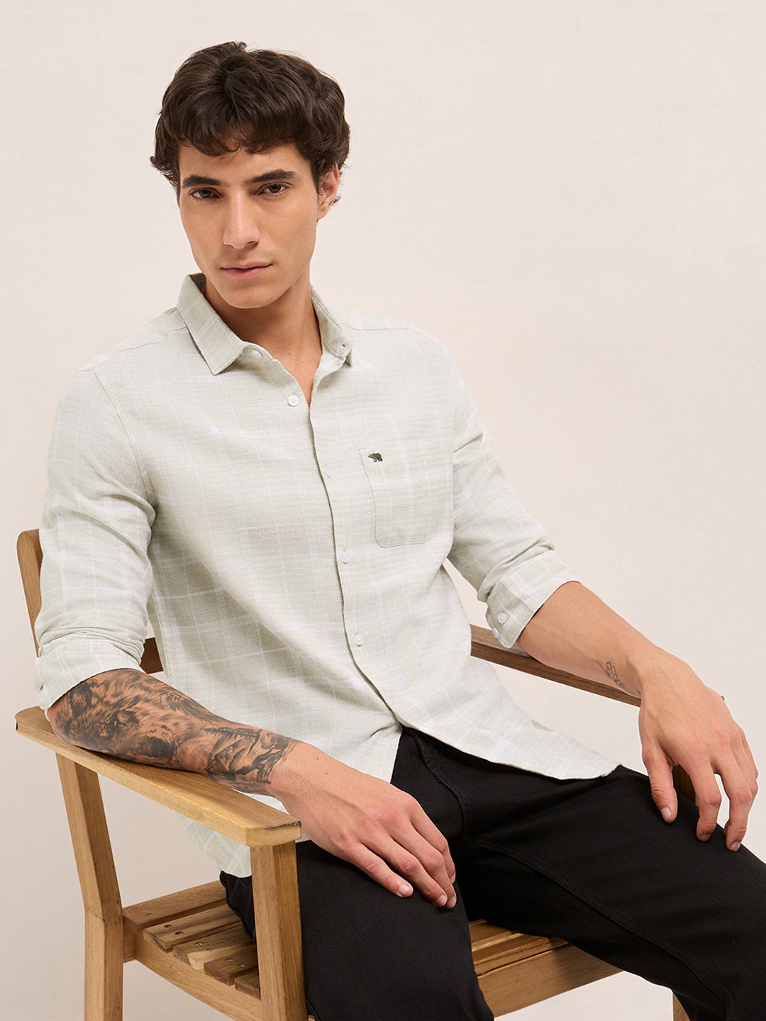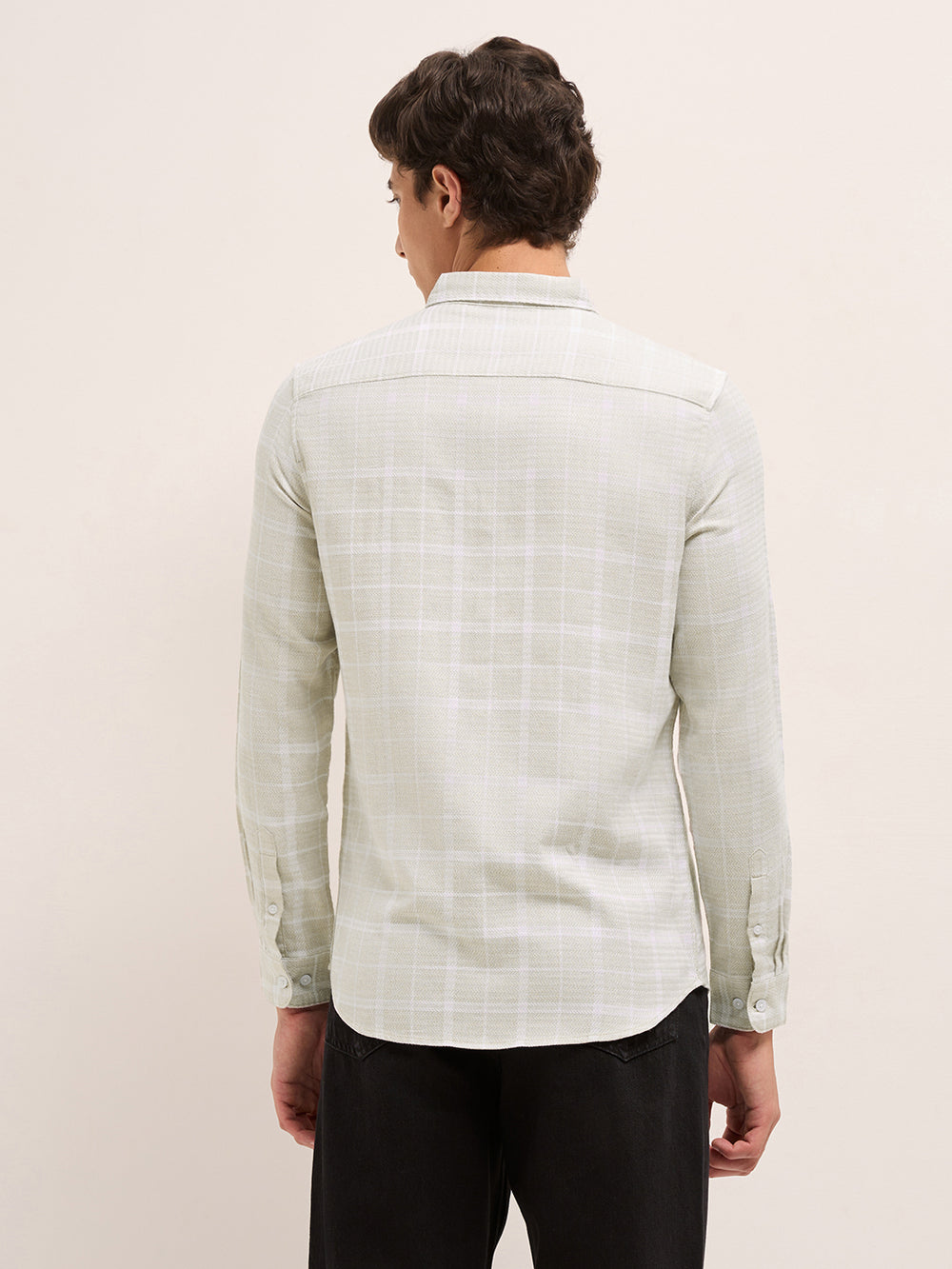 Shop Cream Herringbone Check Slim Fit Casual Shirt Online.
