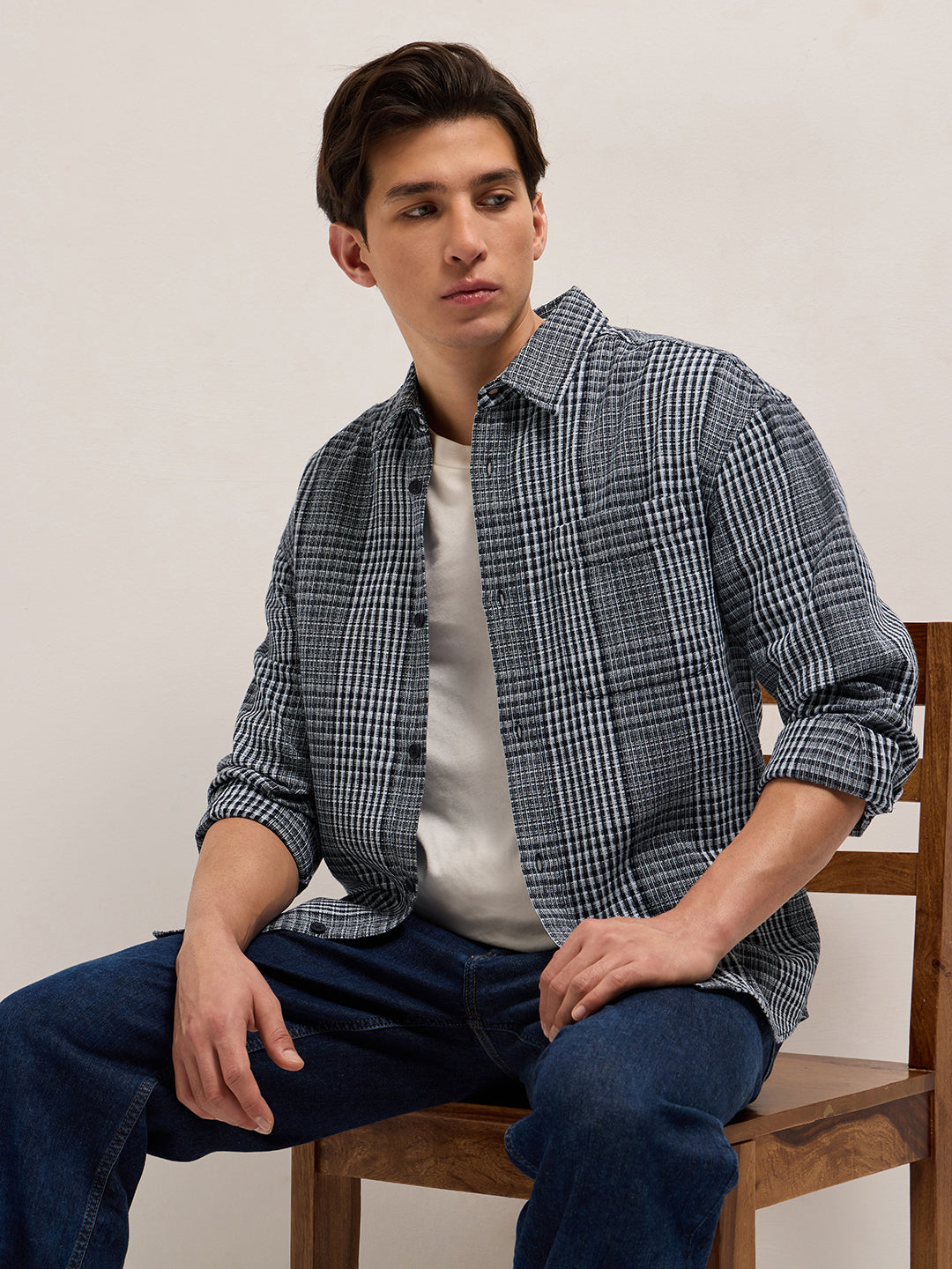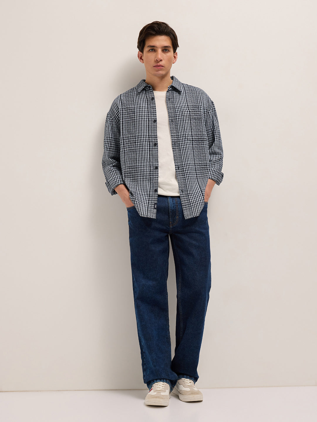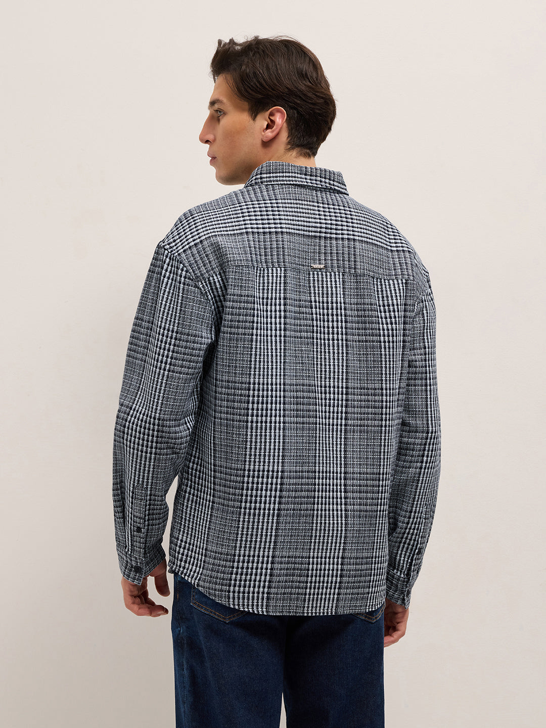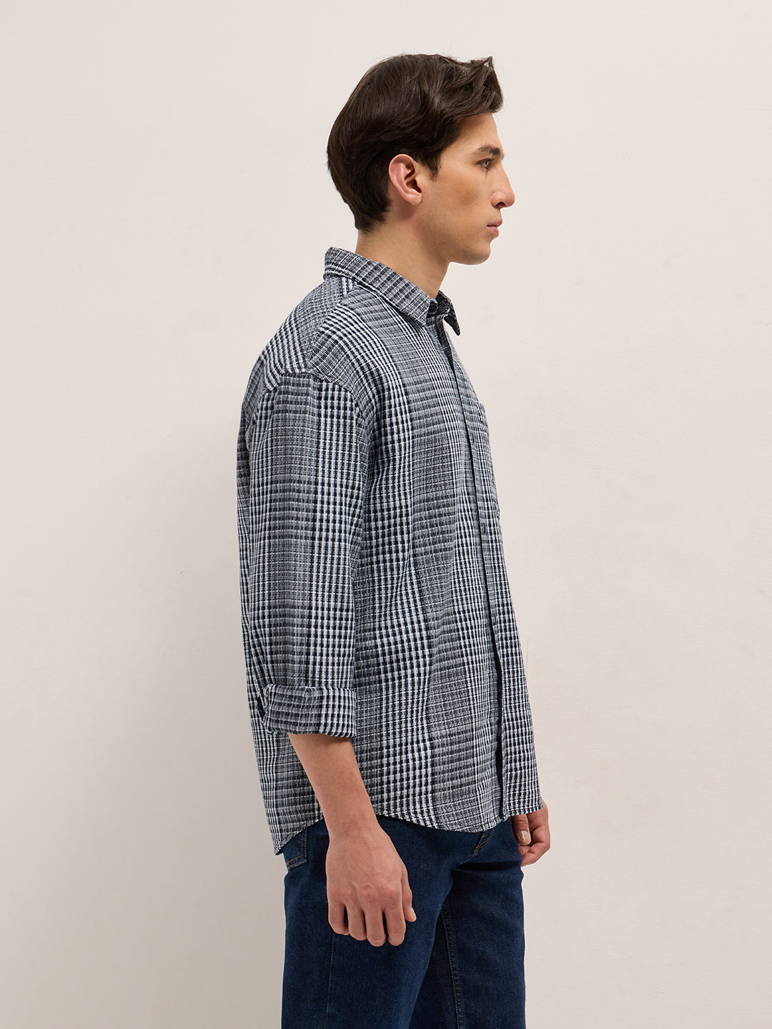 Blue and White Woven Plaid Checks Relaxed Fit Long Sleeve Shirt