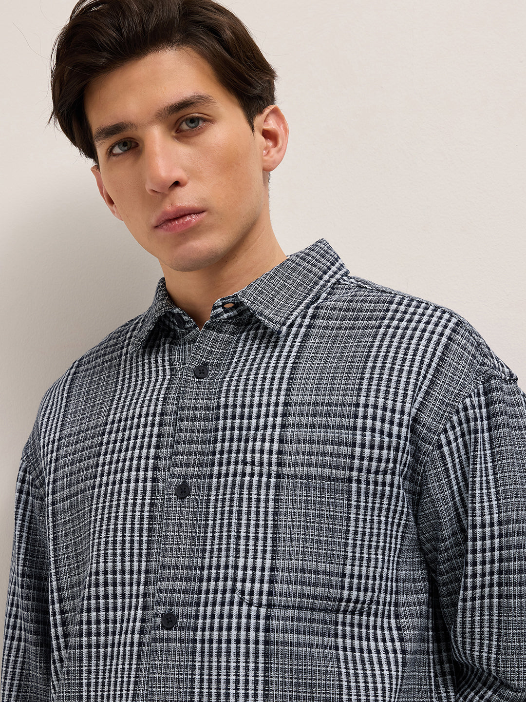 Shop Blue and White Woven Plaid Checks Relaxed Fit Long Sleeve Shirt Online.