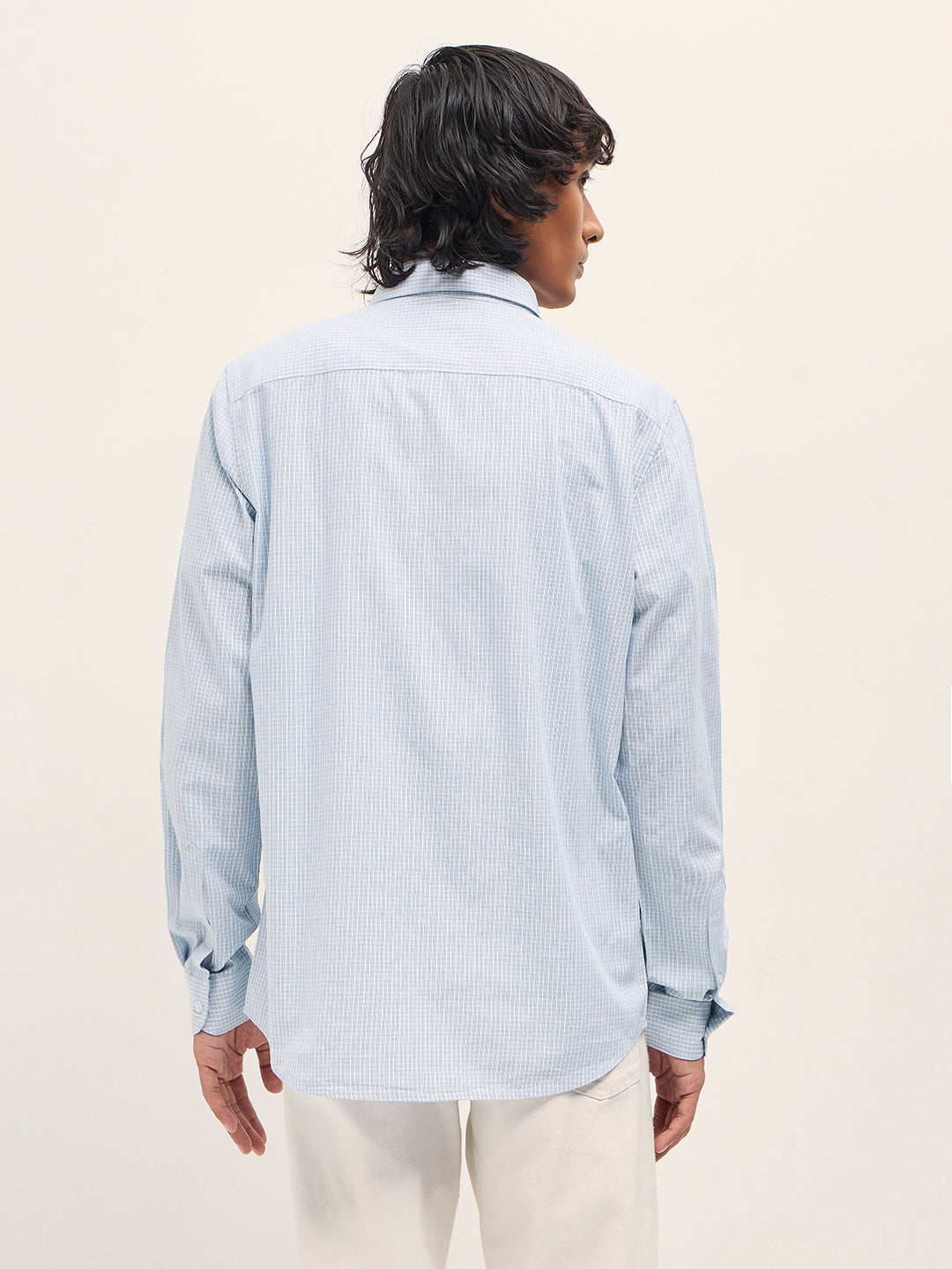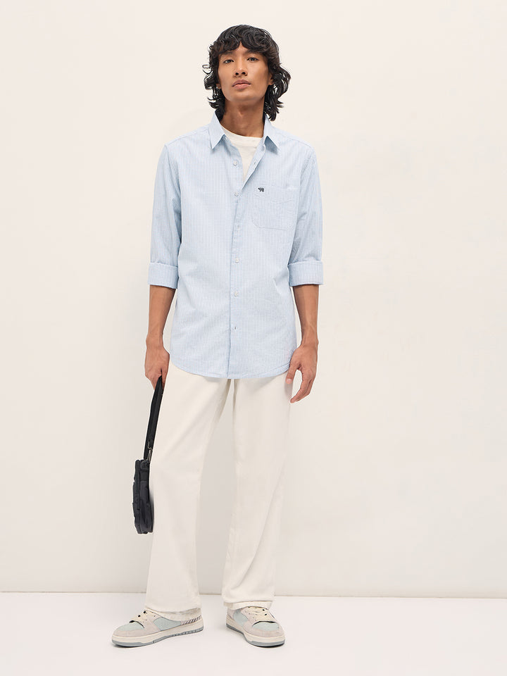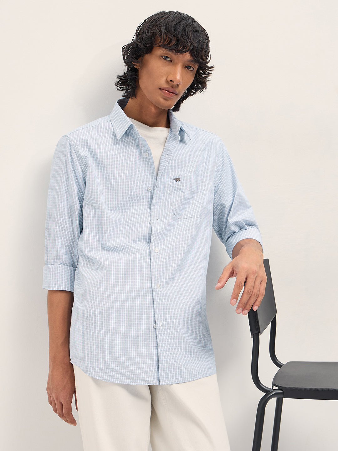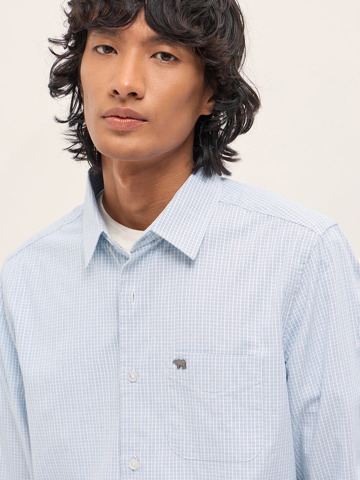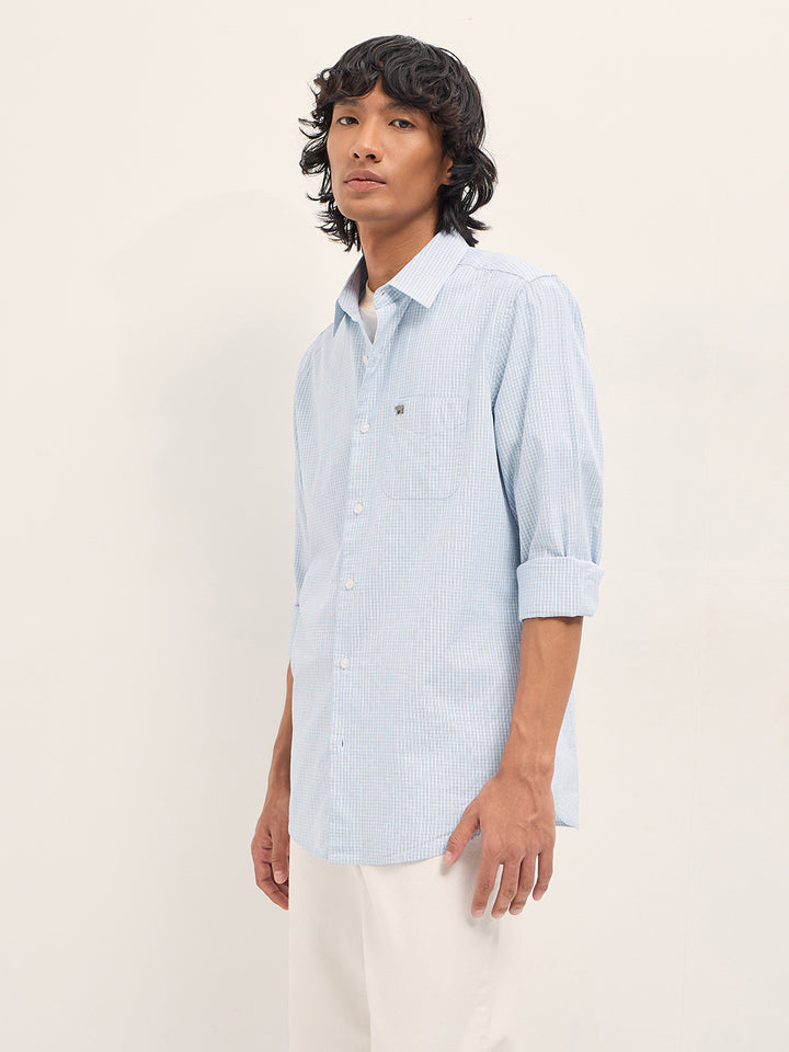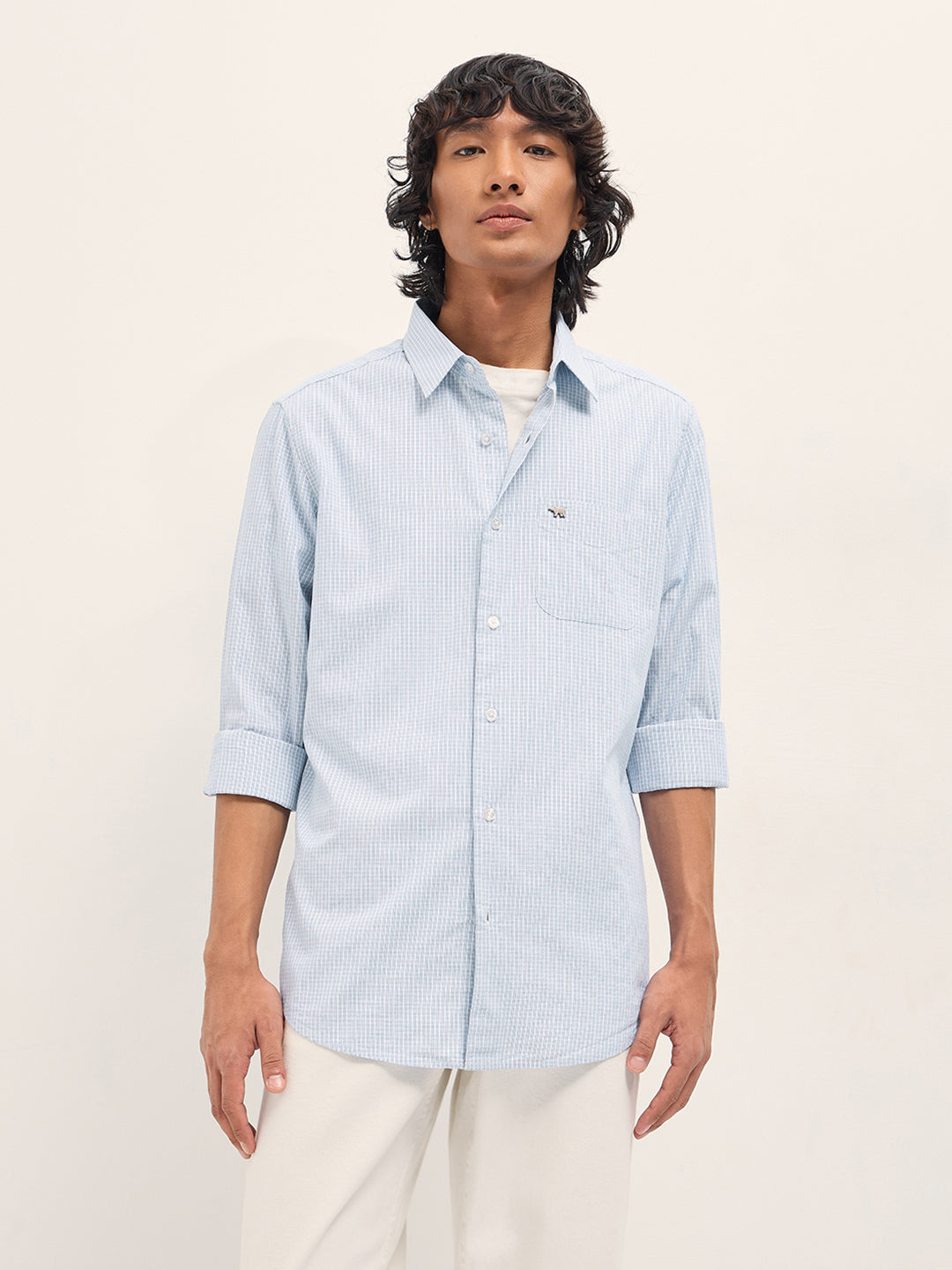 Light Blue Woven Checked Slim Fit Casual Shirt