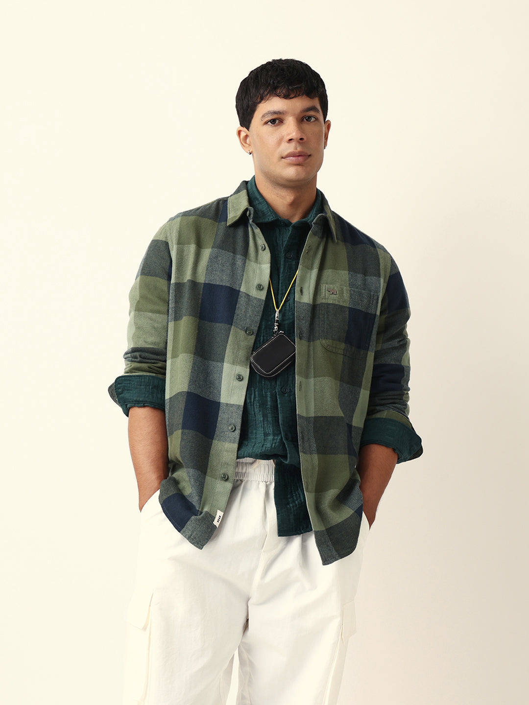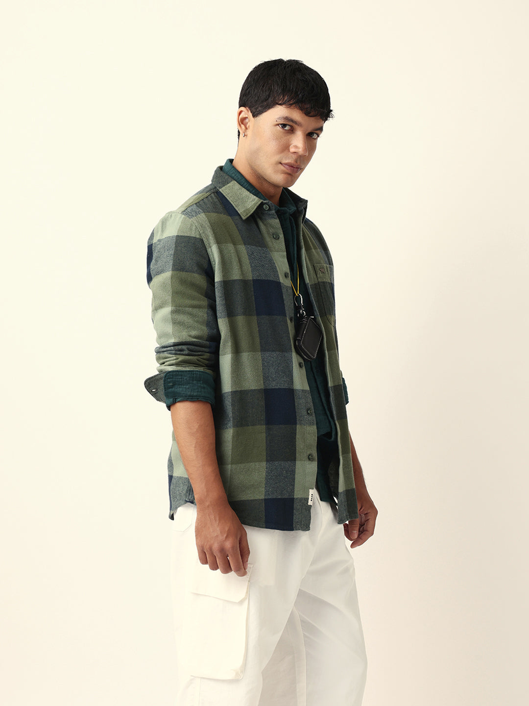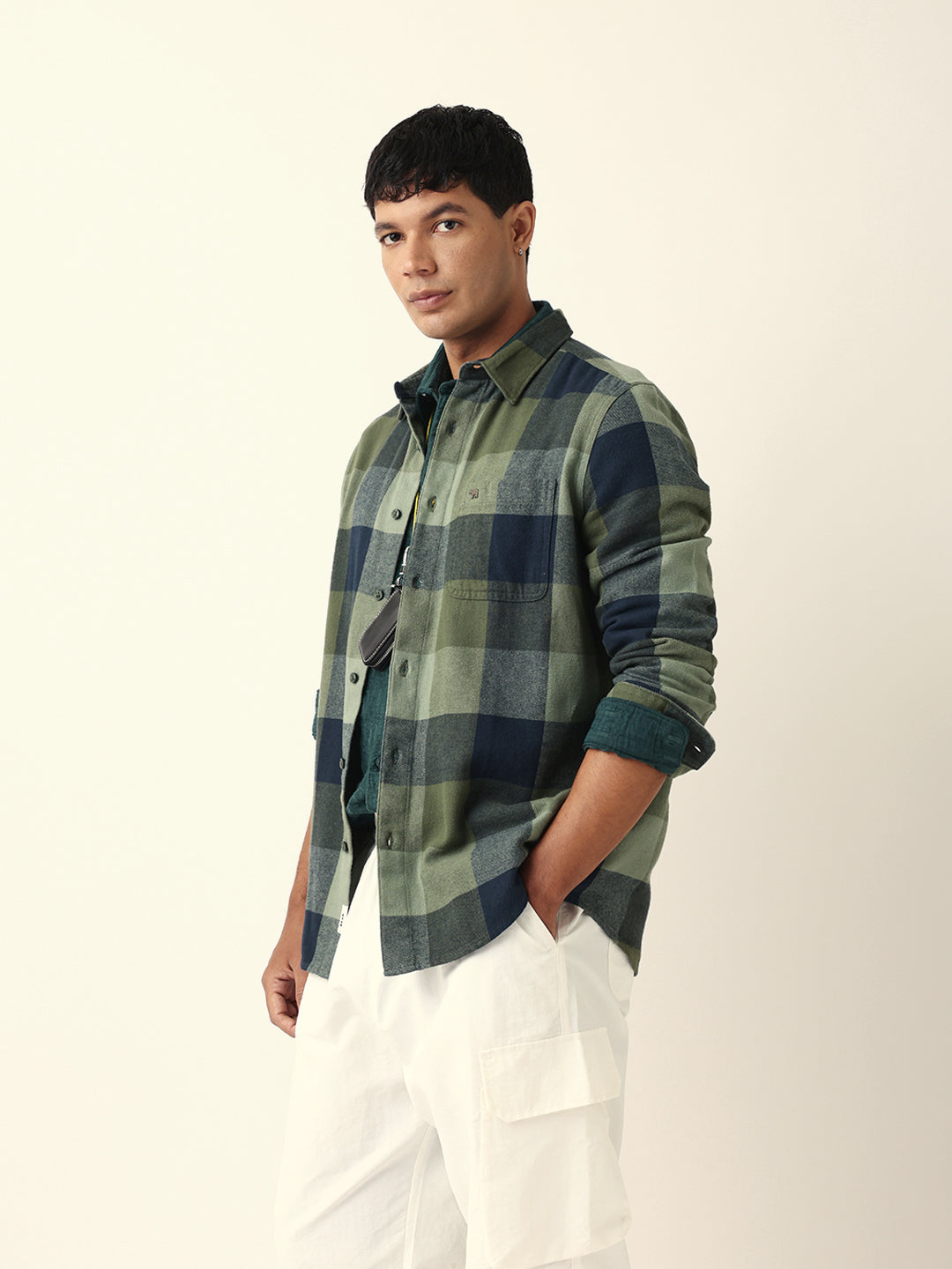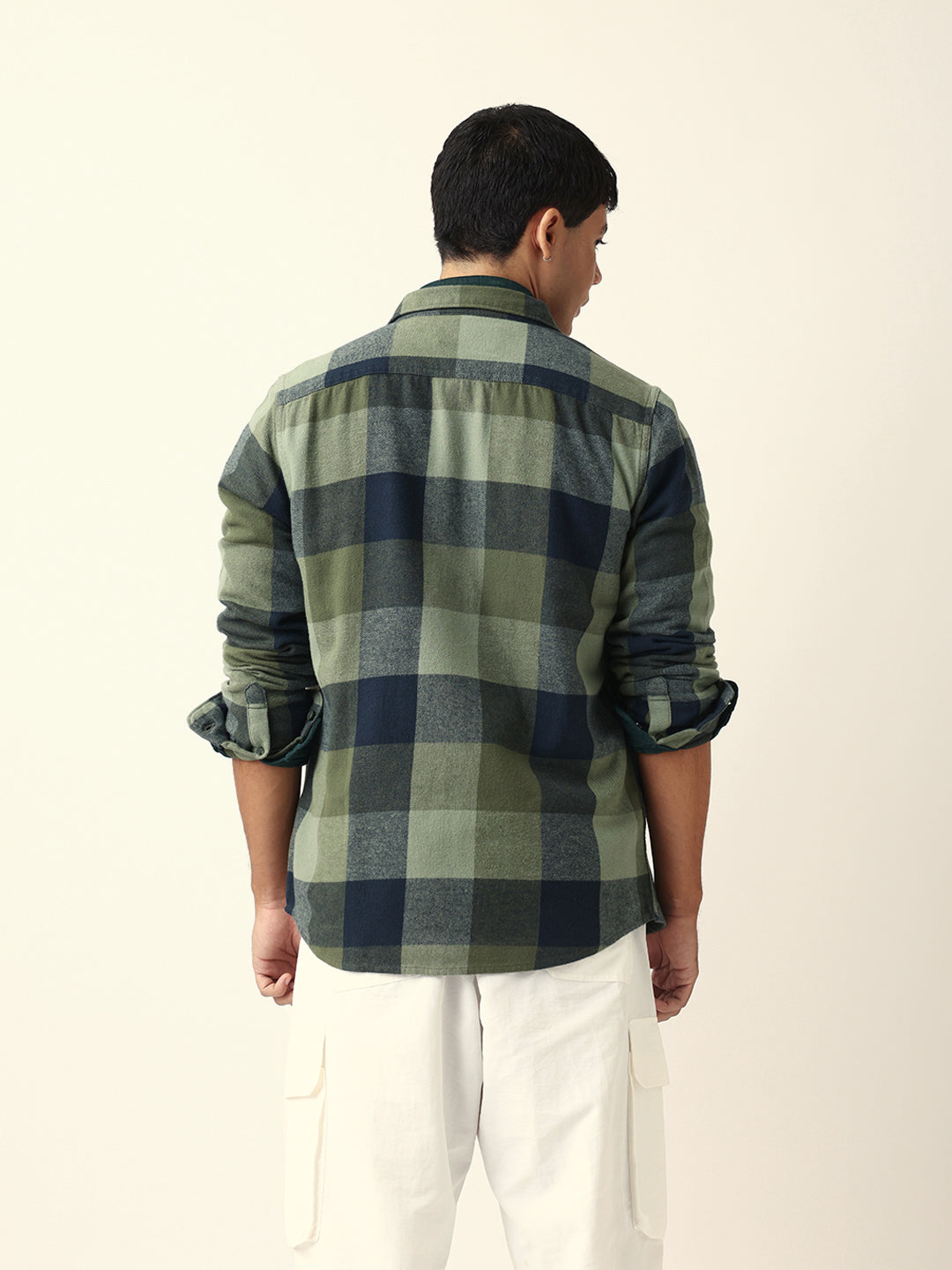 Shop Green with Navy Blue Flannel Checked Regular Fit Overshirt Online.