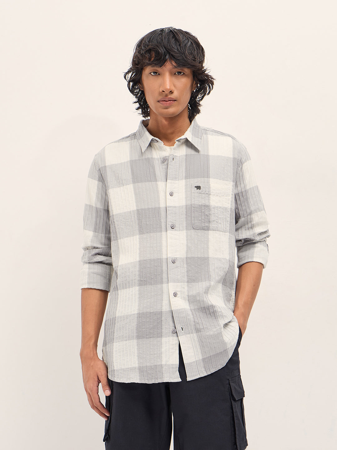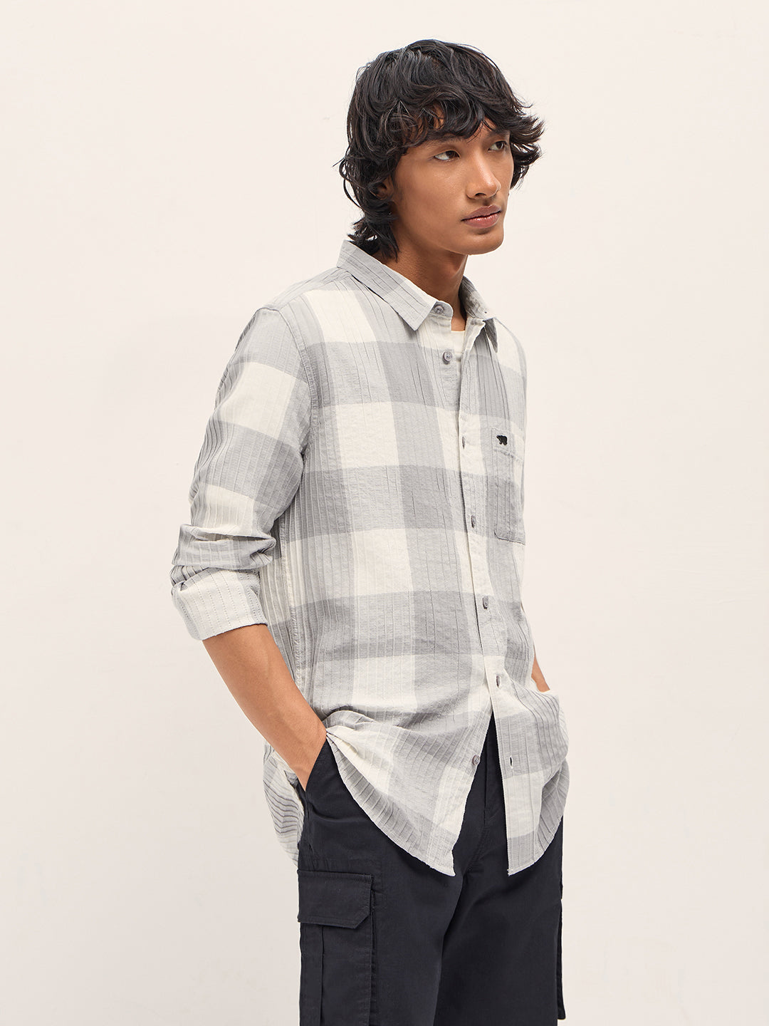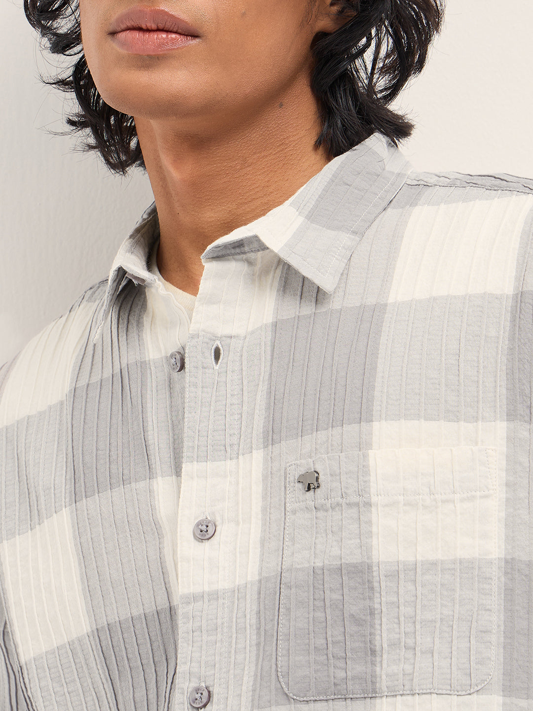 Grey Slim Fit Casual Shirt with Textured Stripe and Block Check Design