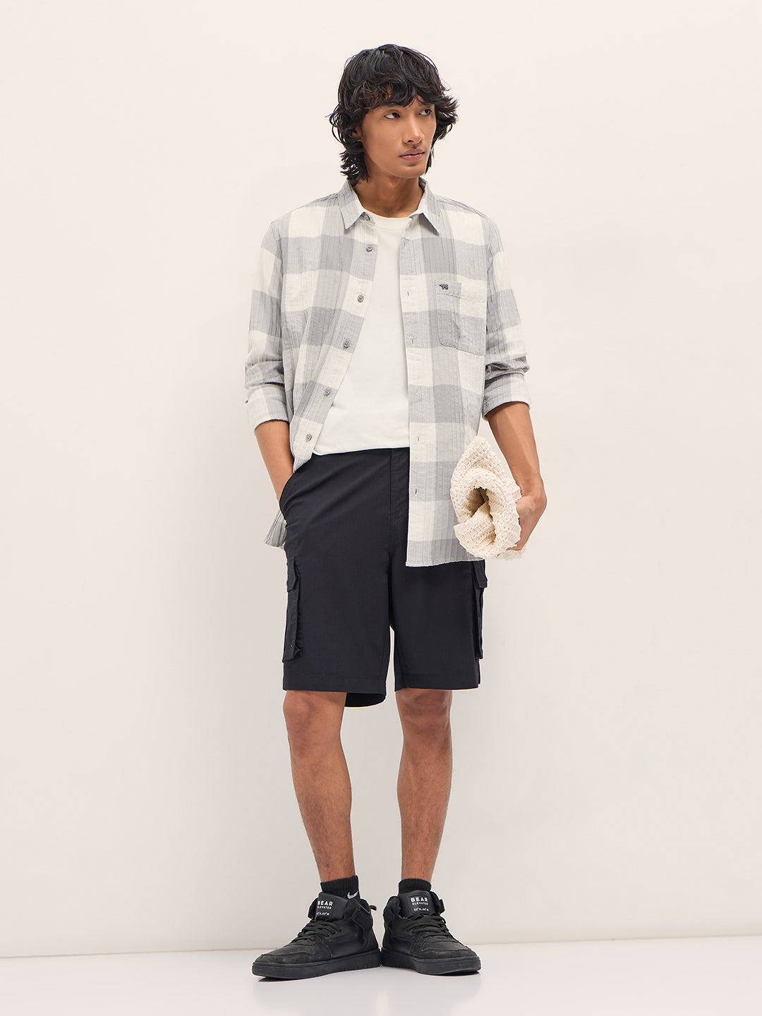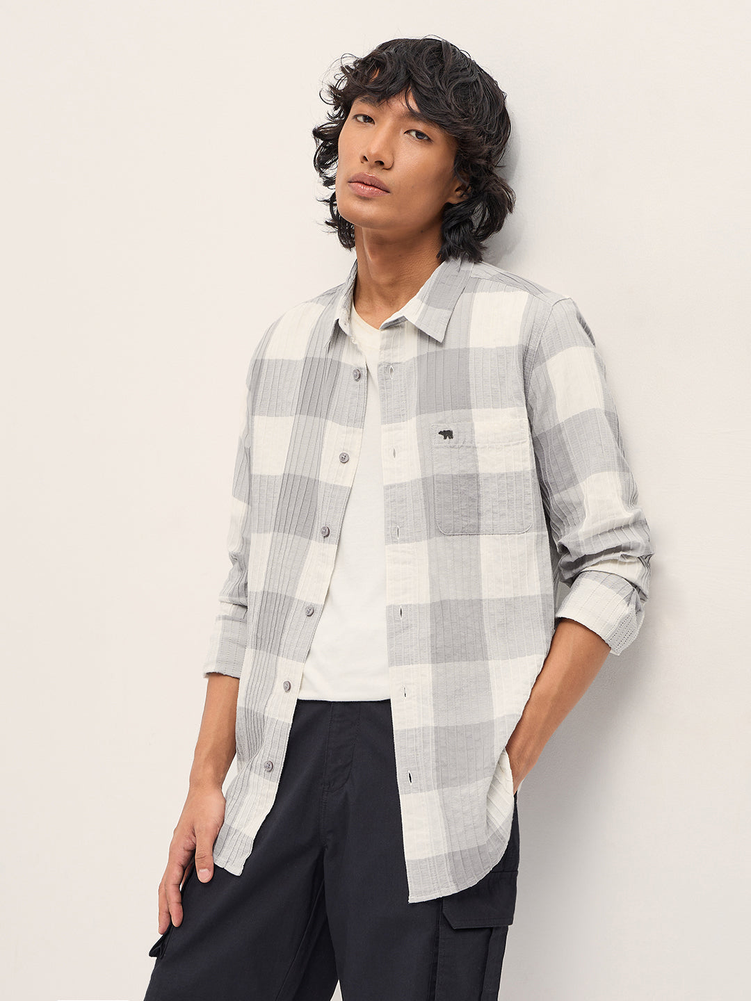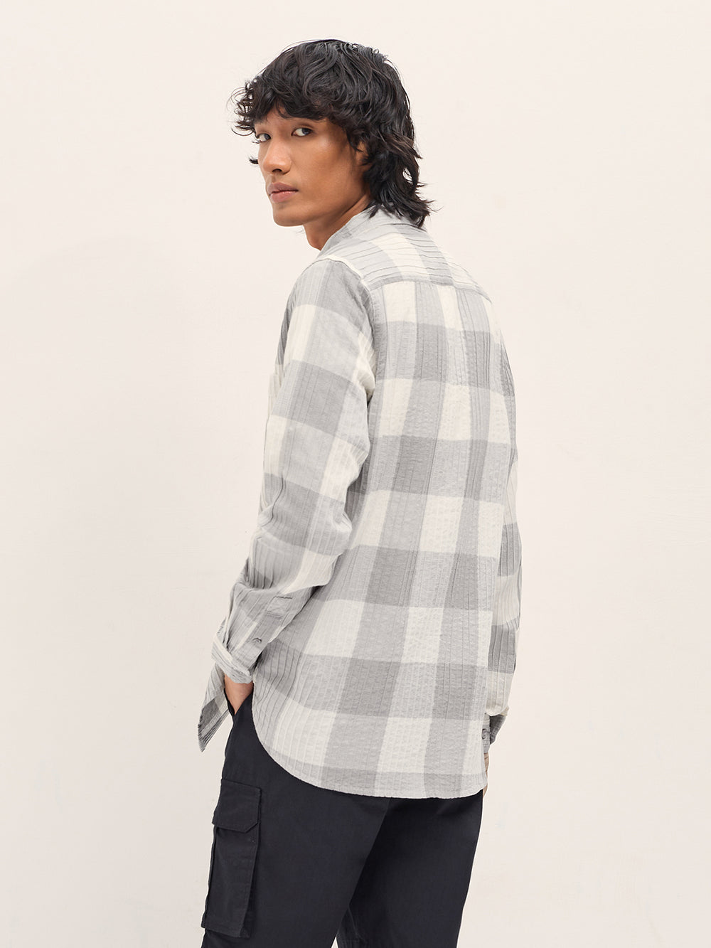 Grey Slim Fit Casual Shirt with Textured Stripe and Block Check Design
