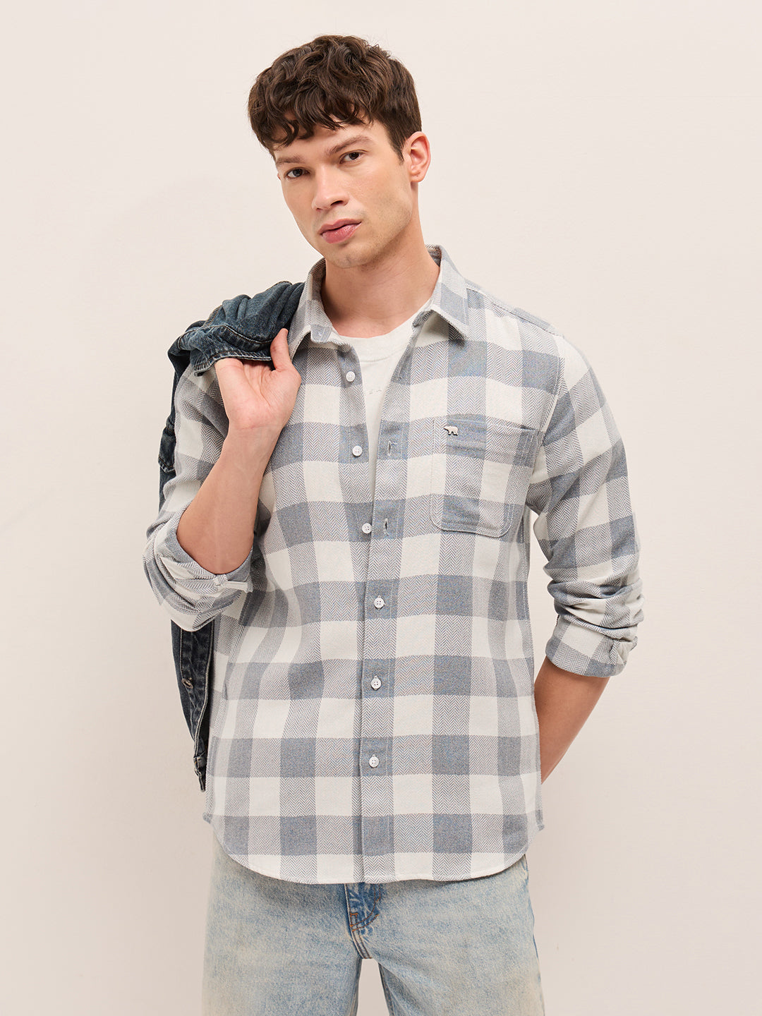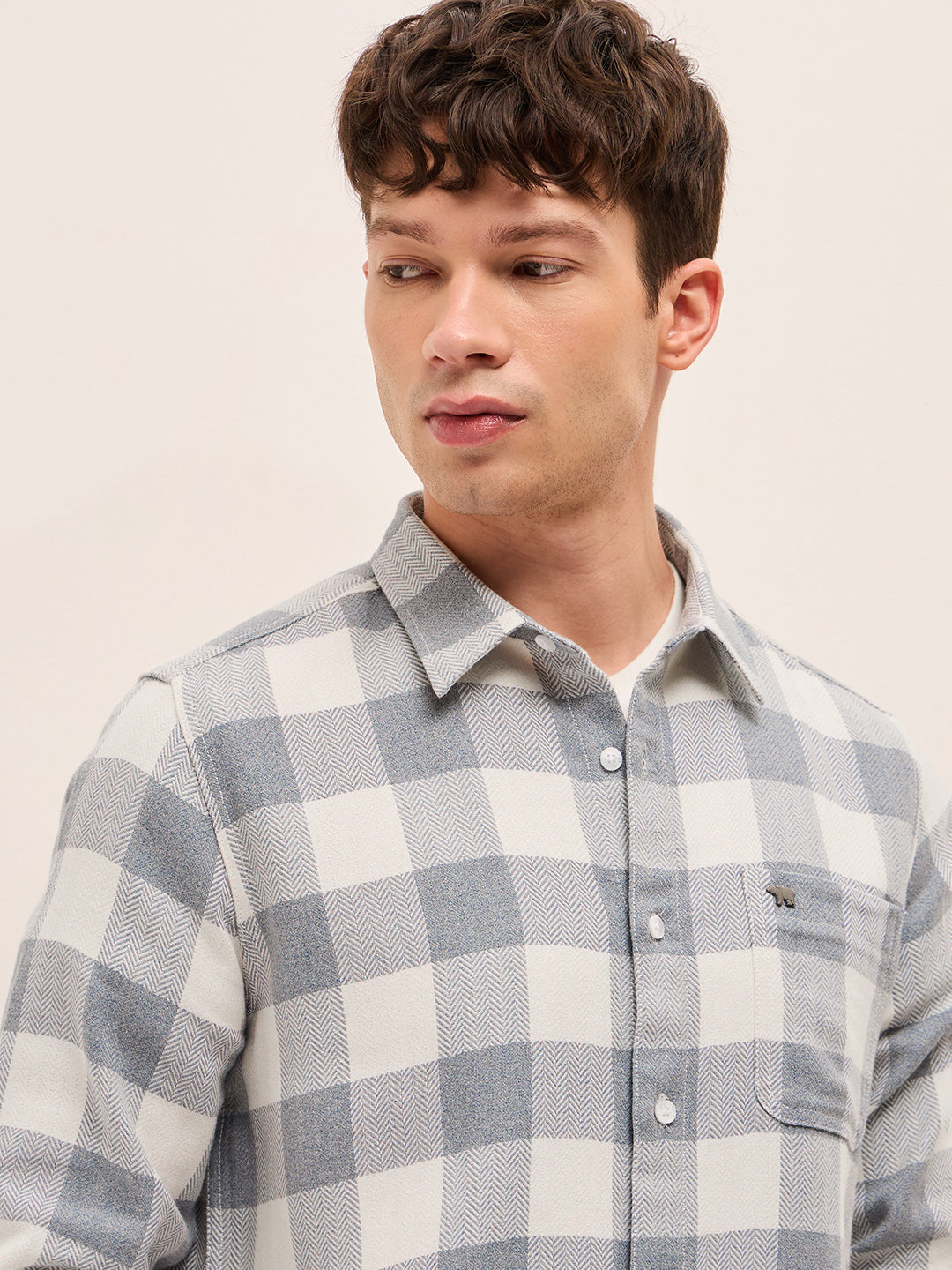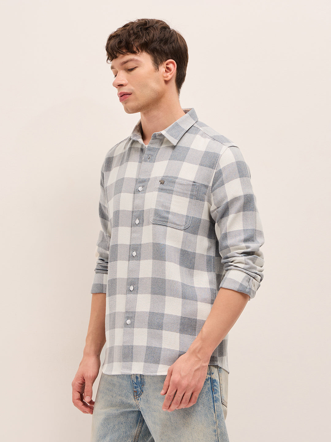 Shop Blue & White Herringbone Block Checks Regular Fit Casual Shirt Online.