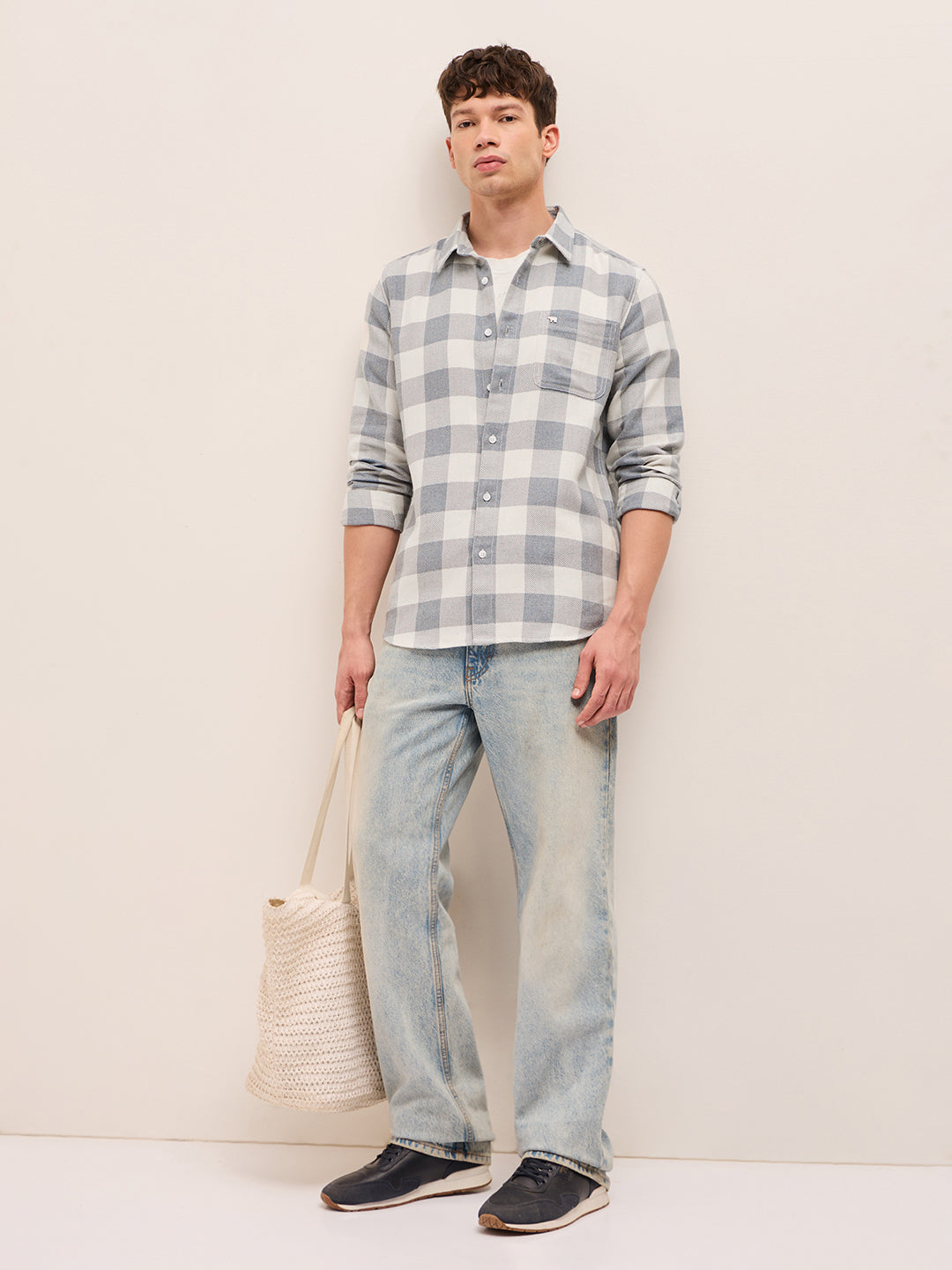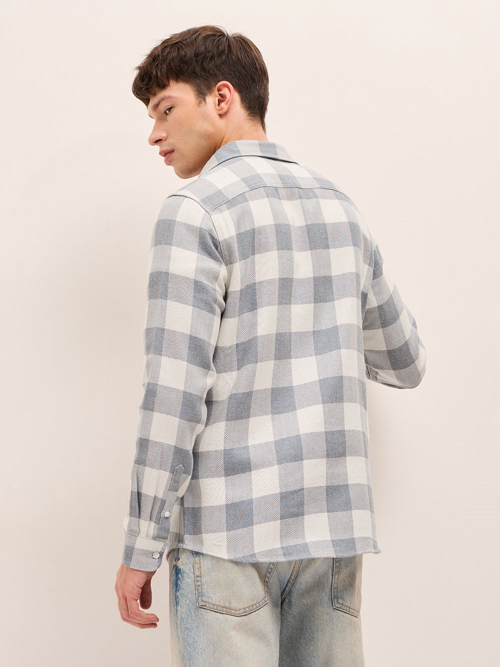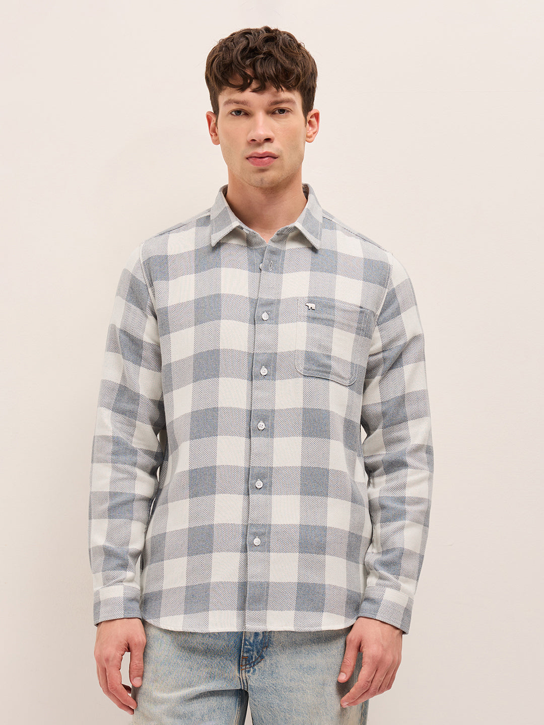 Shop Blue & White Herringbone Block Checks Regular Fit Casual Shirt Online.