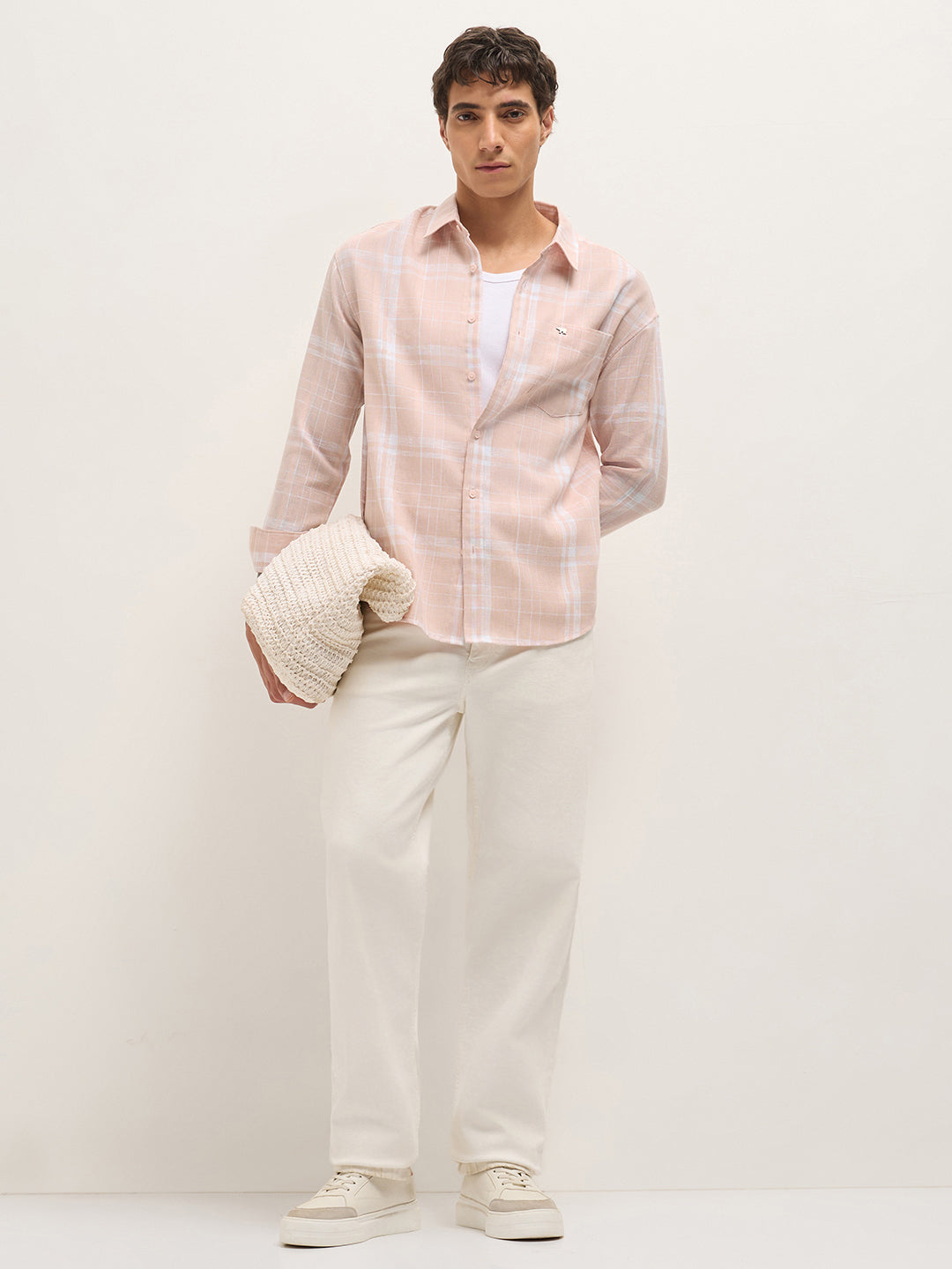 Shop Peach Woven Checks Relaxed Fit Casual Shirt Online.