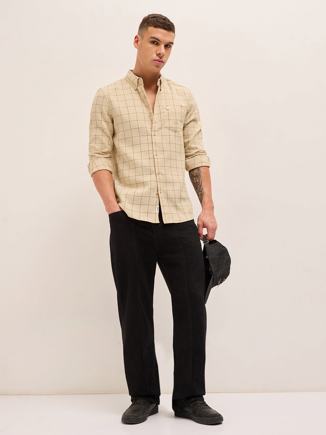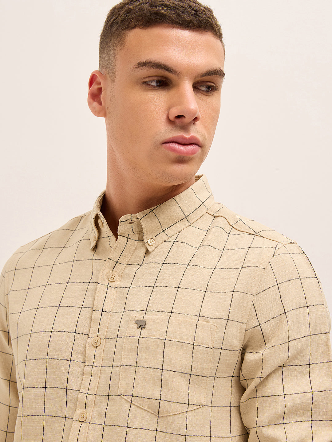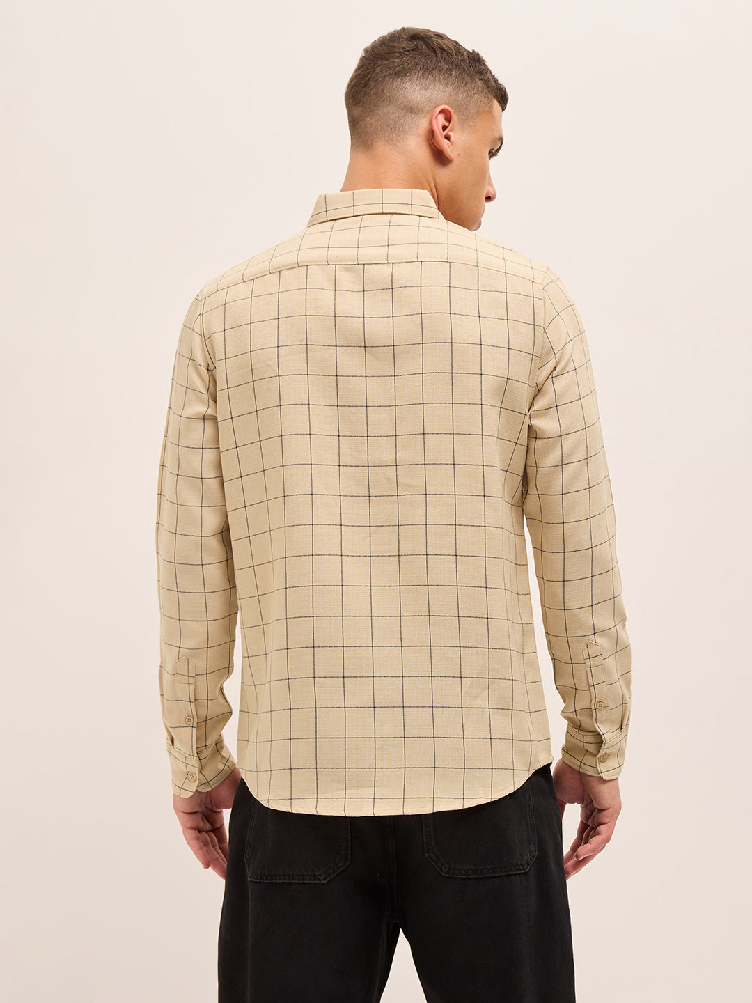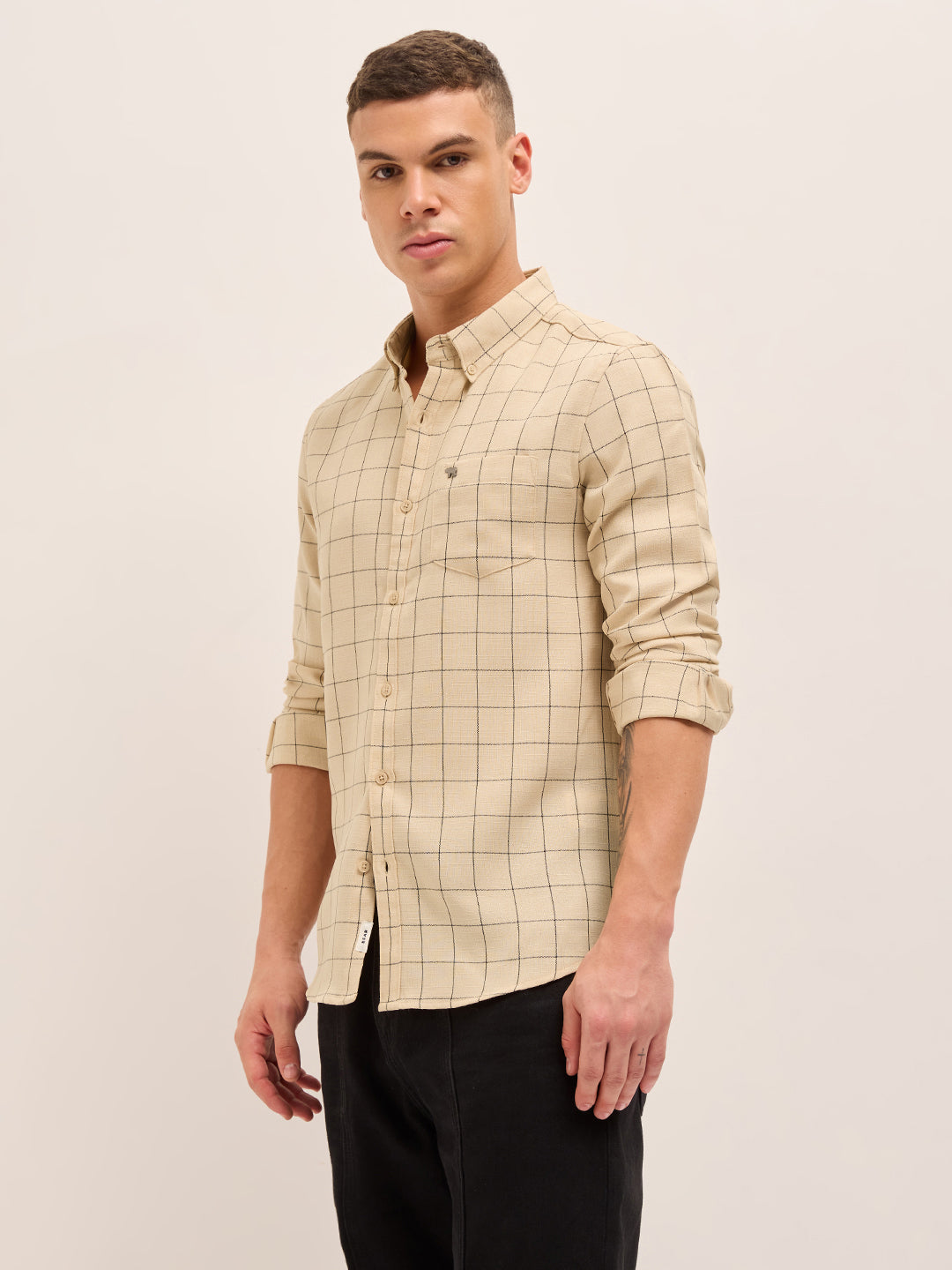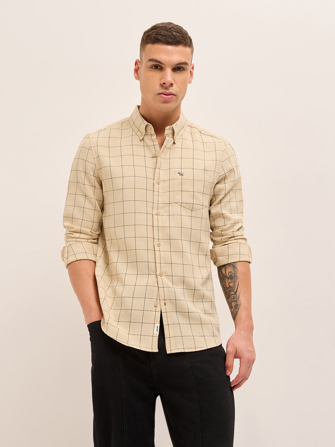Shop Cream Block Checks Slim Fit Casual Shirt Online.