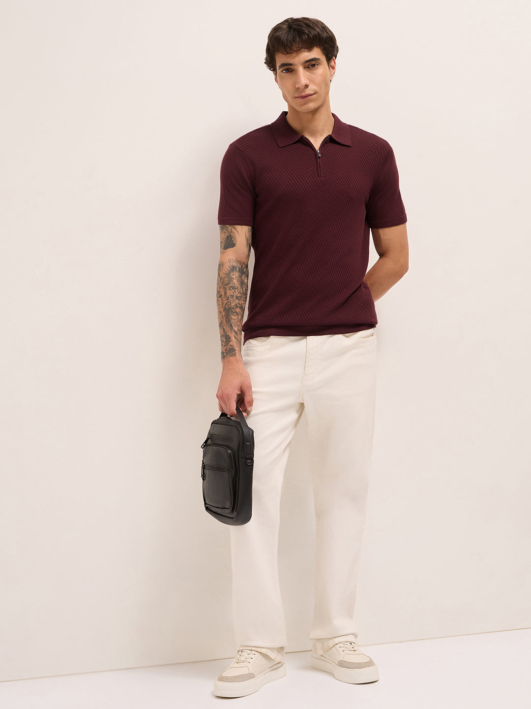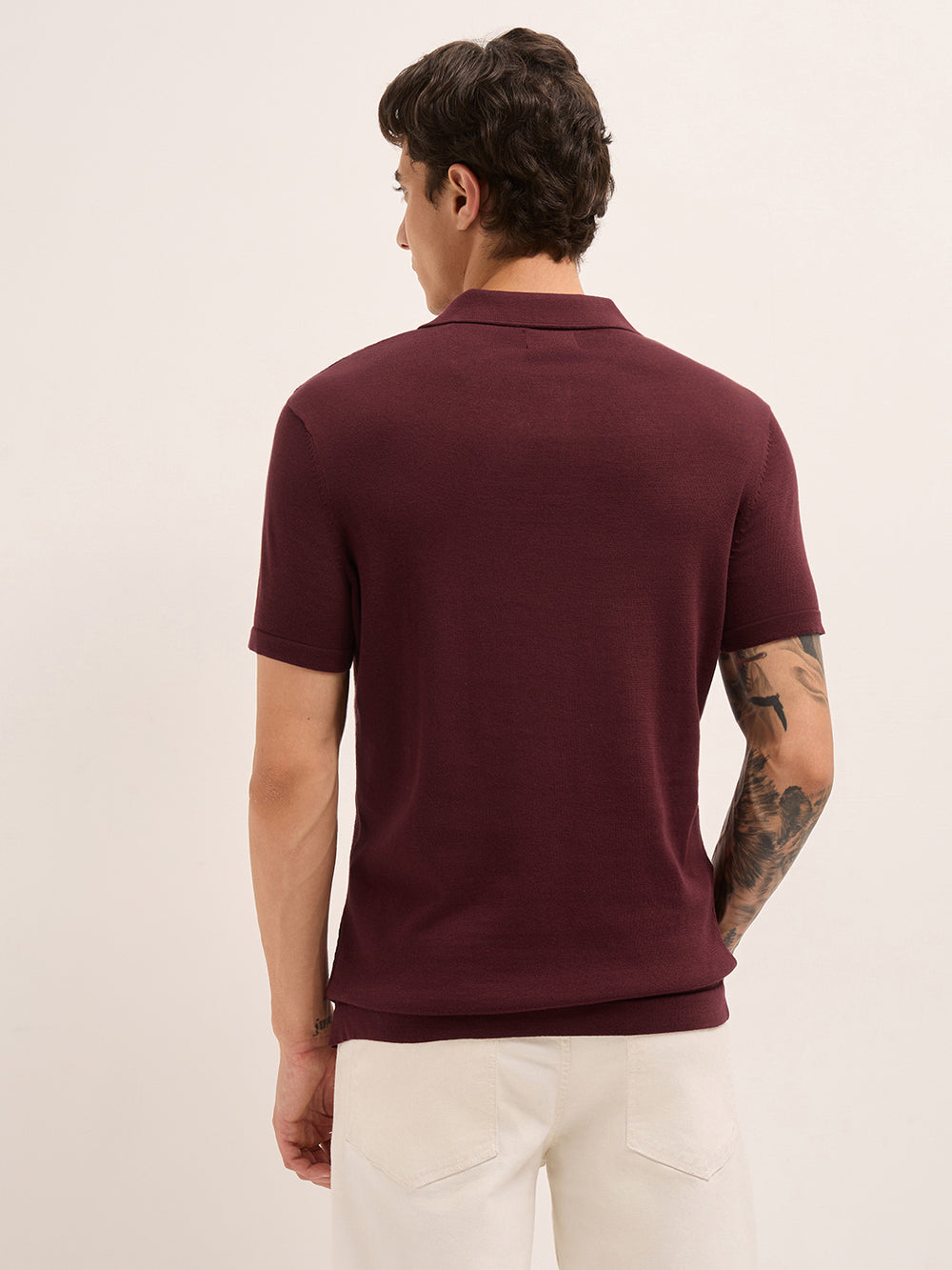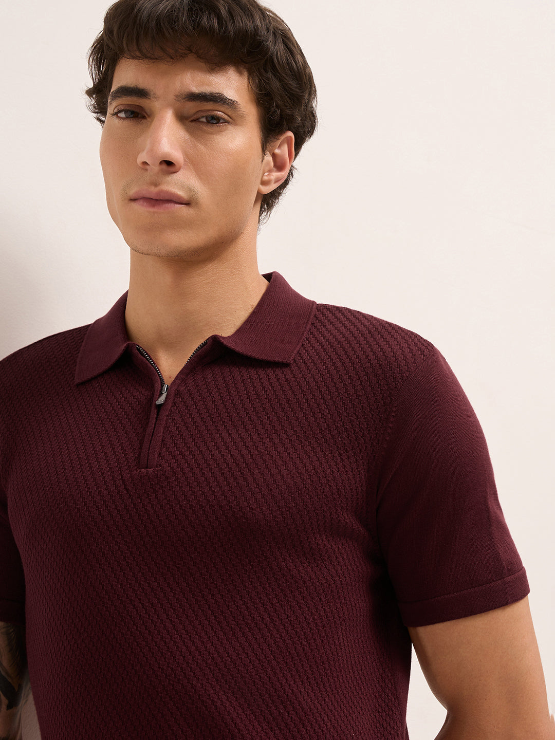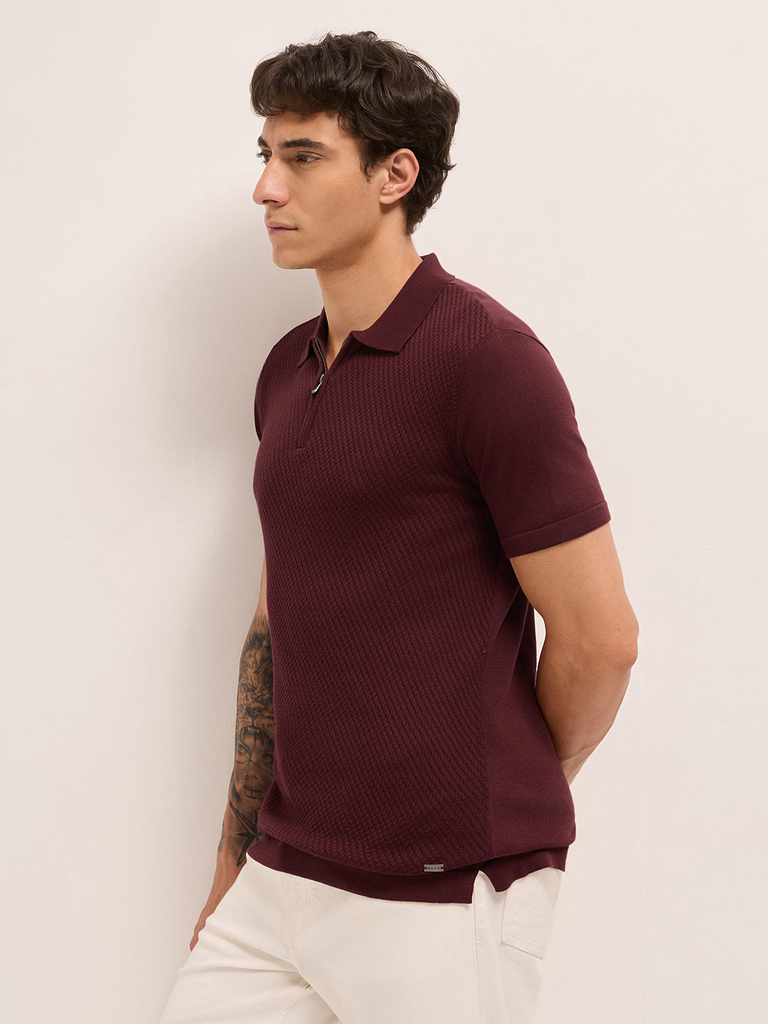 Maroon Regular Fit Textured Knit Half-Zip Polo