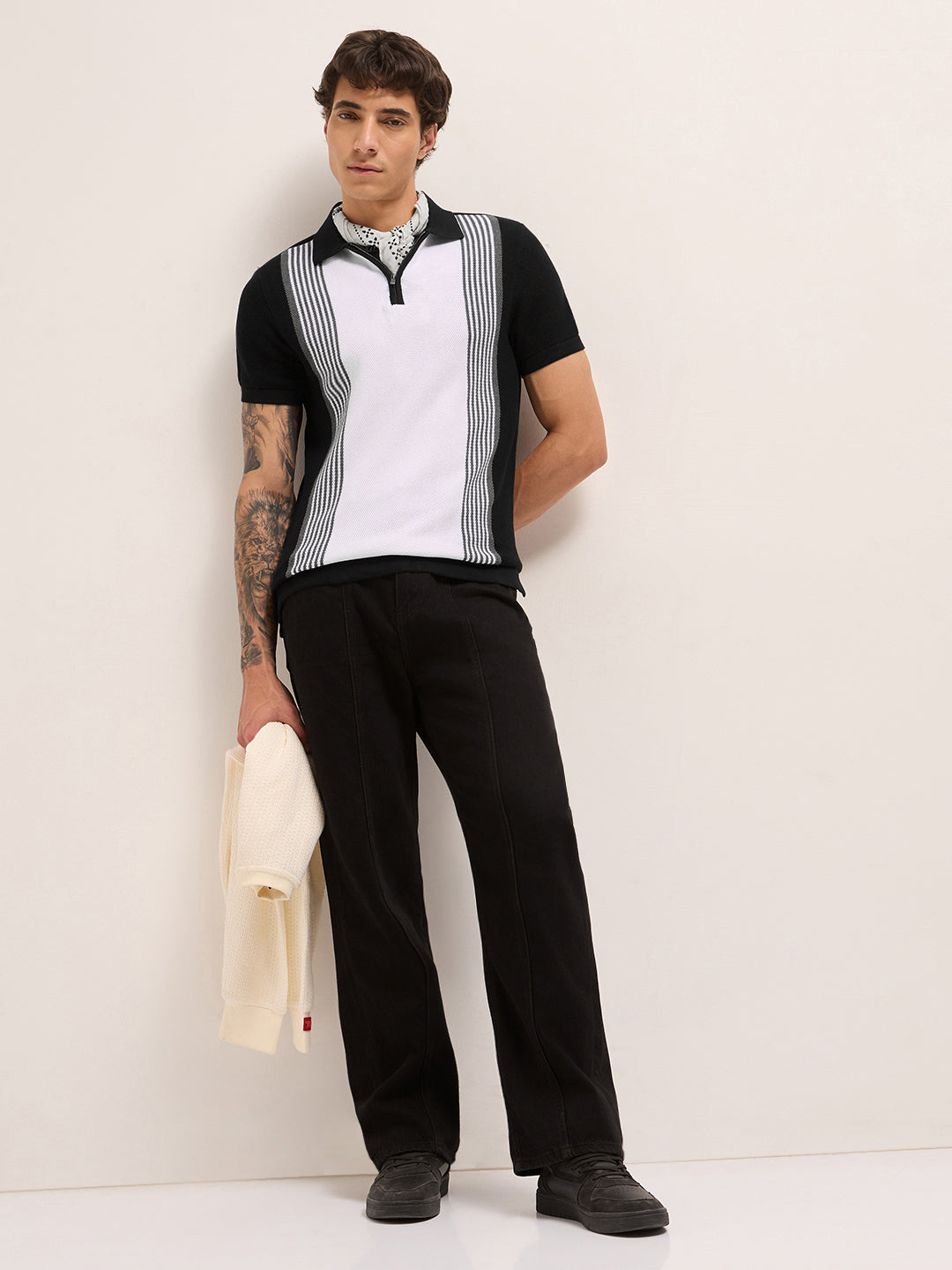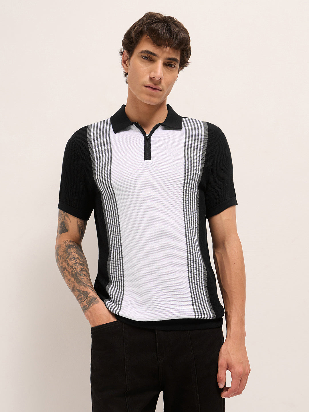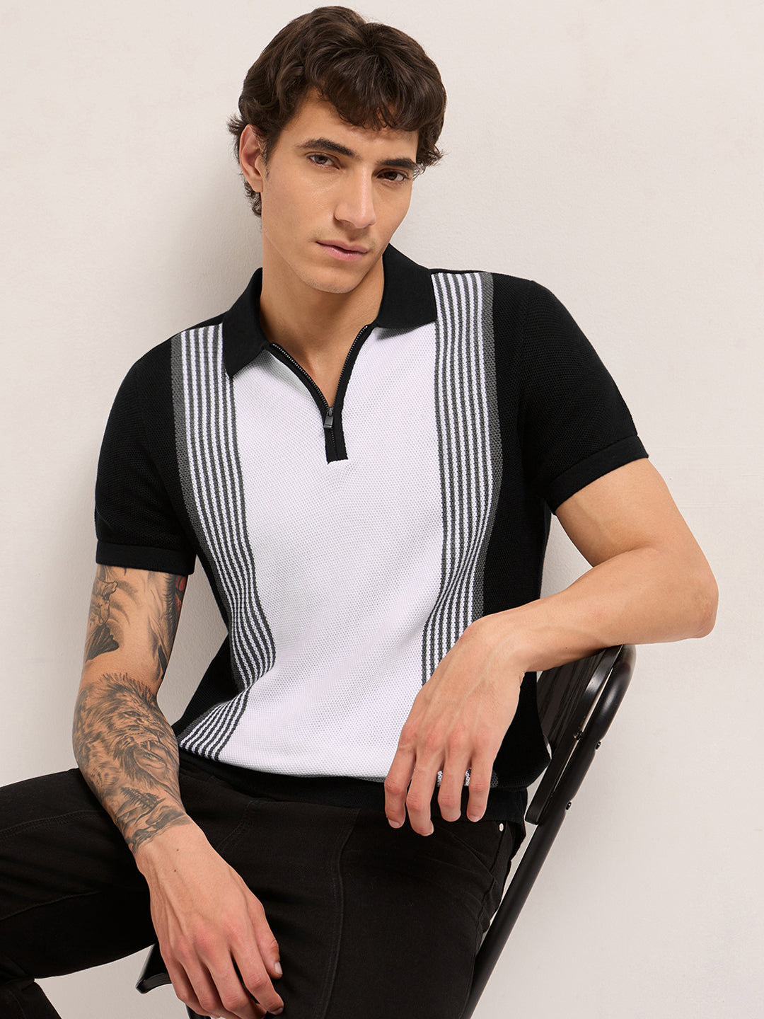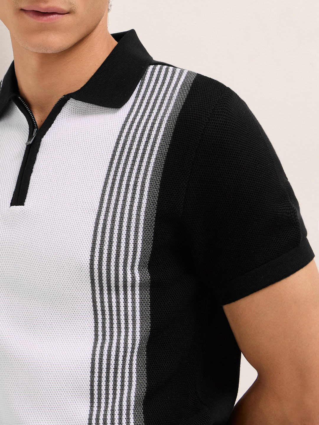 Black & White Textured Panel Knit Polo with Half-Zip Placket Detail