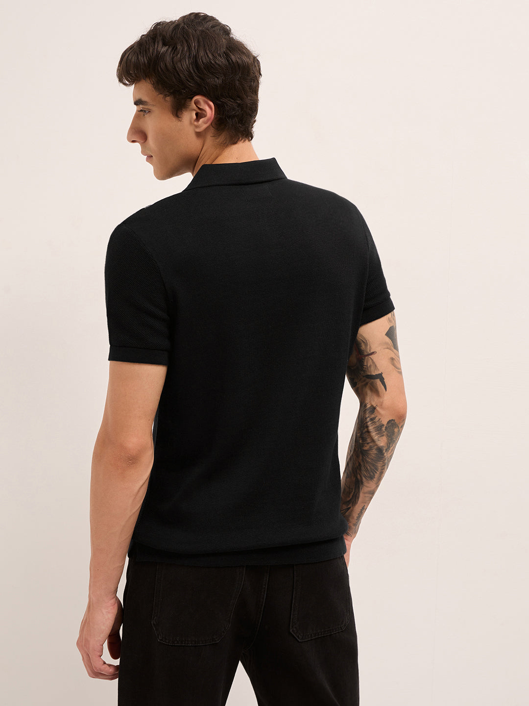 Shop Black & White Textured Panel Knit Polo with Half-Zip Placket Detail Online.