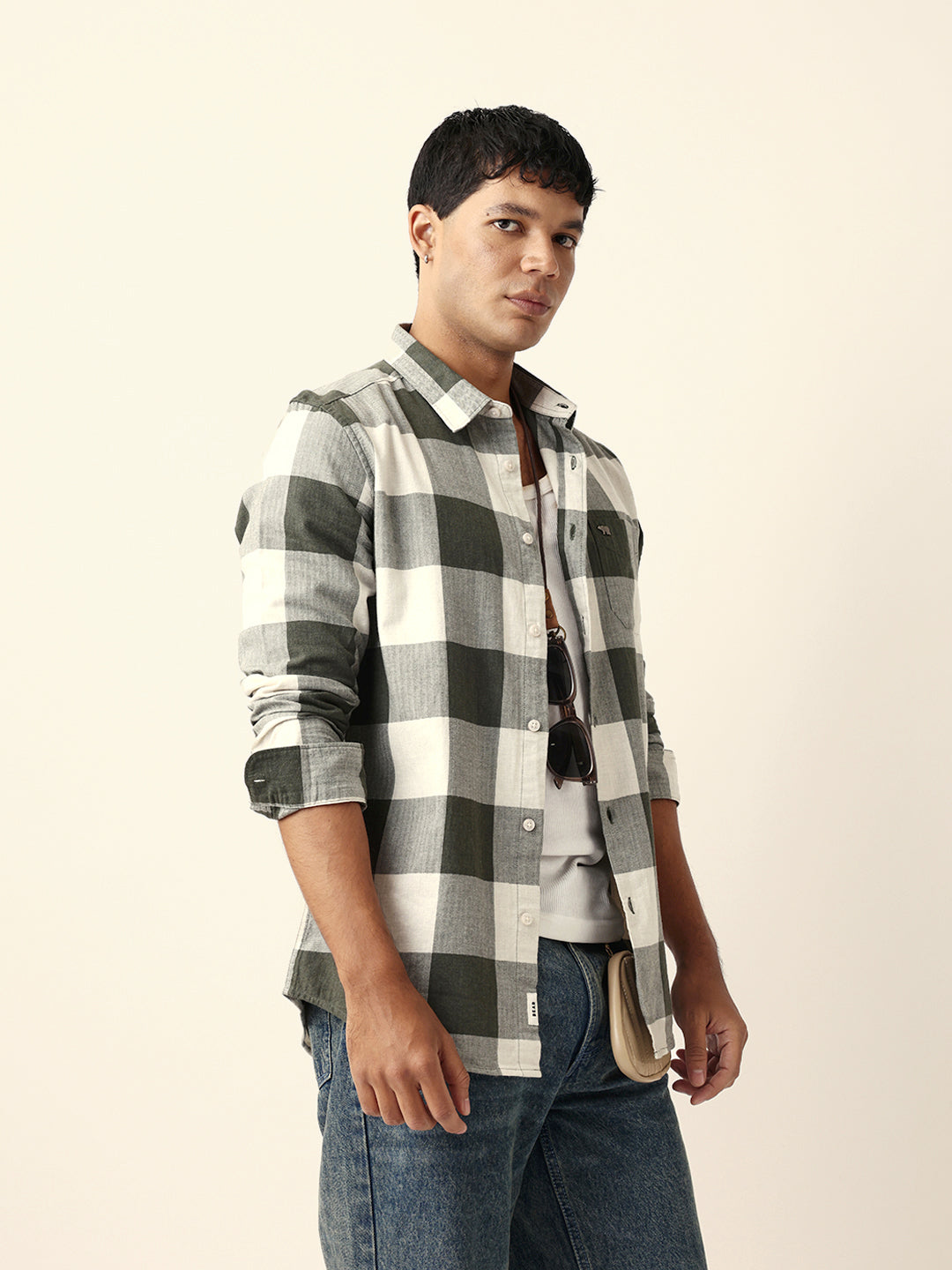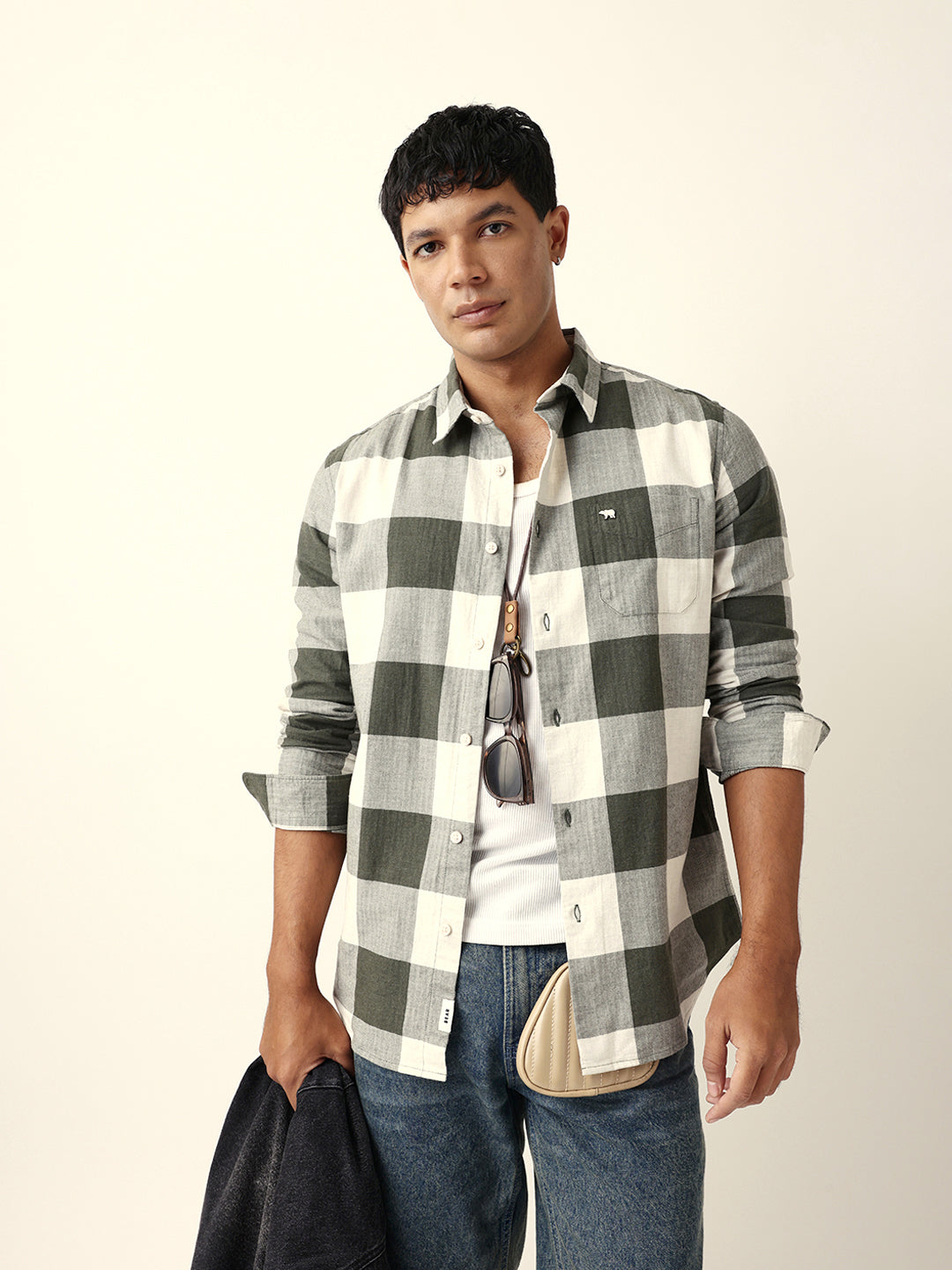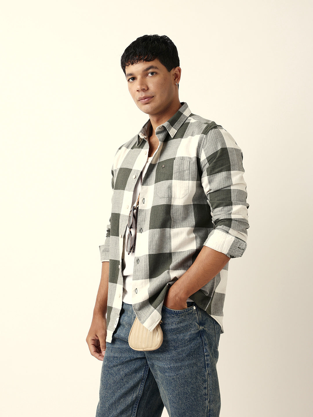 Shop Olive with Cream Woven Checks Slim Fit Casual Shirt Online.