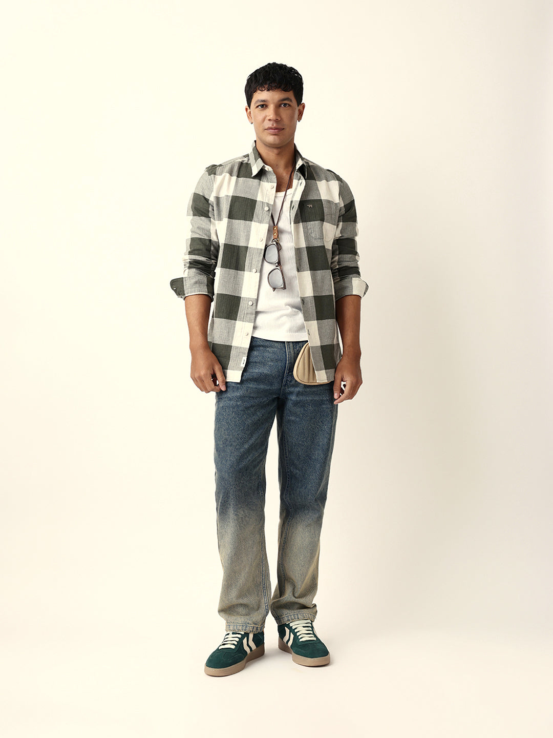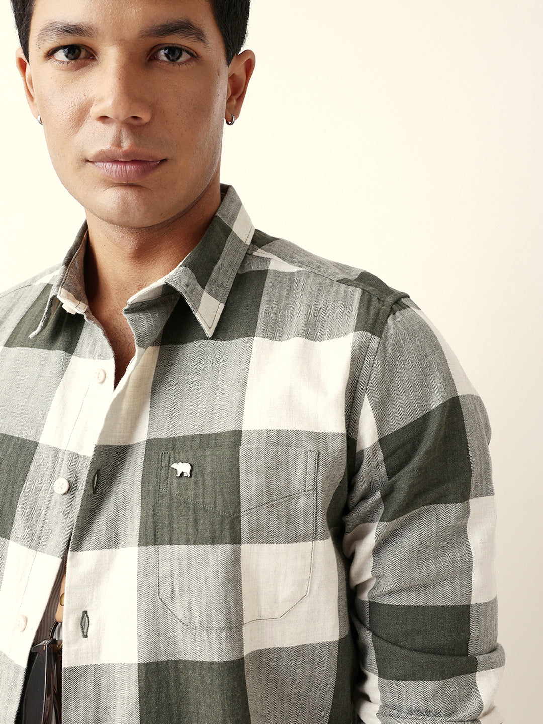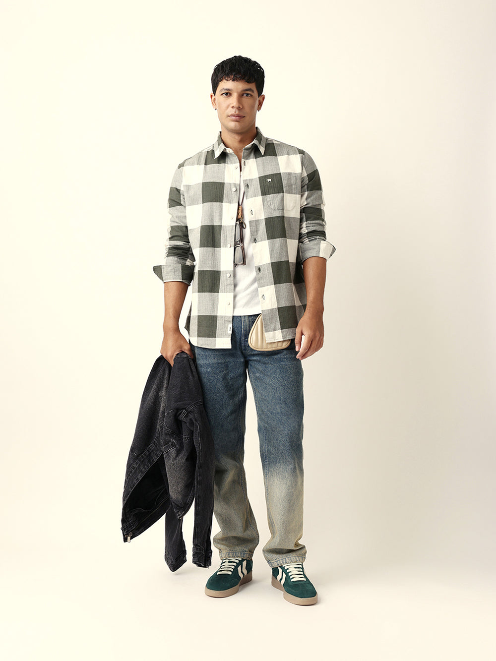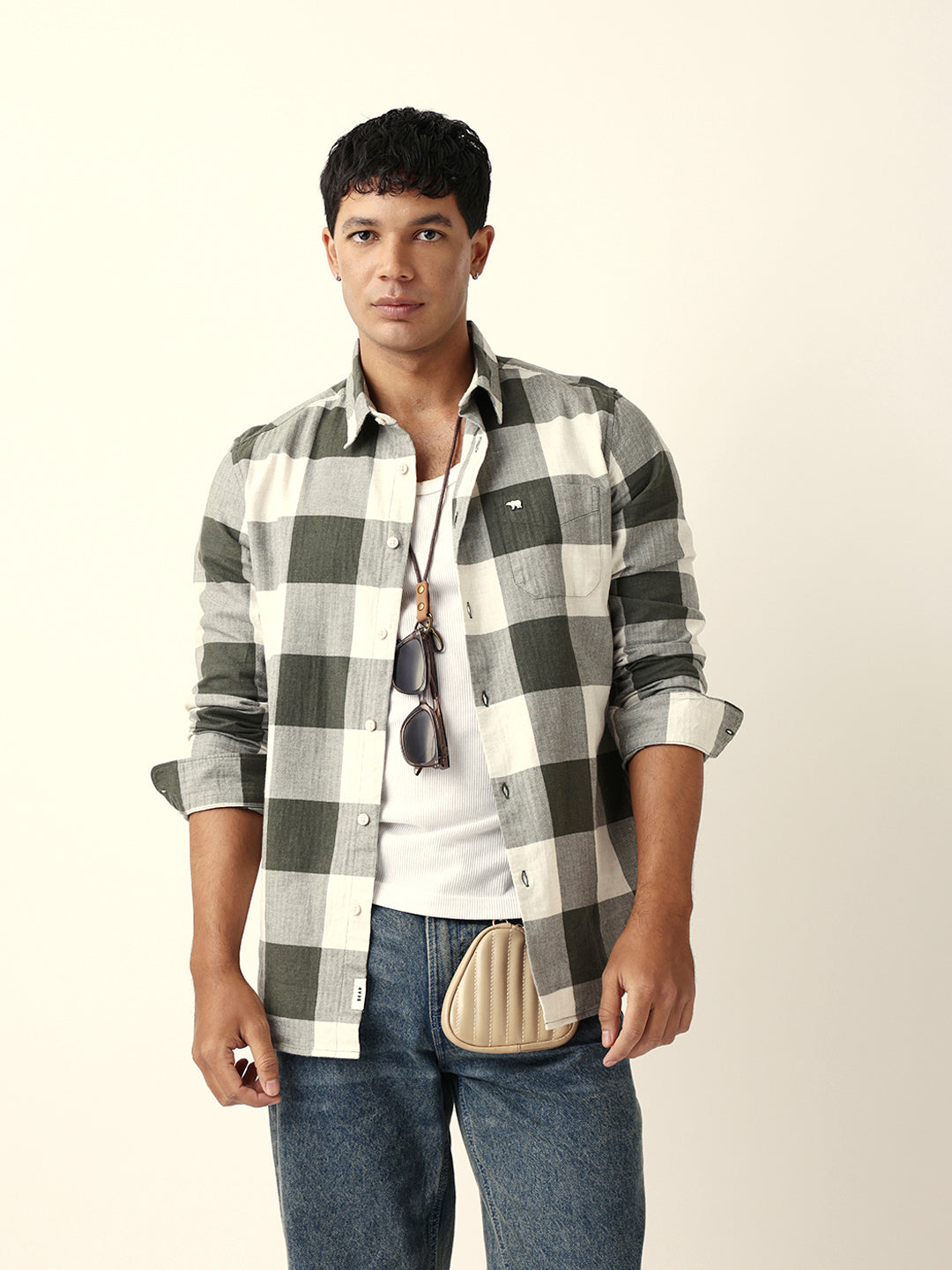 Shop Olive with Cream Woven Checks Slim Fit Casual Shirt Online.