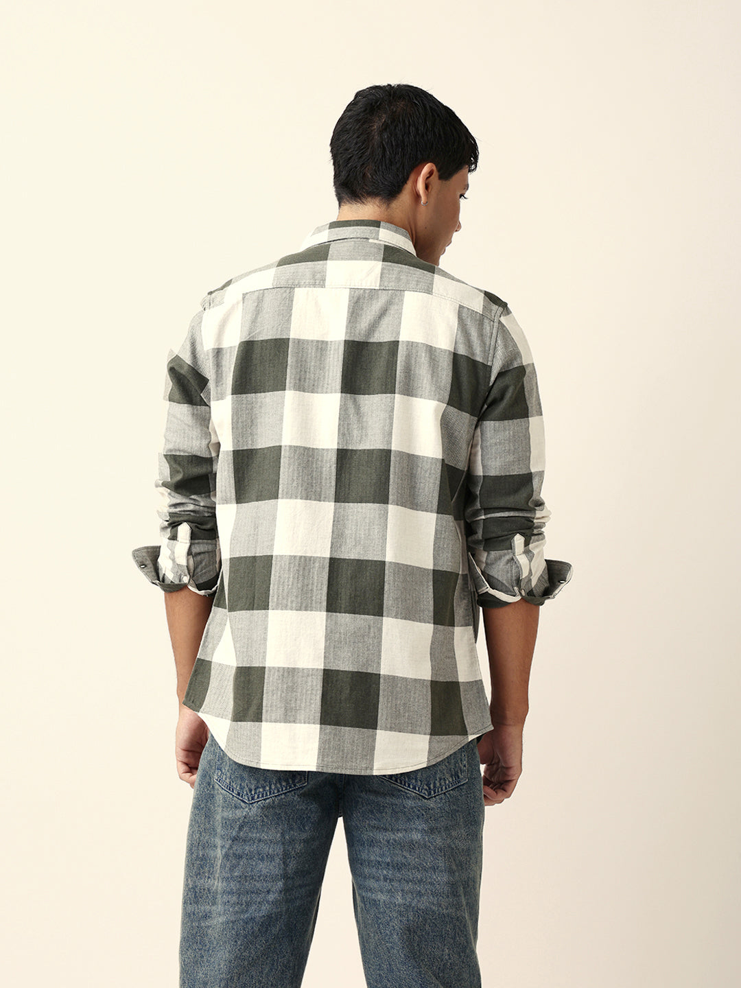 Olive with Cream Woven Checks Slim Fit Casual Shirt