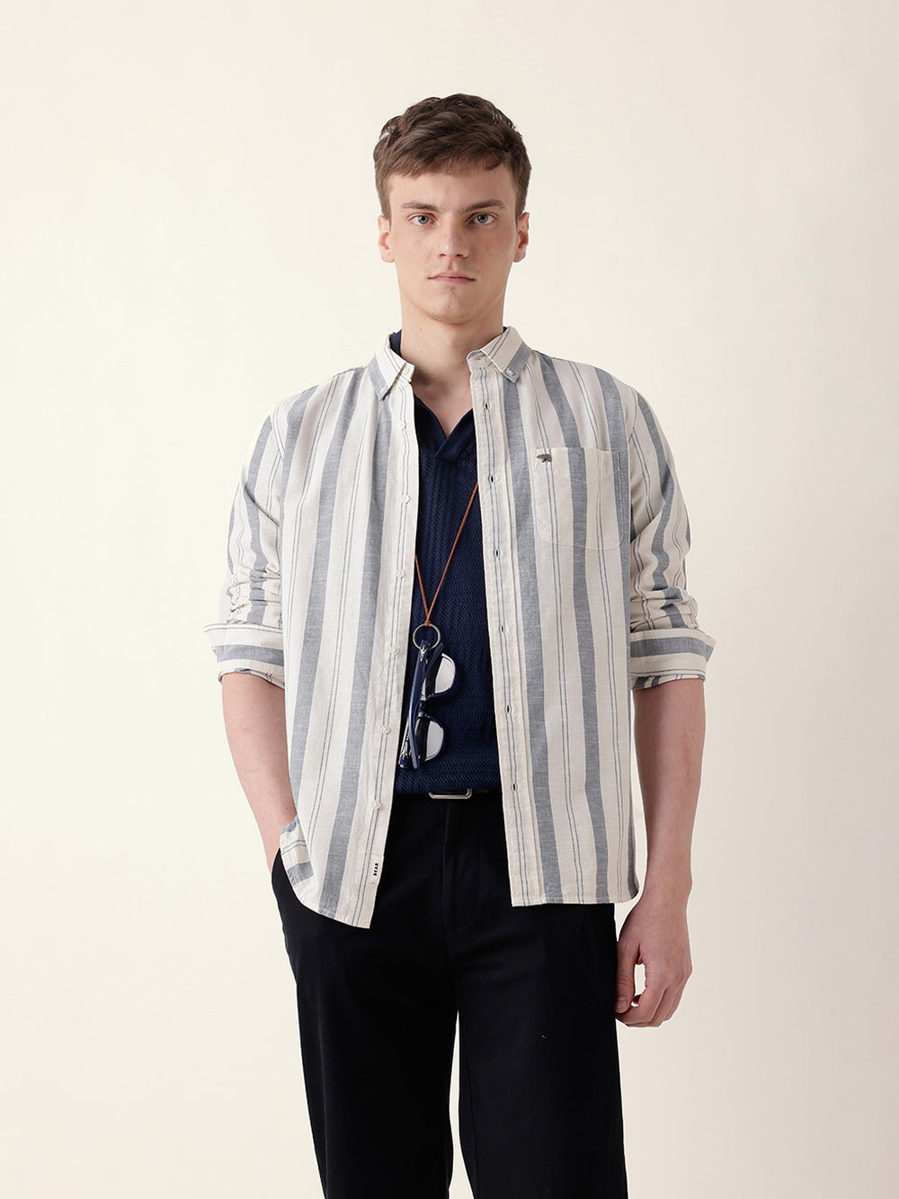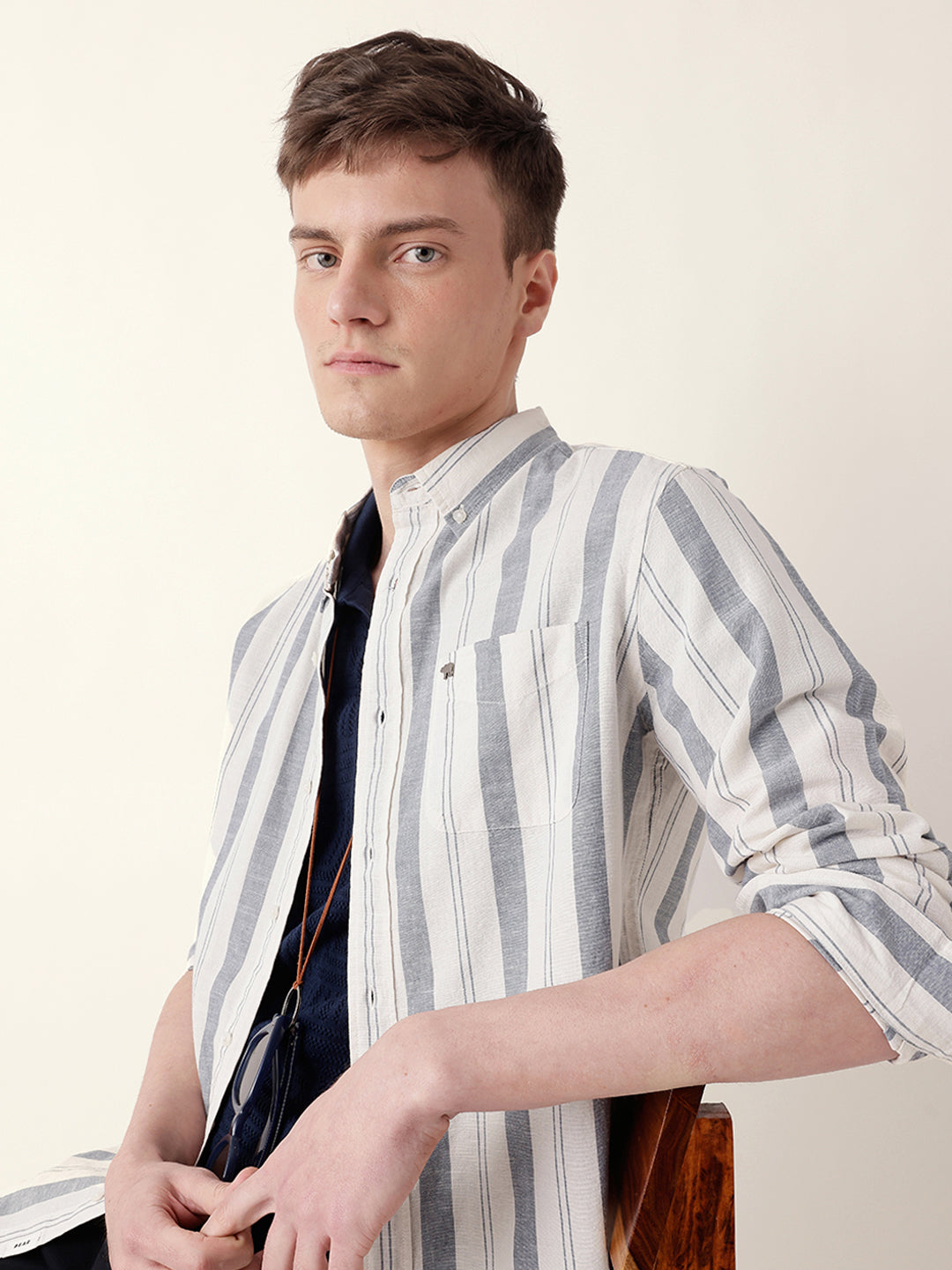 Shop Blue with White Woven Vertical Stripes Slim Fit Casual Shirt Online.