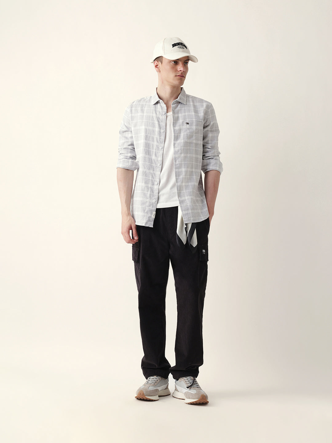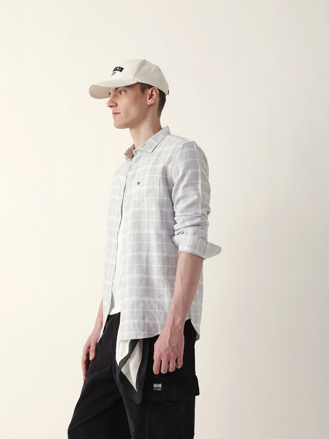 Grey Herringbone Checked Slim Fit Casual Shirt