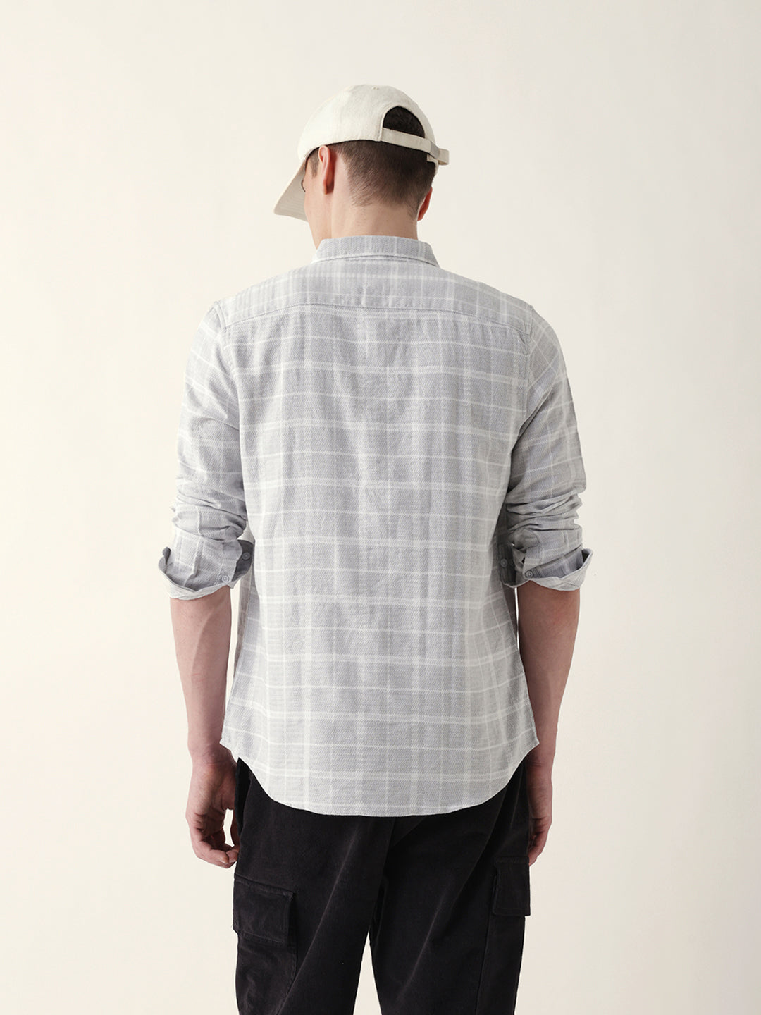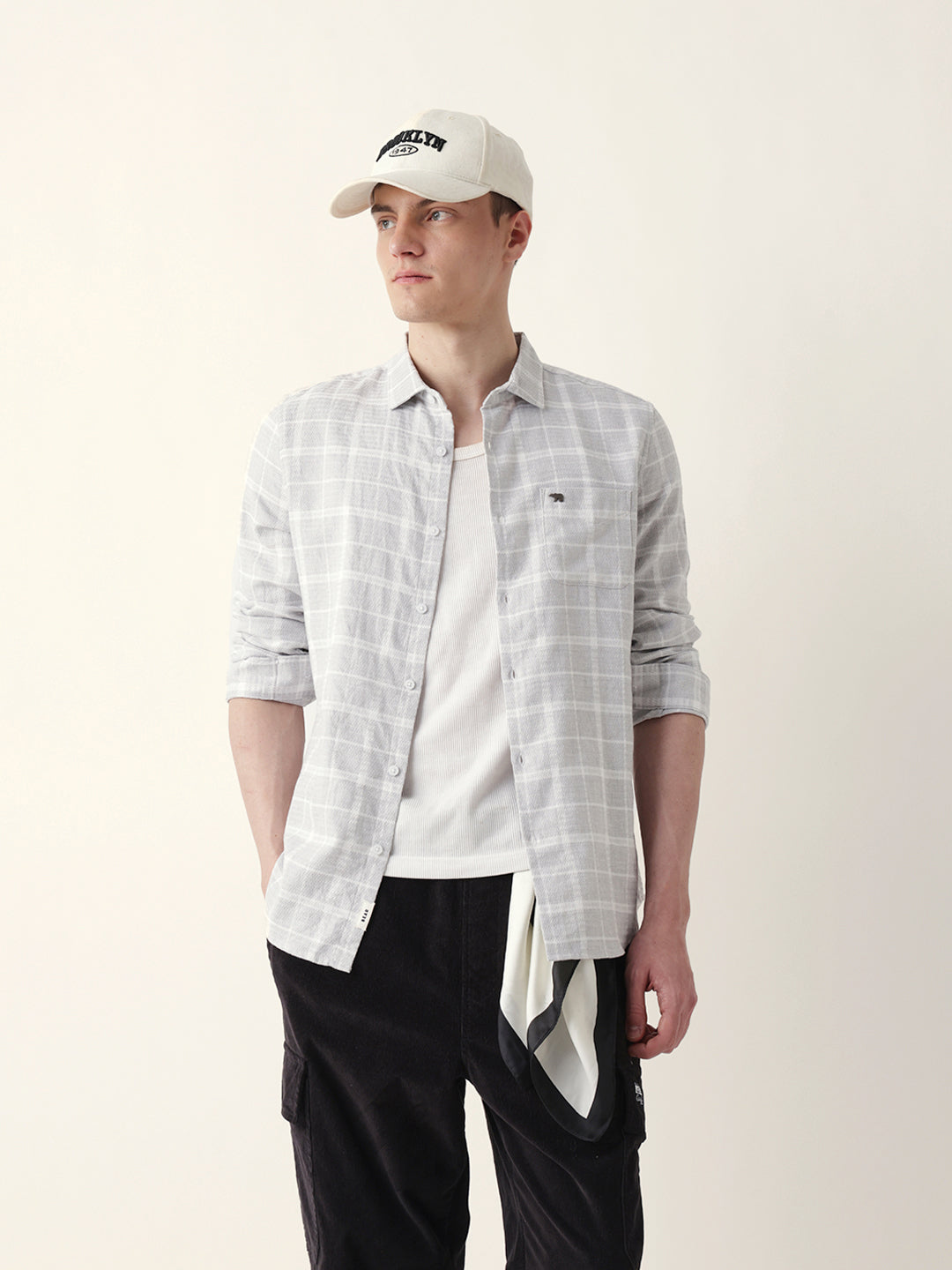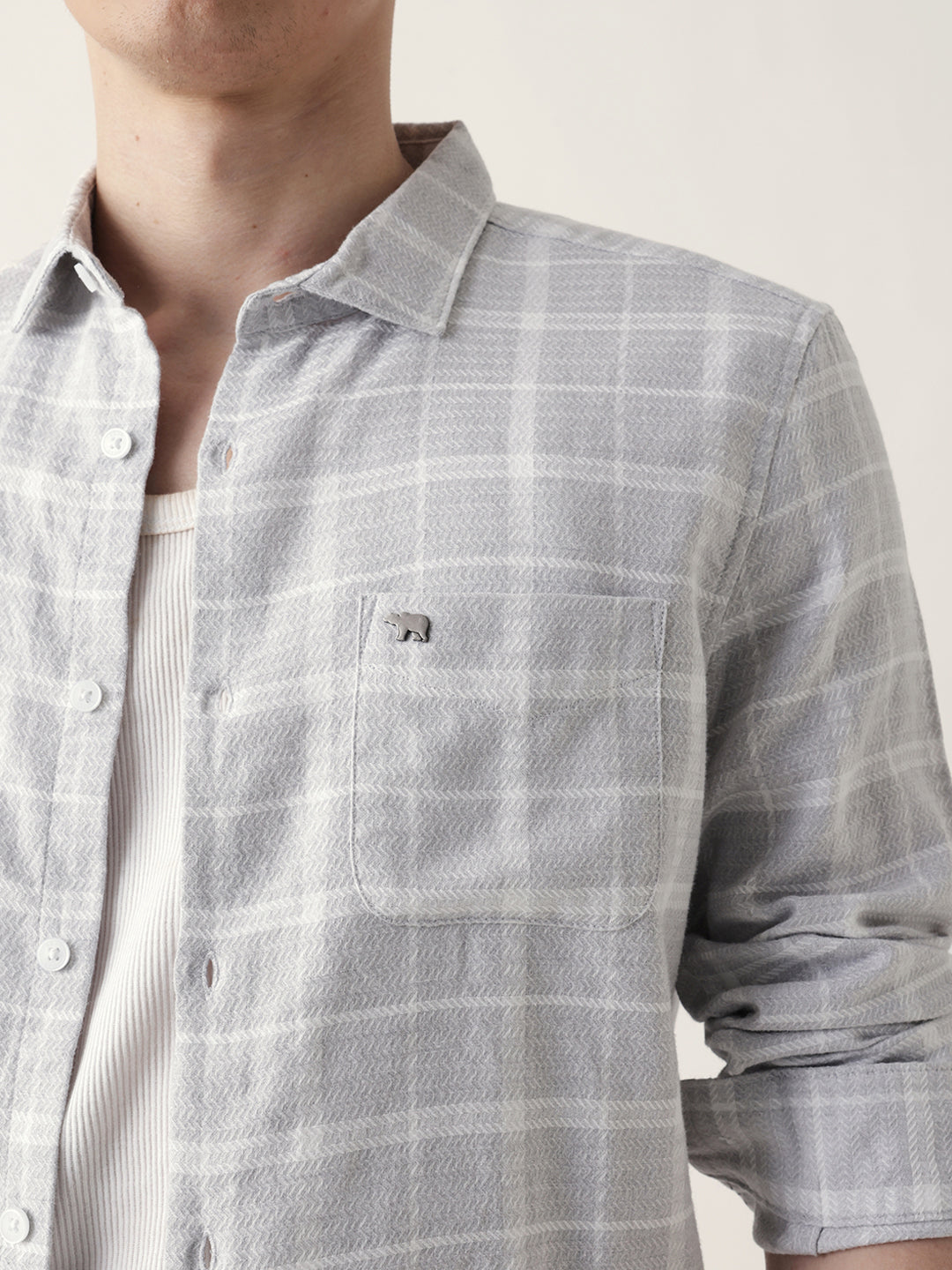 Shop Grey Herringbone Checked Slim Fit Casual Shirt Online.