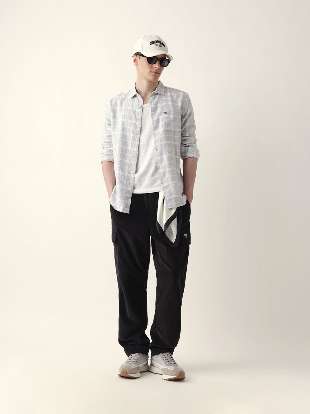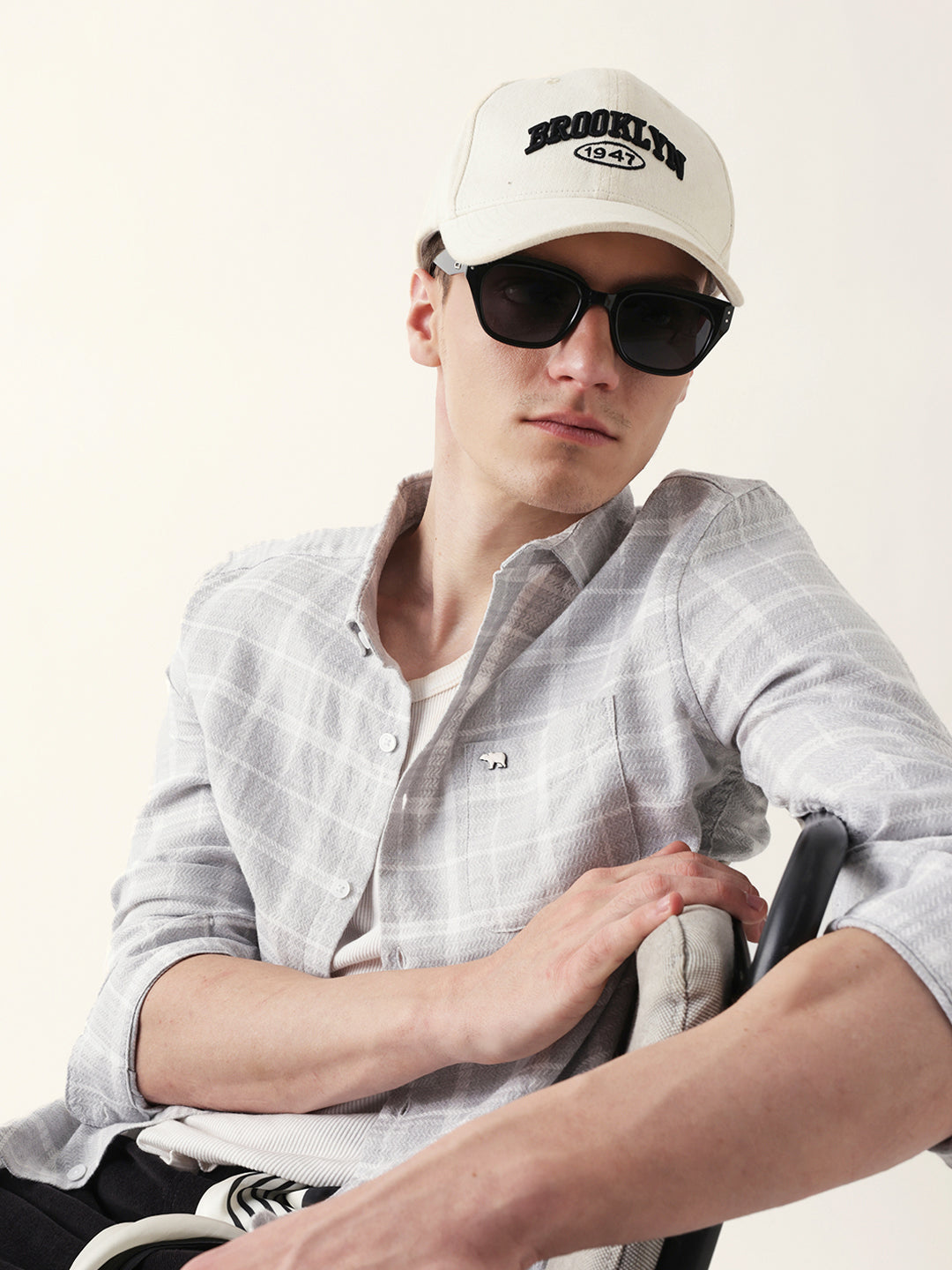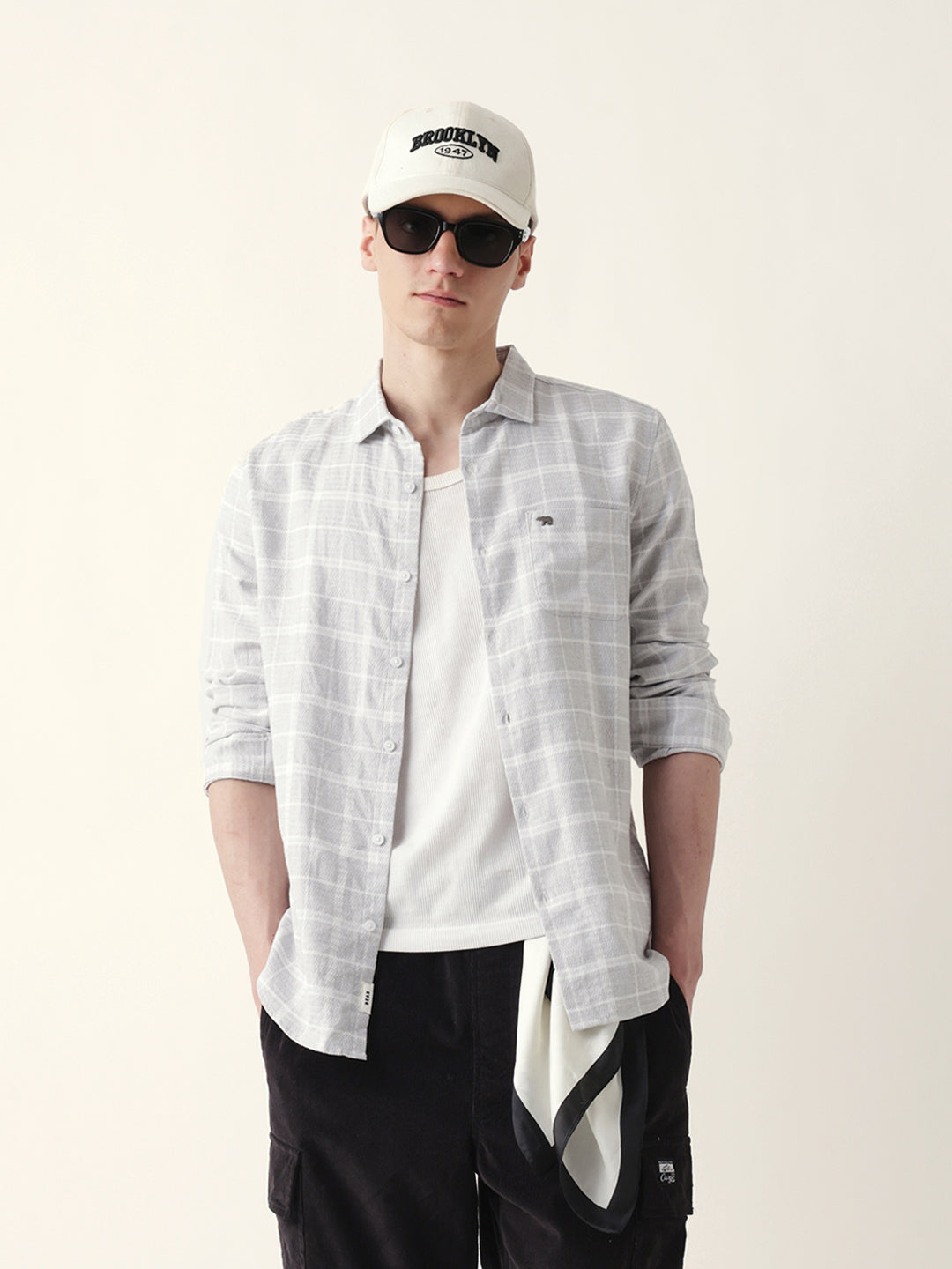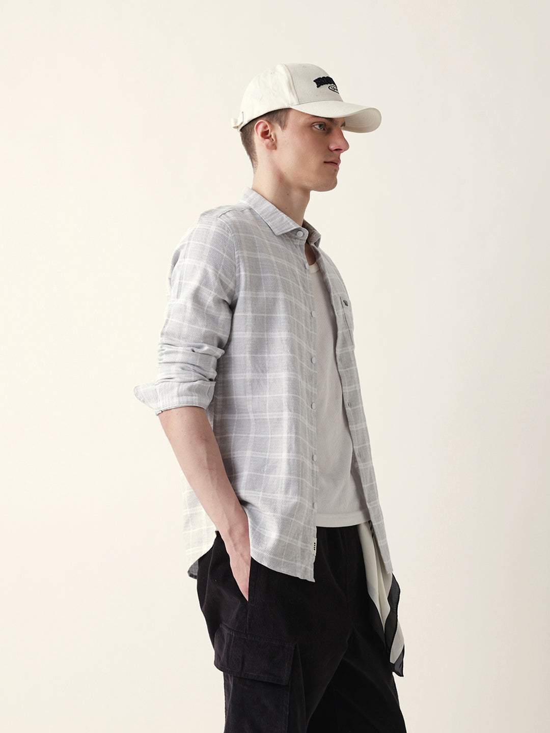 Shop Grey Herringbone Checked Slim Fit Casual Shirt Online.