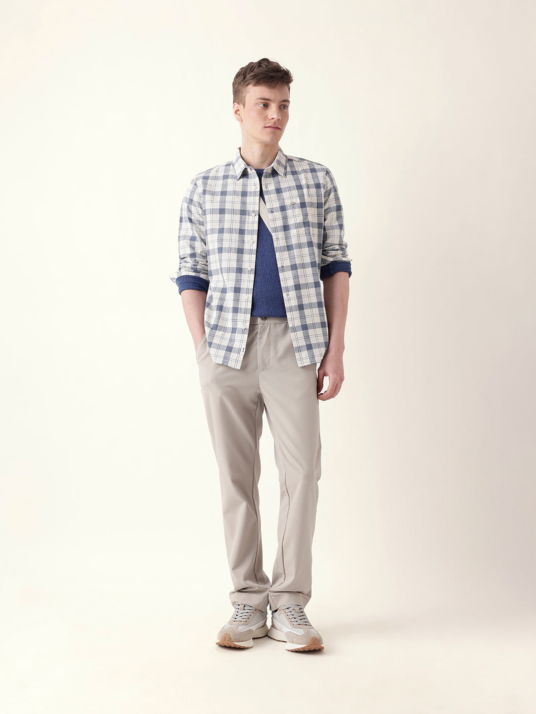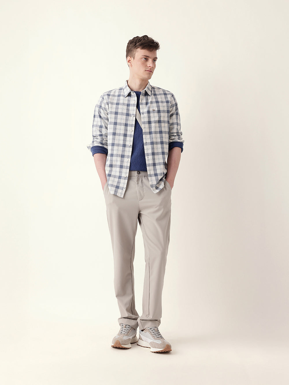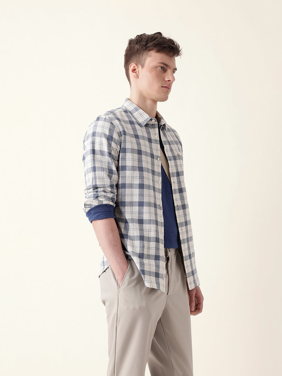 Shop White with Blue Woven Checkered Slim Fit Casual Shirt Online.