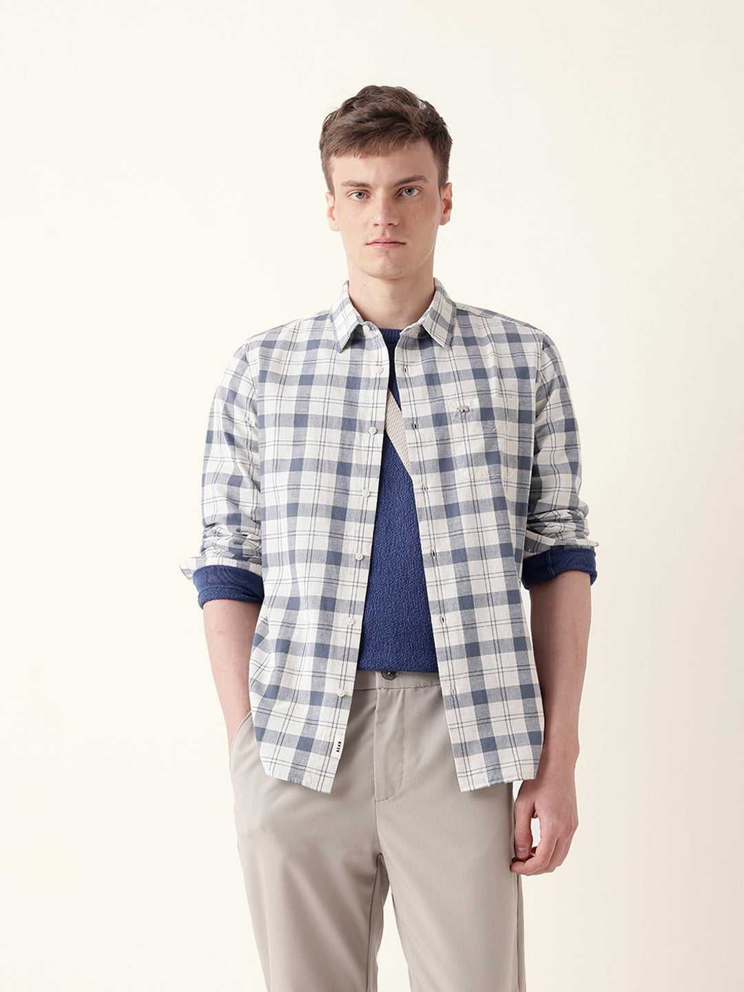 White with Blue Woven Checkered Slim Fit Casual Shirt