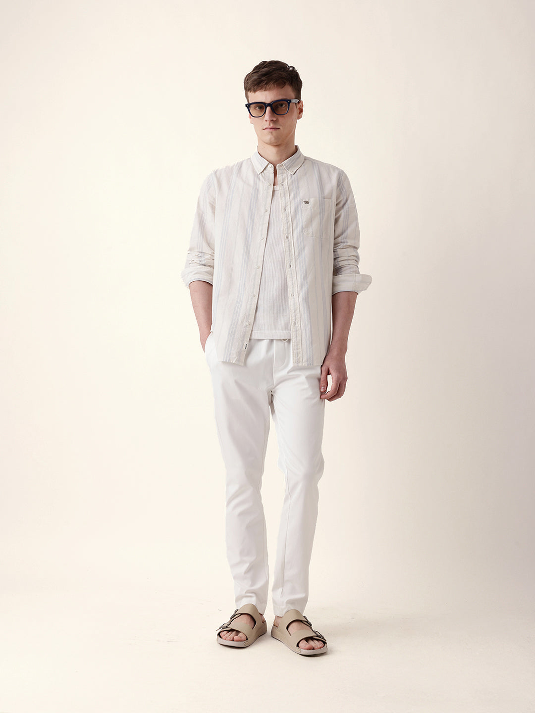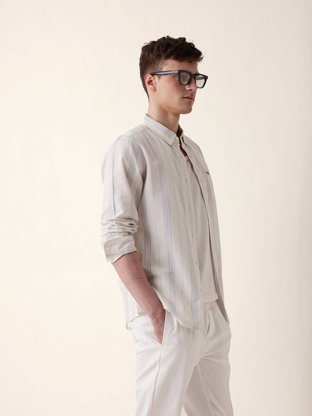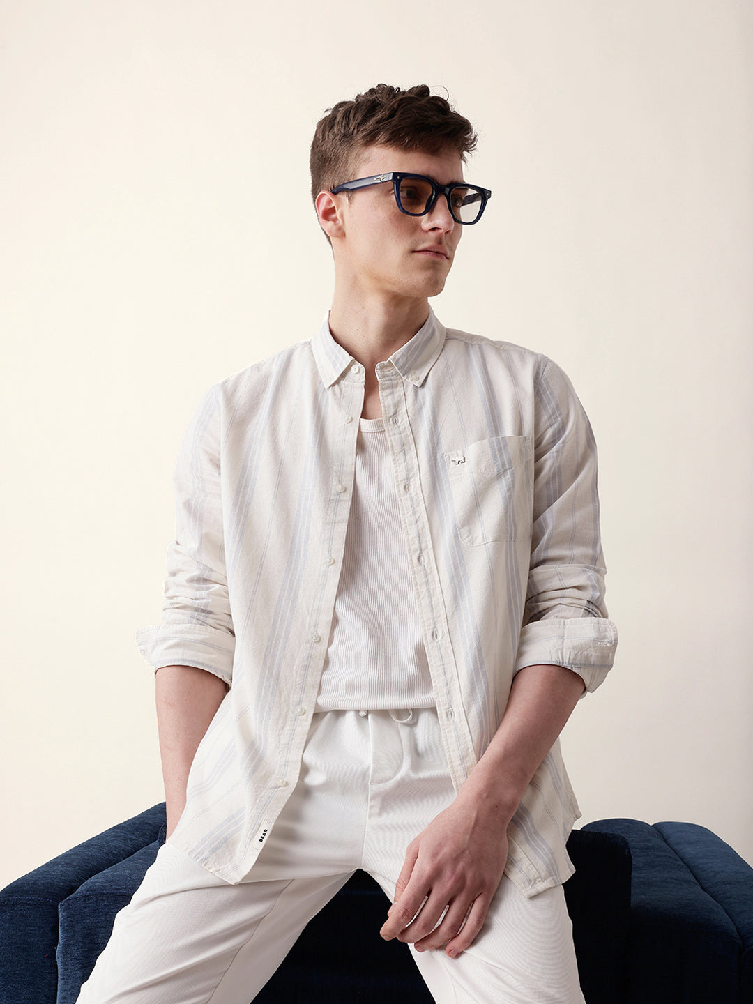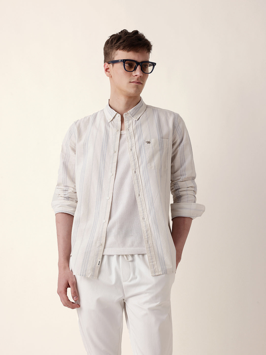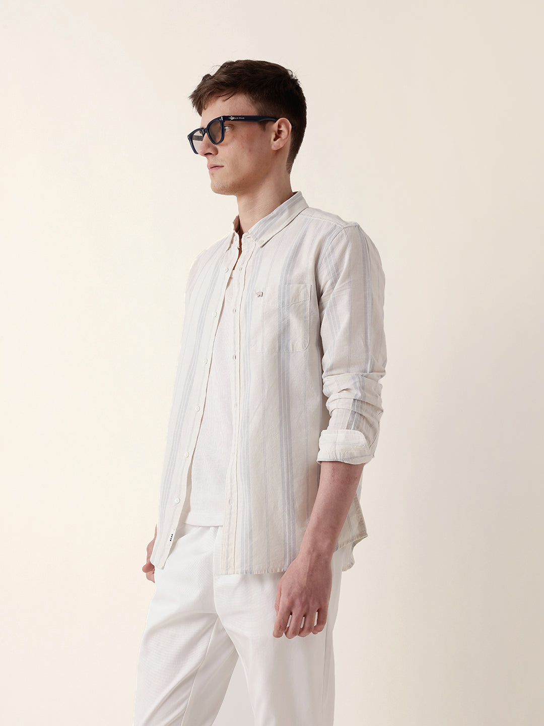 Shop Off White with Blue Woven Vertical Stripes Slim Fit Casual Shirt Online.