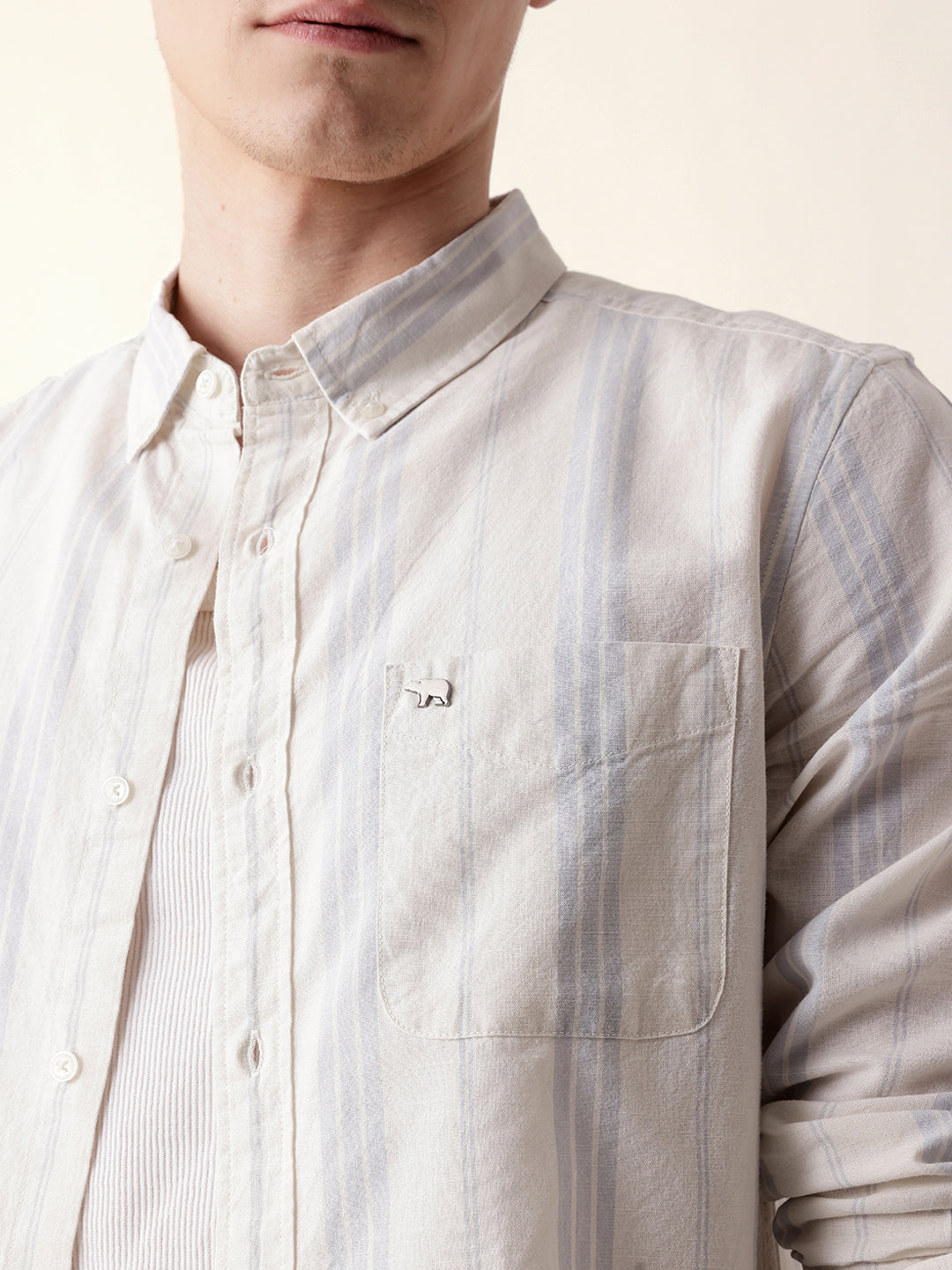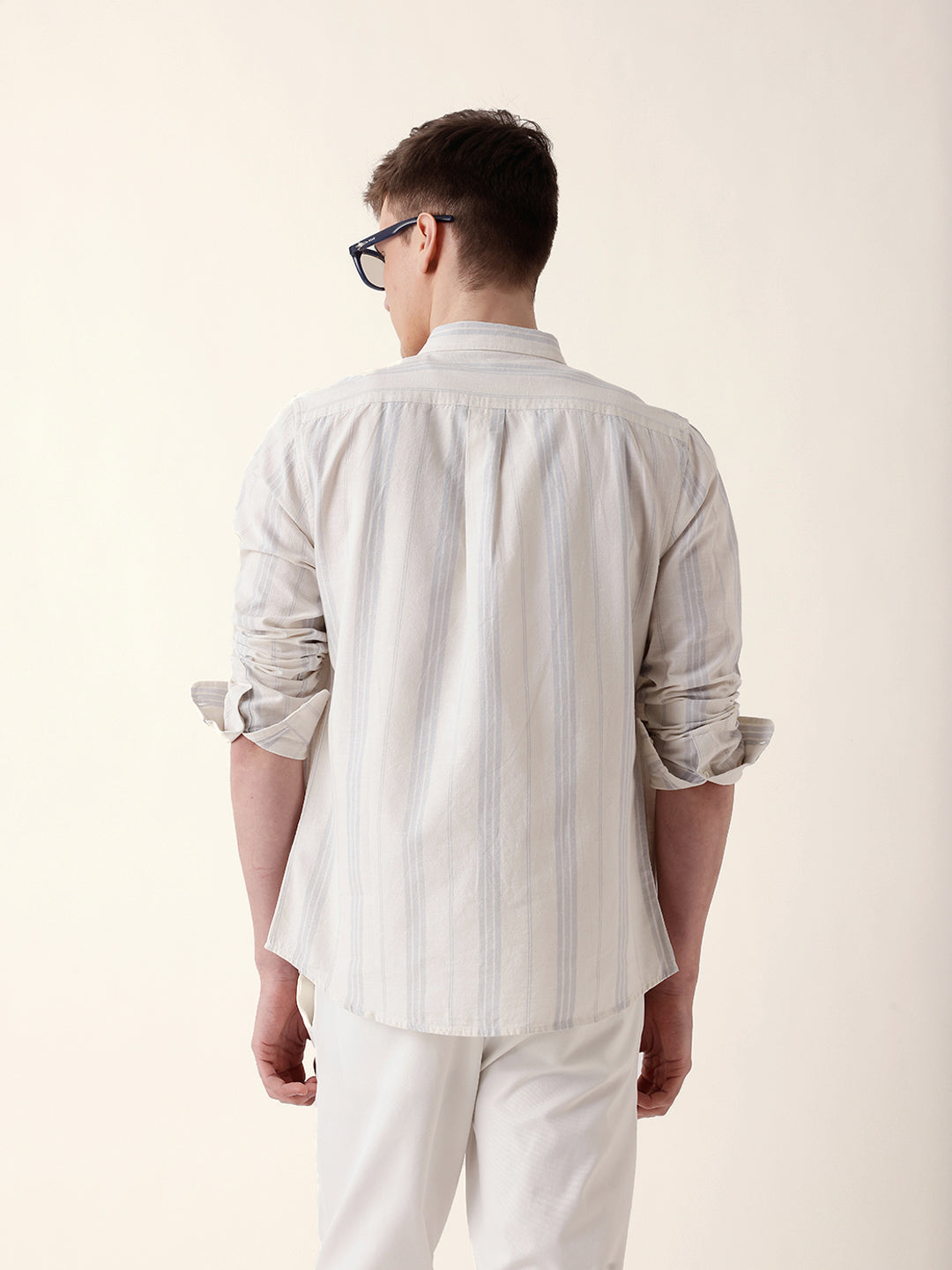 Off White with Blue Woven Vertical Stripes Slim Fit Casual Shirt