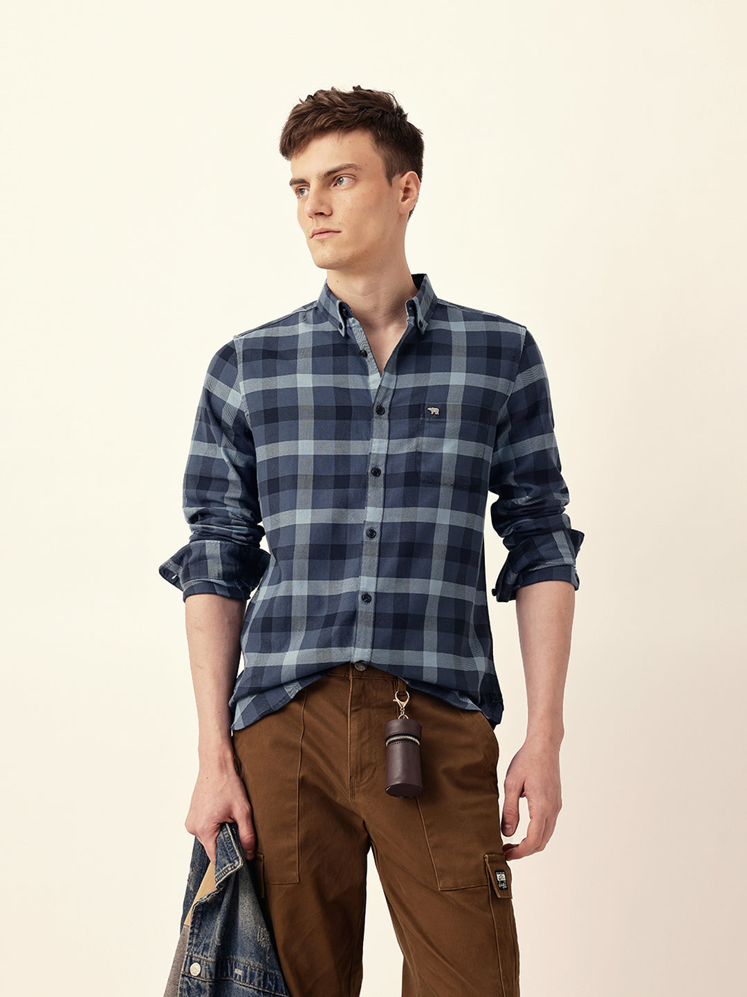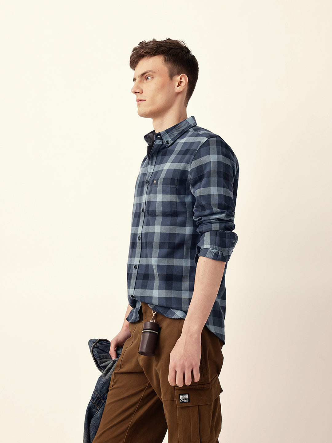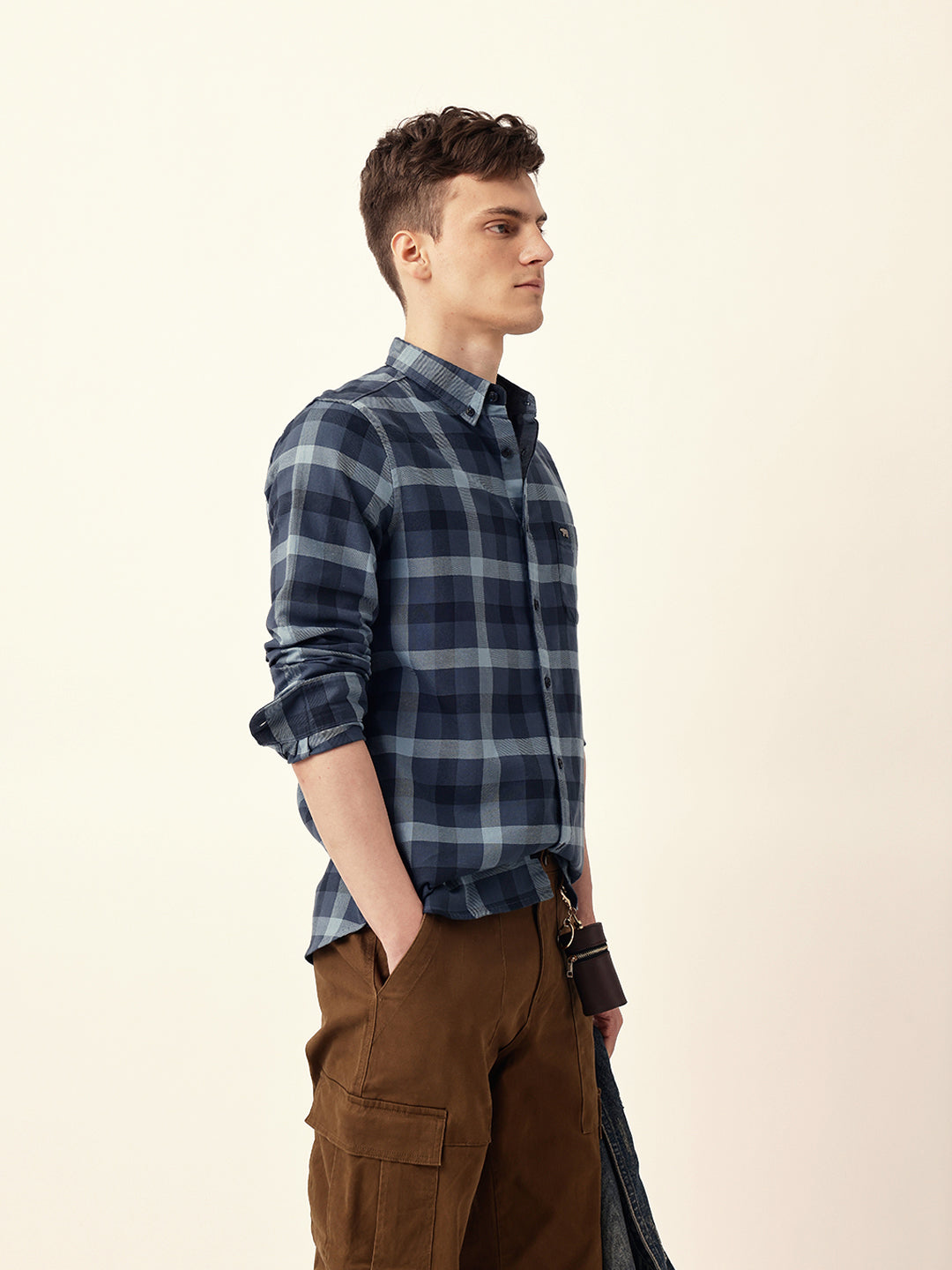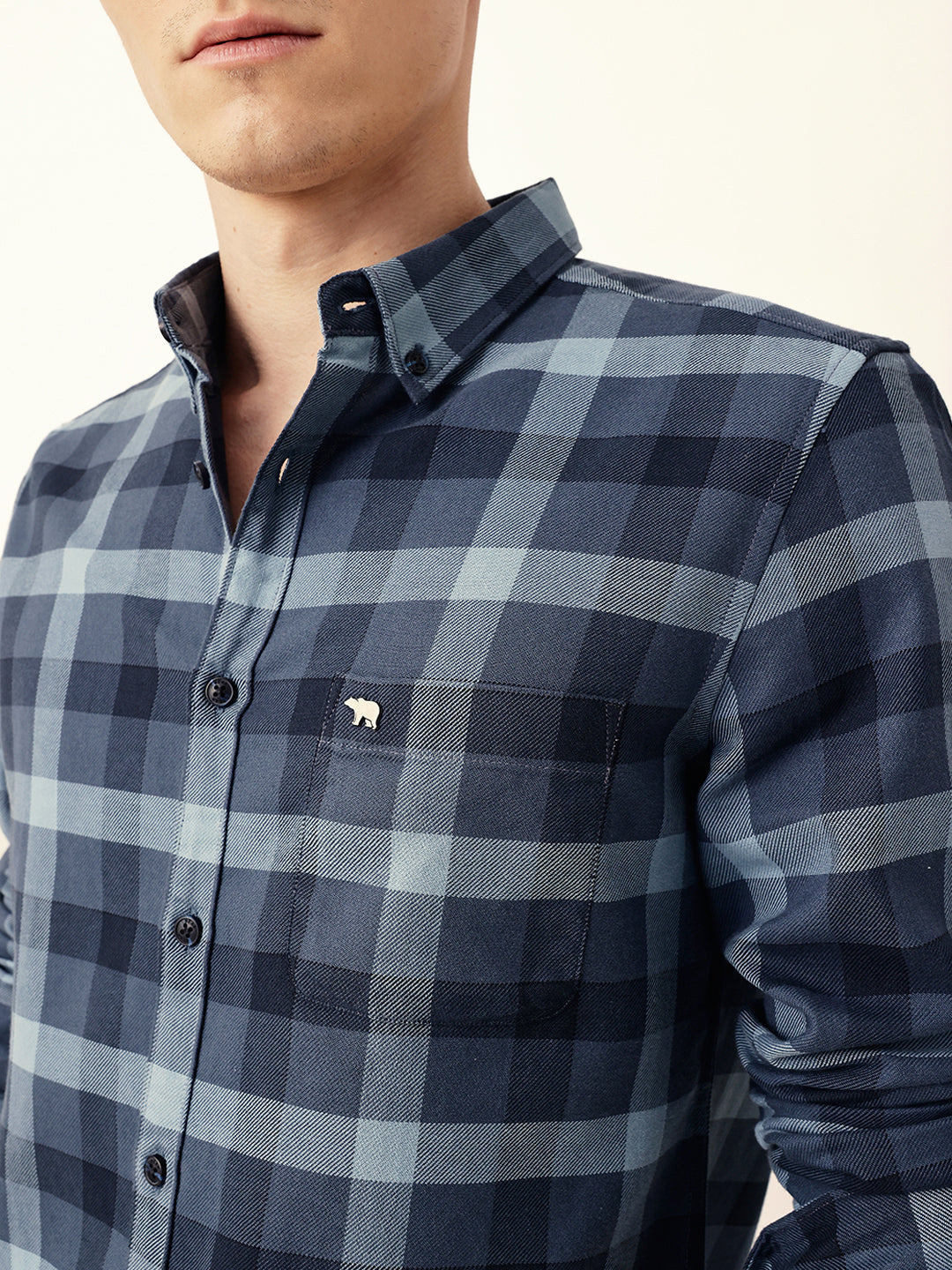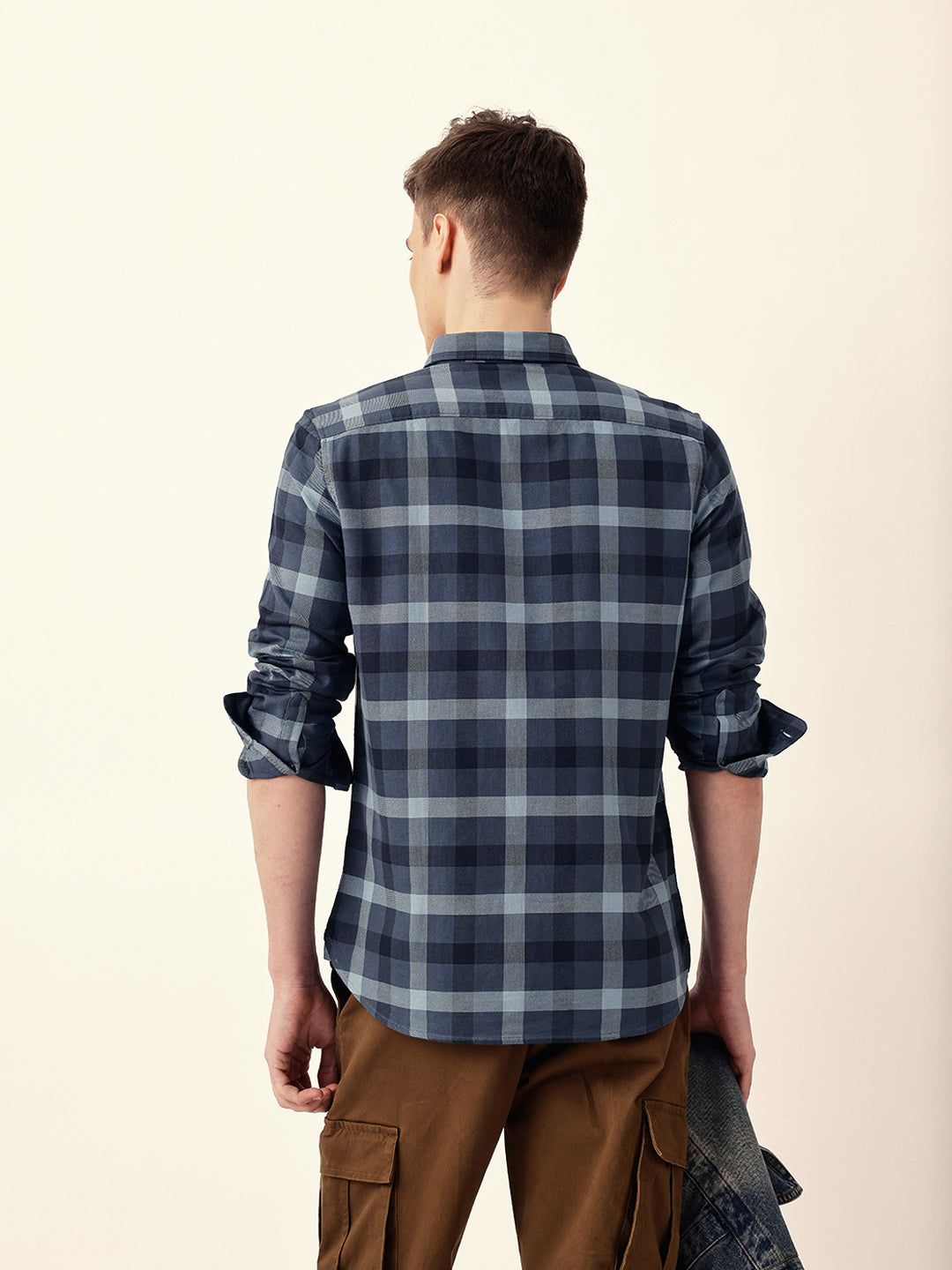 Shop Blue Woven Tartan Checked Slim Fit Casual Shirt Online.