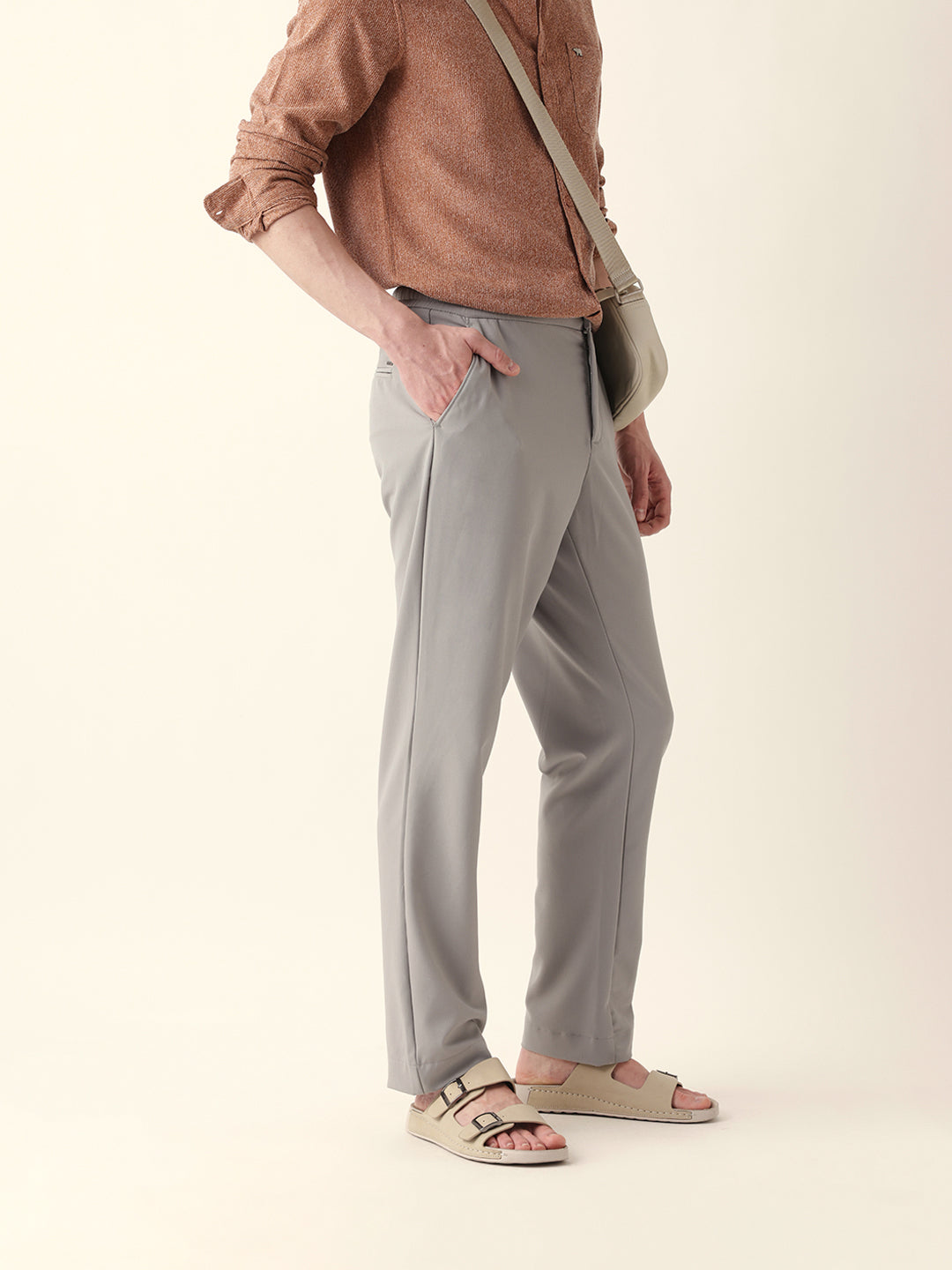 Grey Solid Relax Fit Casual Trousers with Hidden Drawstring