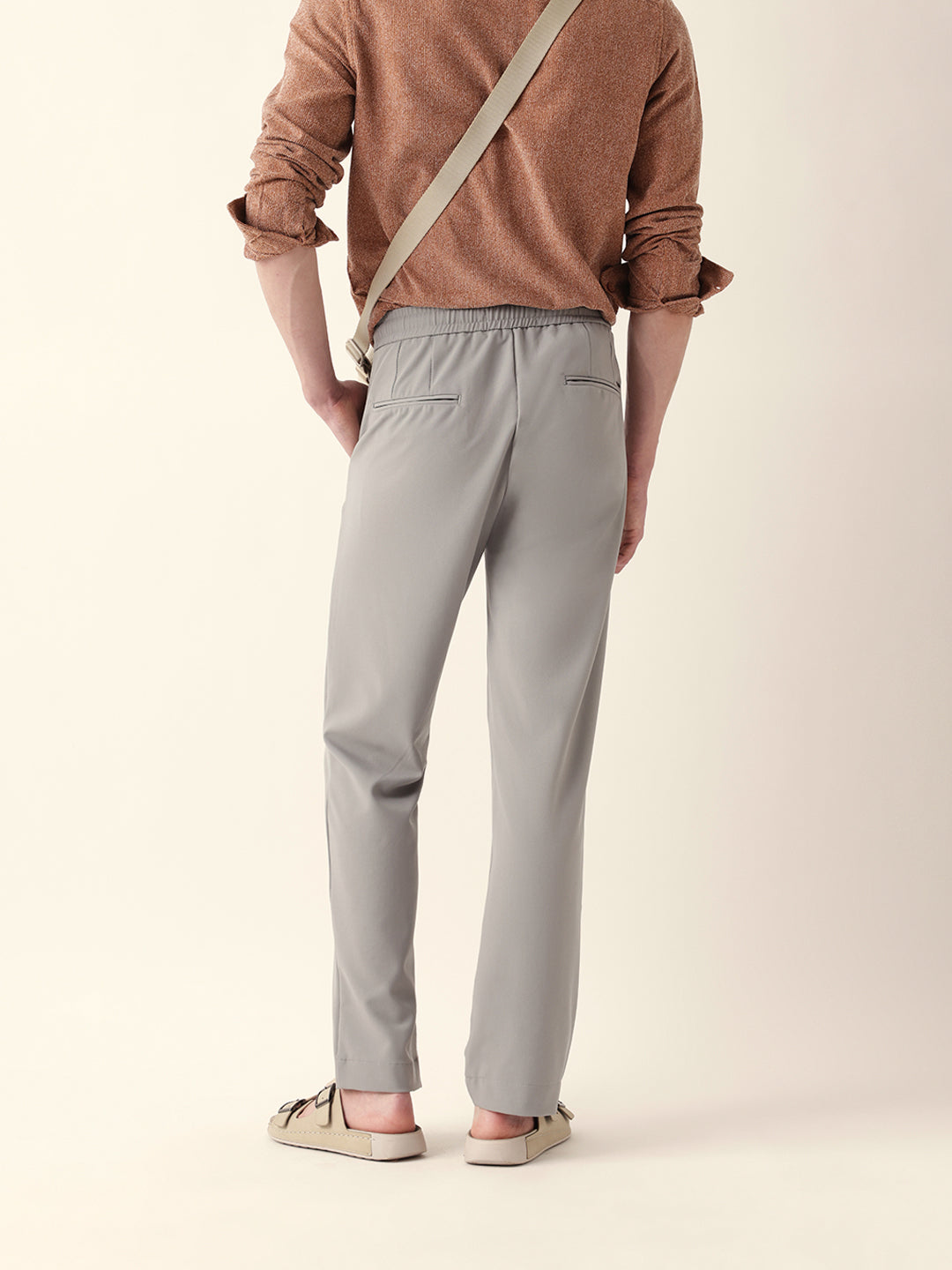 Shop Grey Solid Relax Fit Casual Trousers with Hidden Drawstring Online