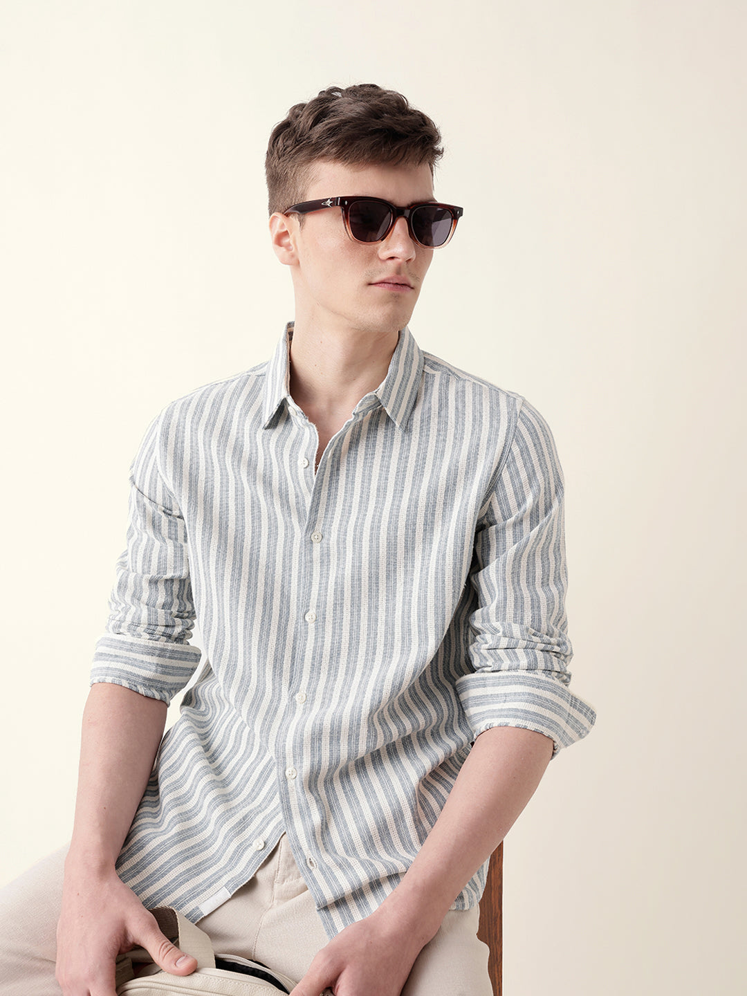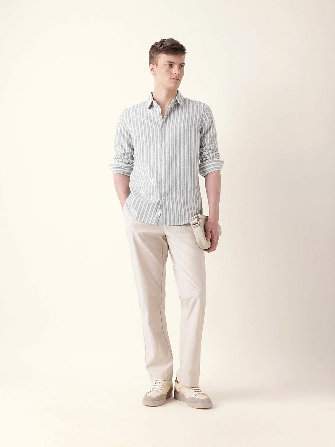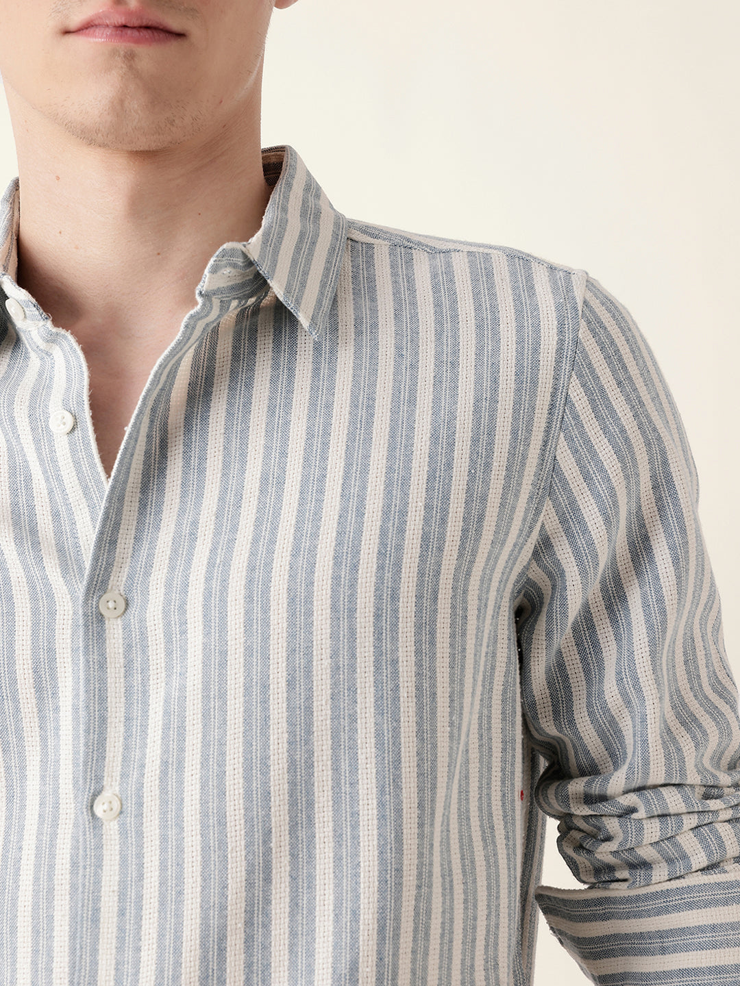 Blue with Cream Woven Vertical Pinstripes Slim Fit Casual Shirt