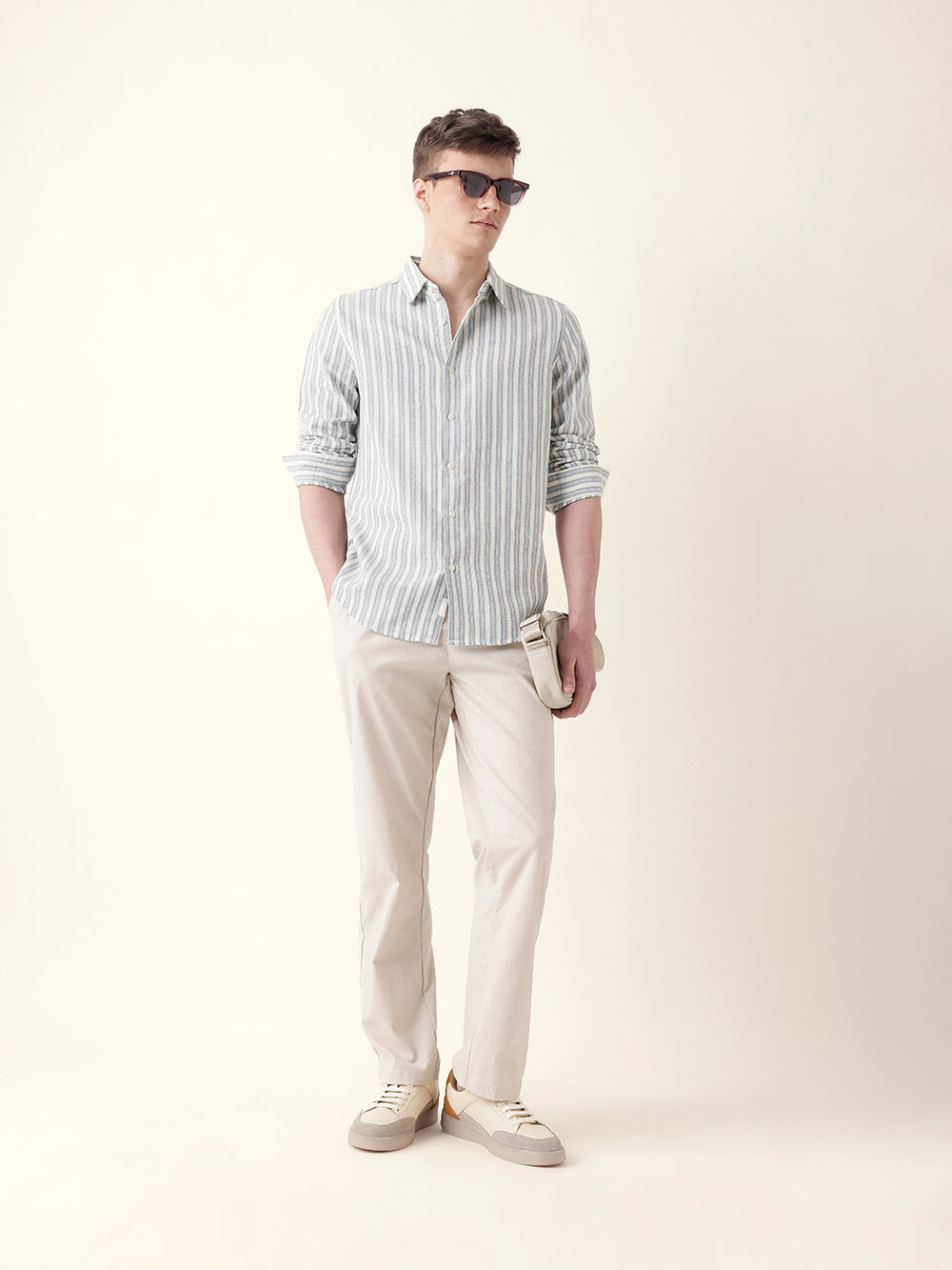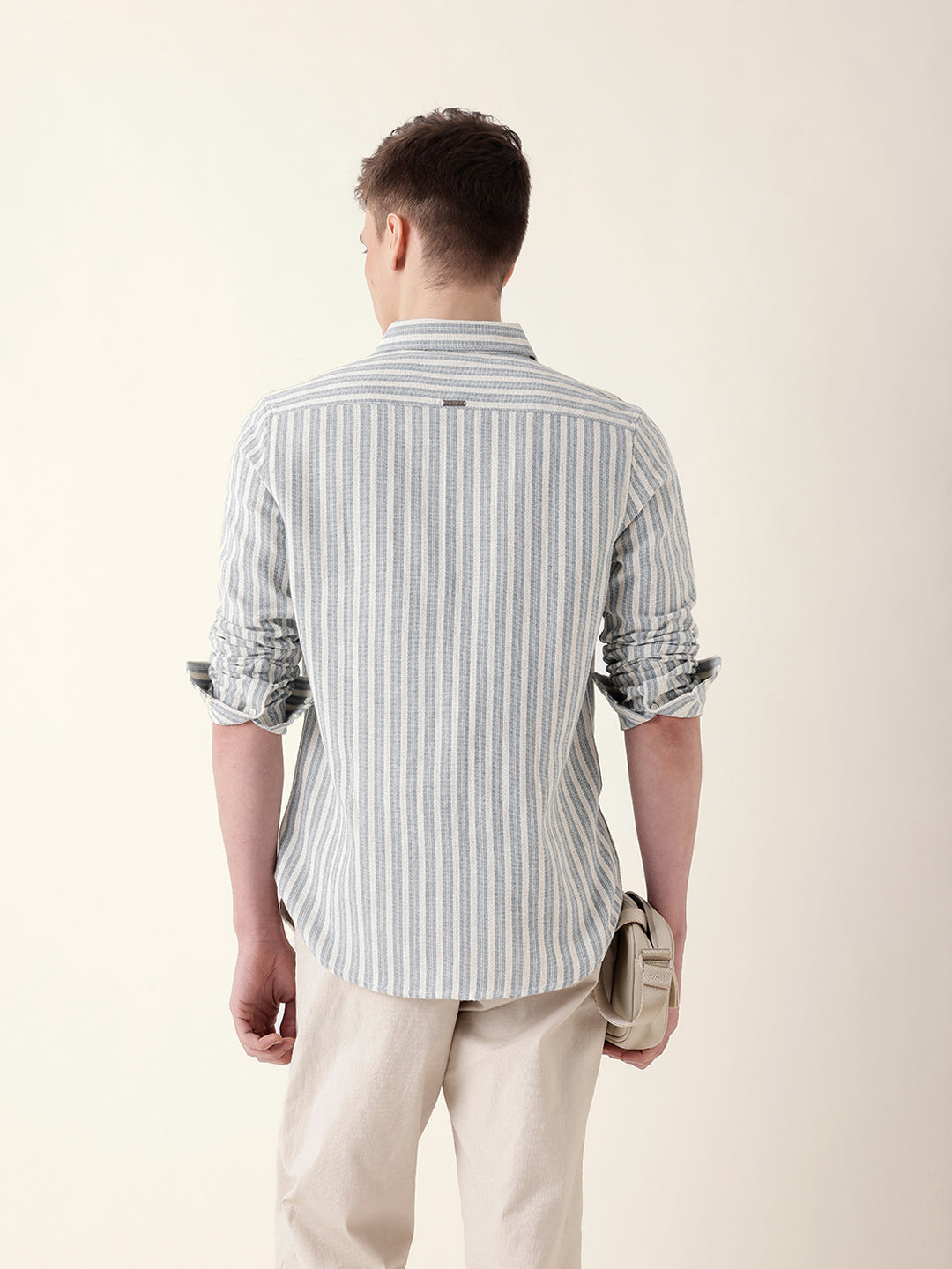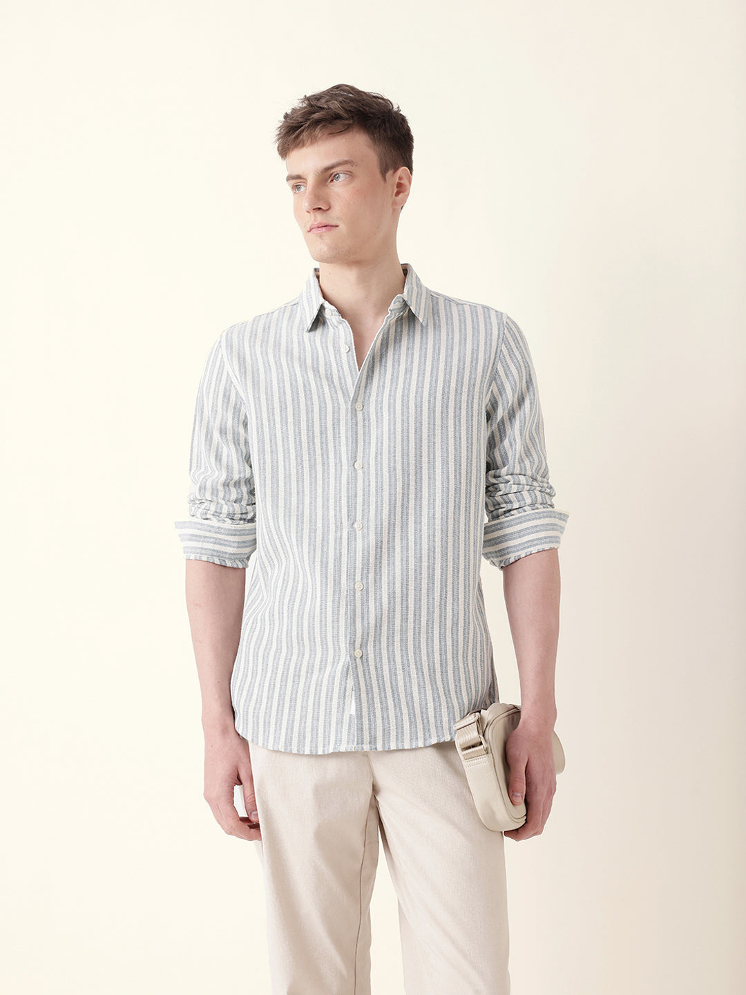 Blue with Cream Woven Vertical Pinstripes Slim Fit Casual Shirt