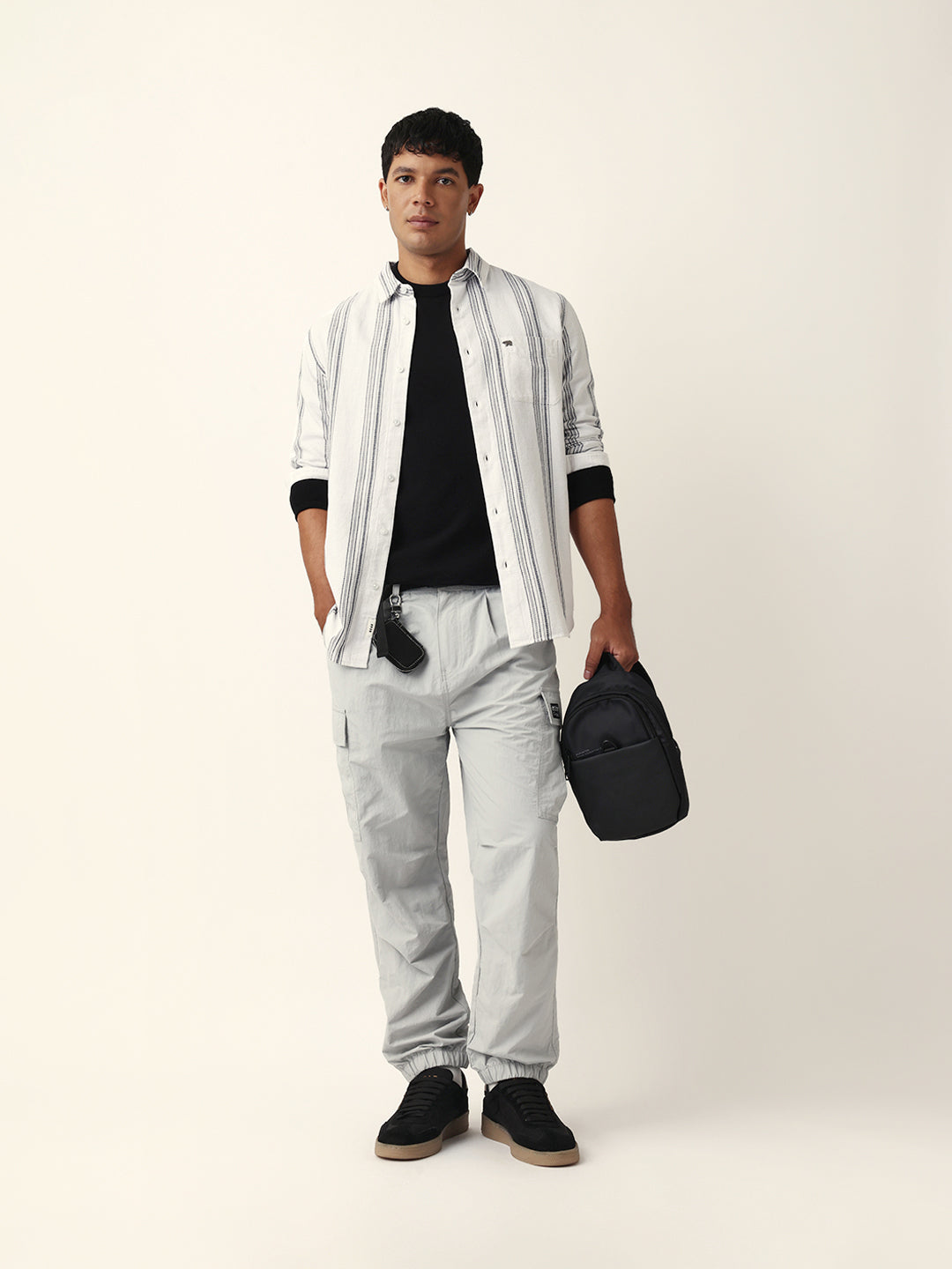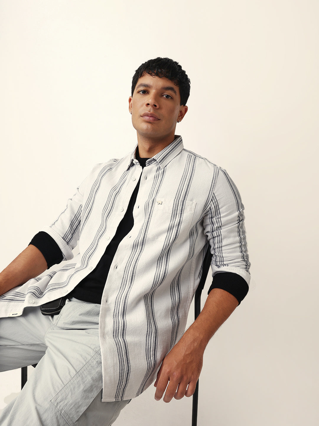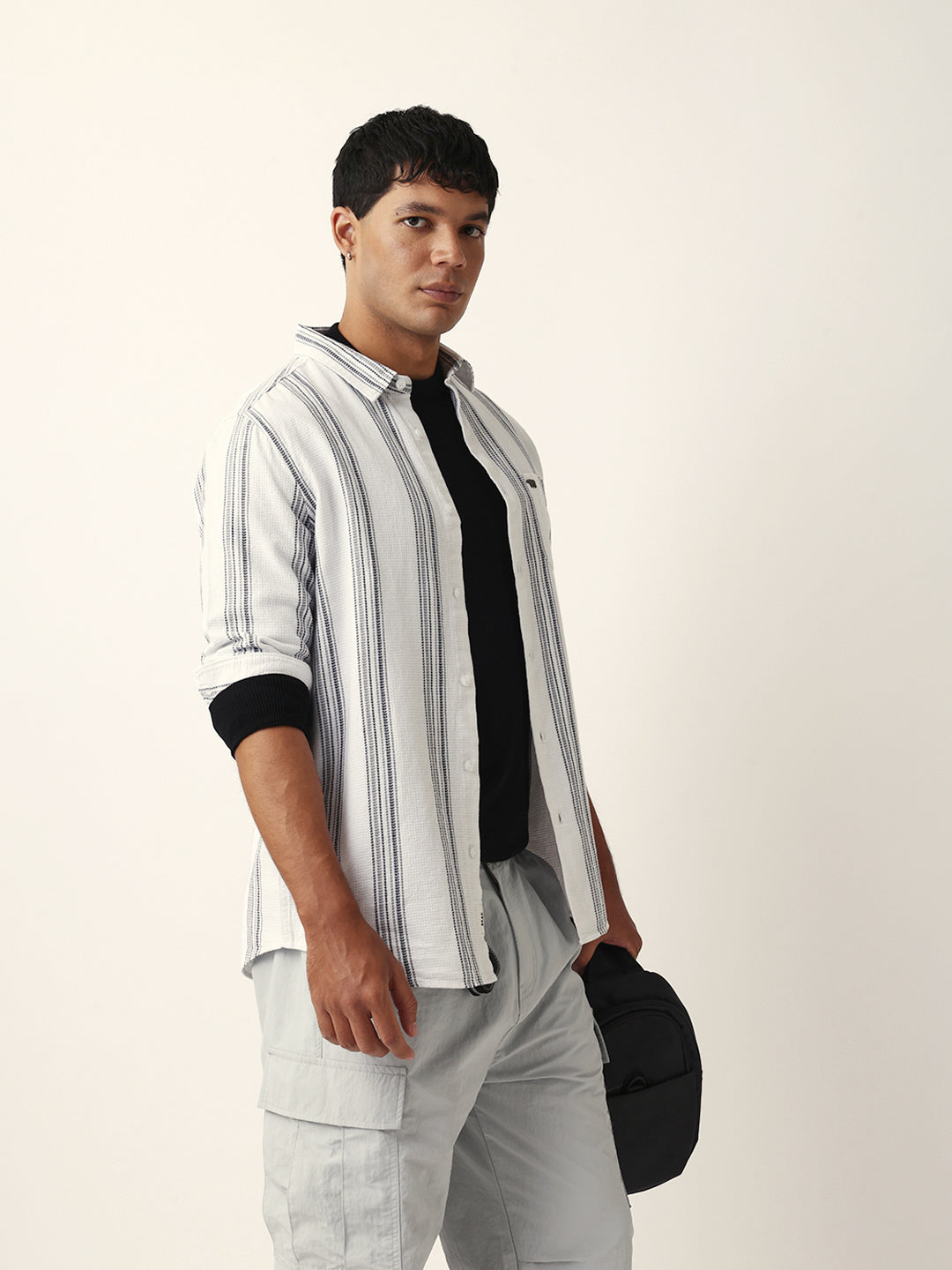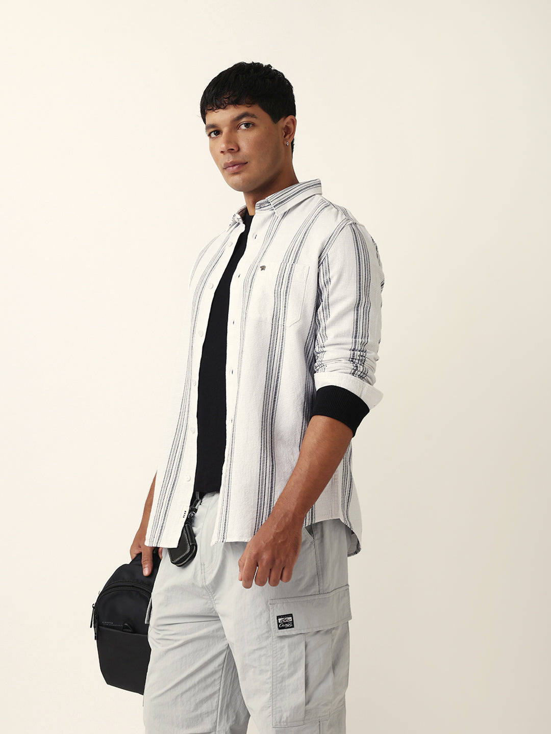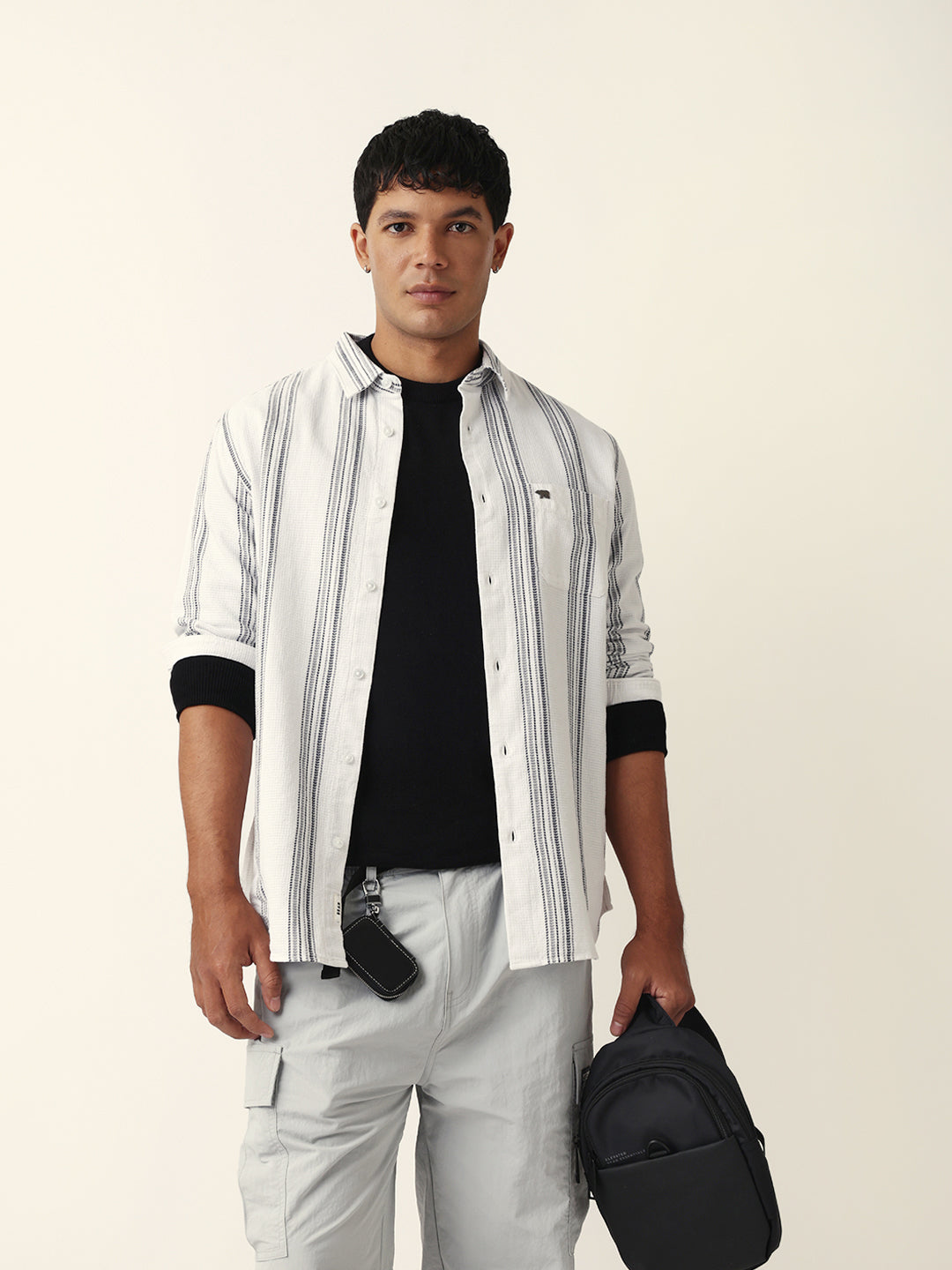 Shop White Vertical Woven Stripe Slim Fit Casual Shirt Online.