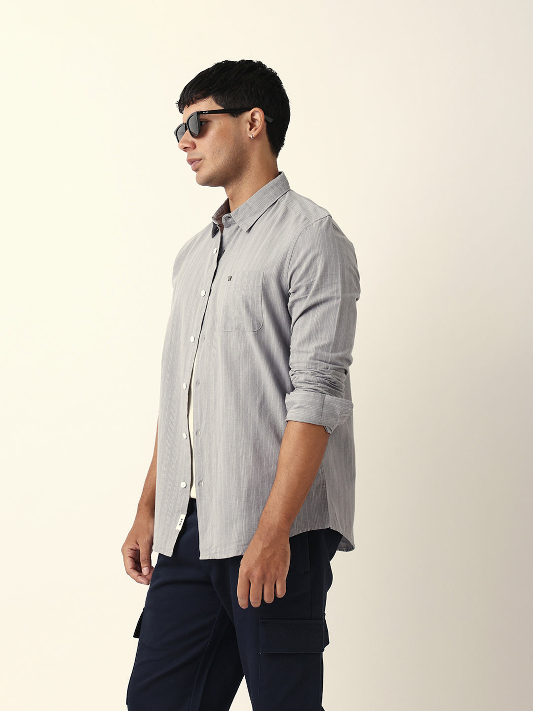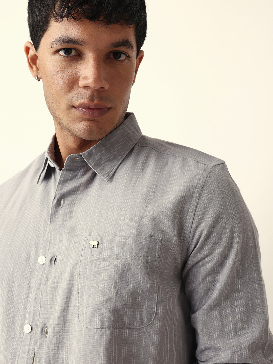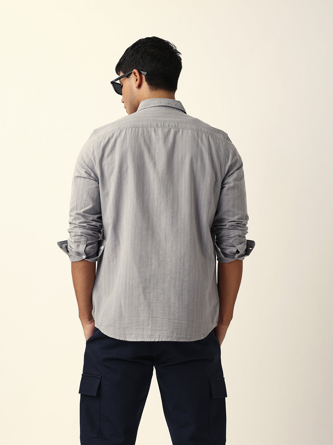 Shop Grey Woven Vertical Pinstripes Slim Fit Casual Shirt Online.