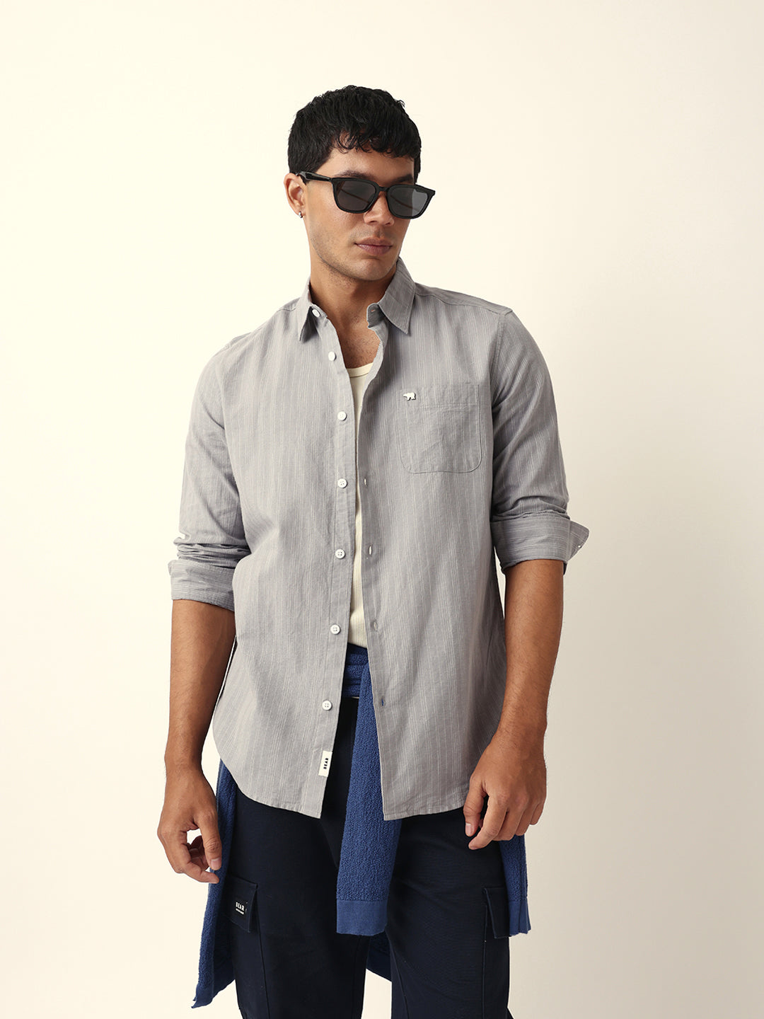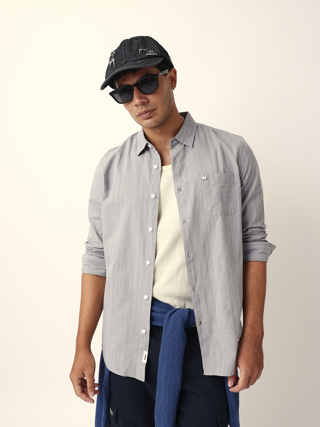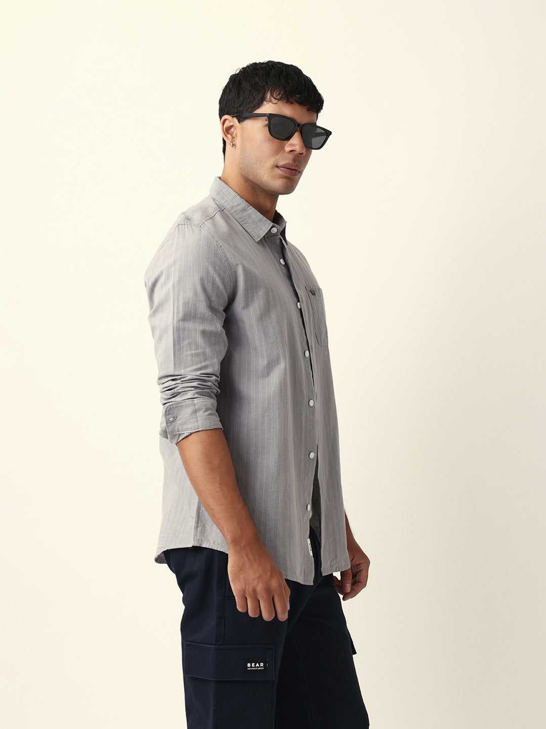 Shop Grey Woven Vertical Pinstripes Slim Fit Casual Shirt Online.