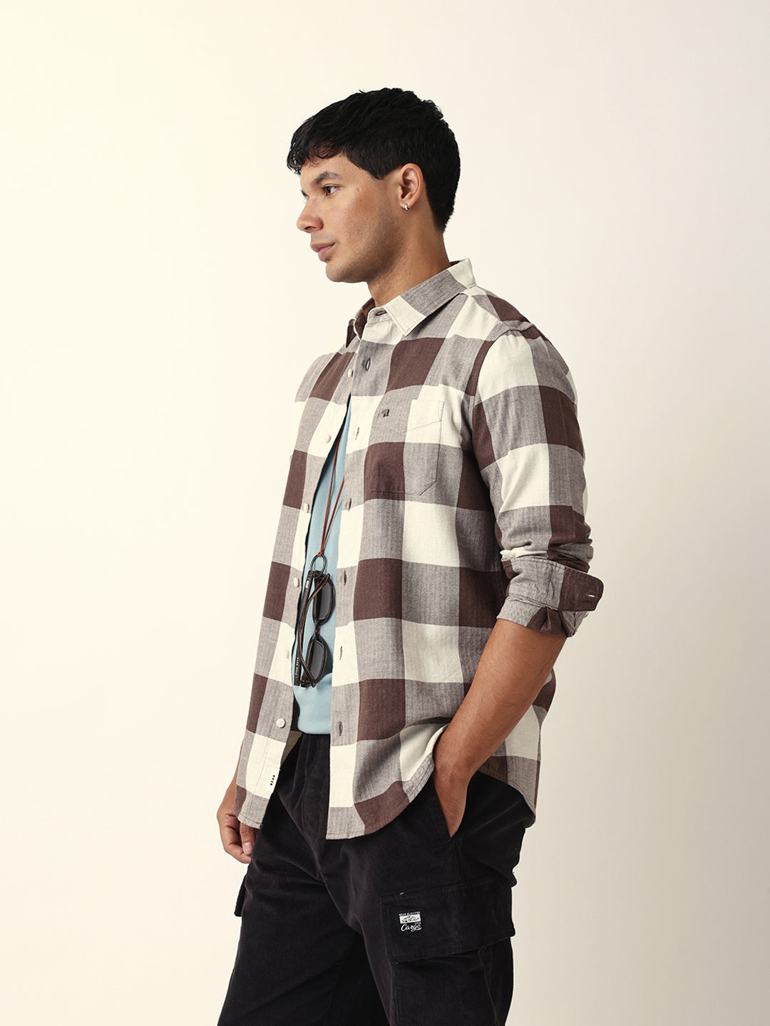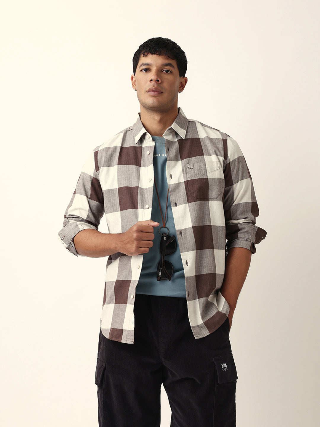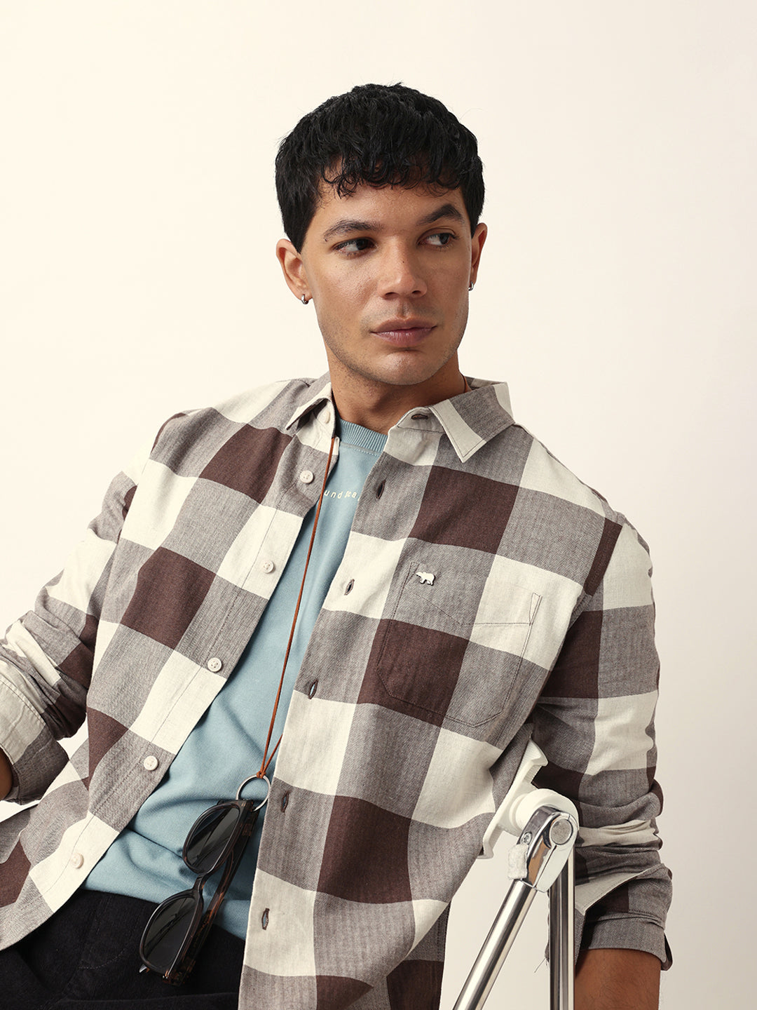 Shop Brown with Cream Woven Checks Slim Fit Casual Shirt Online.