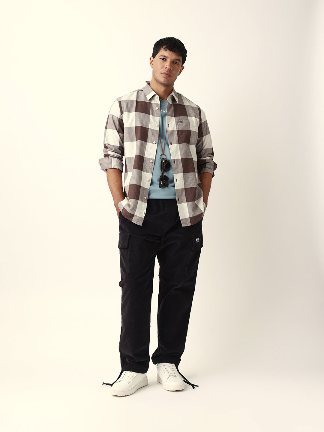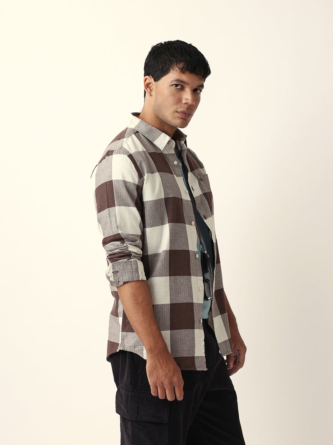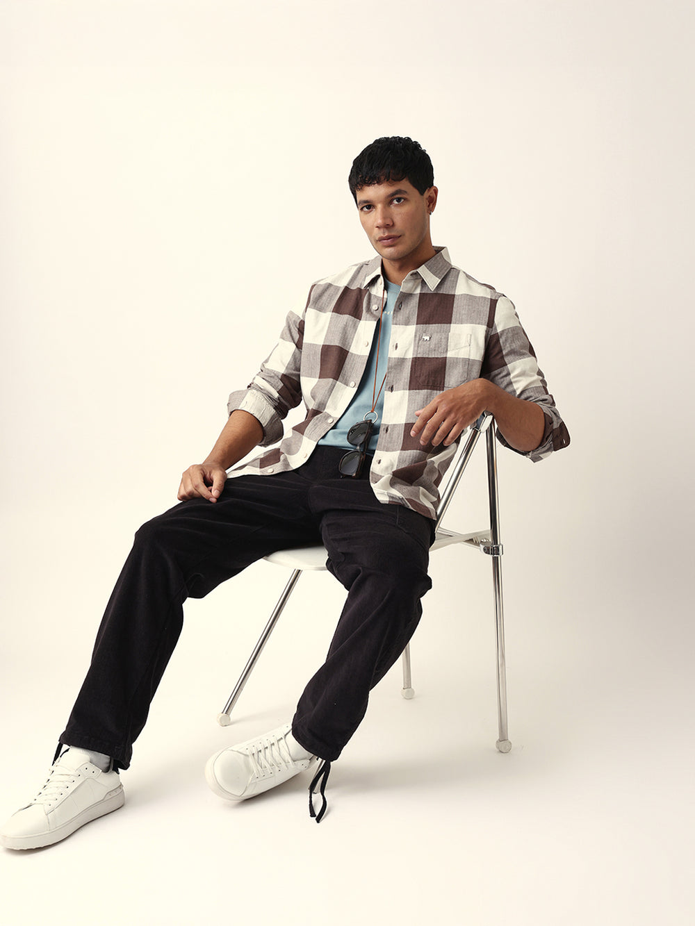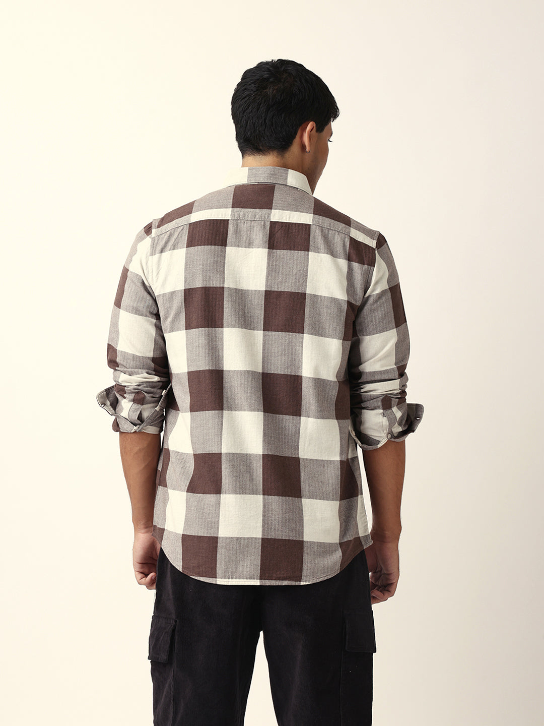 Shop Brown with Cream Woven Checks Slim Fit Casual Shirt Online.
