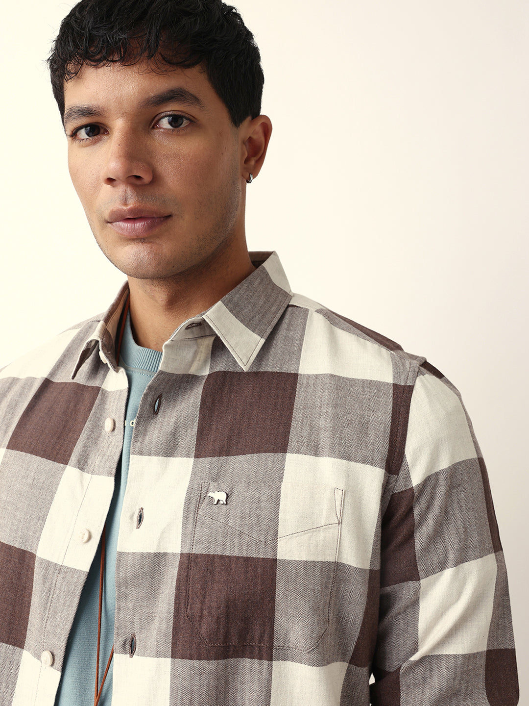 Brown with Cream Woven Checks Slim Fit Casual Shirt