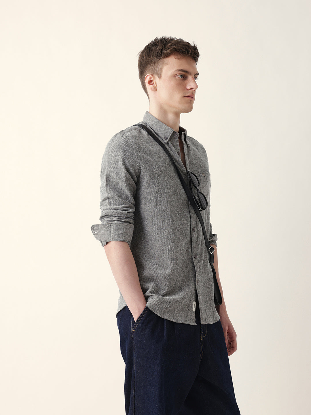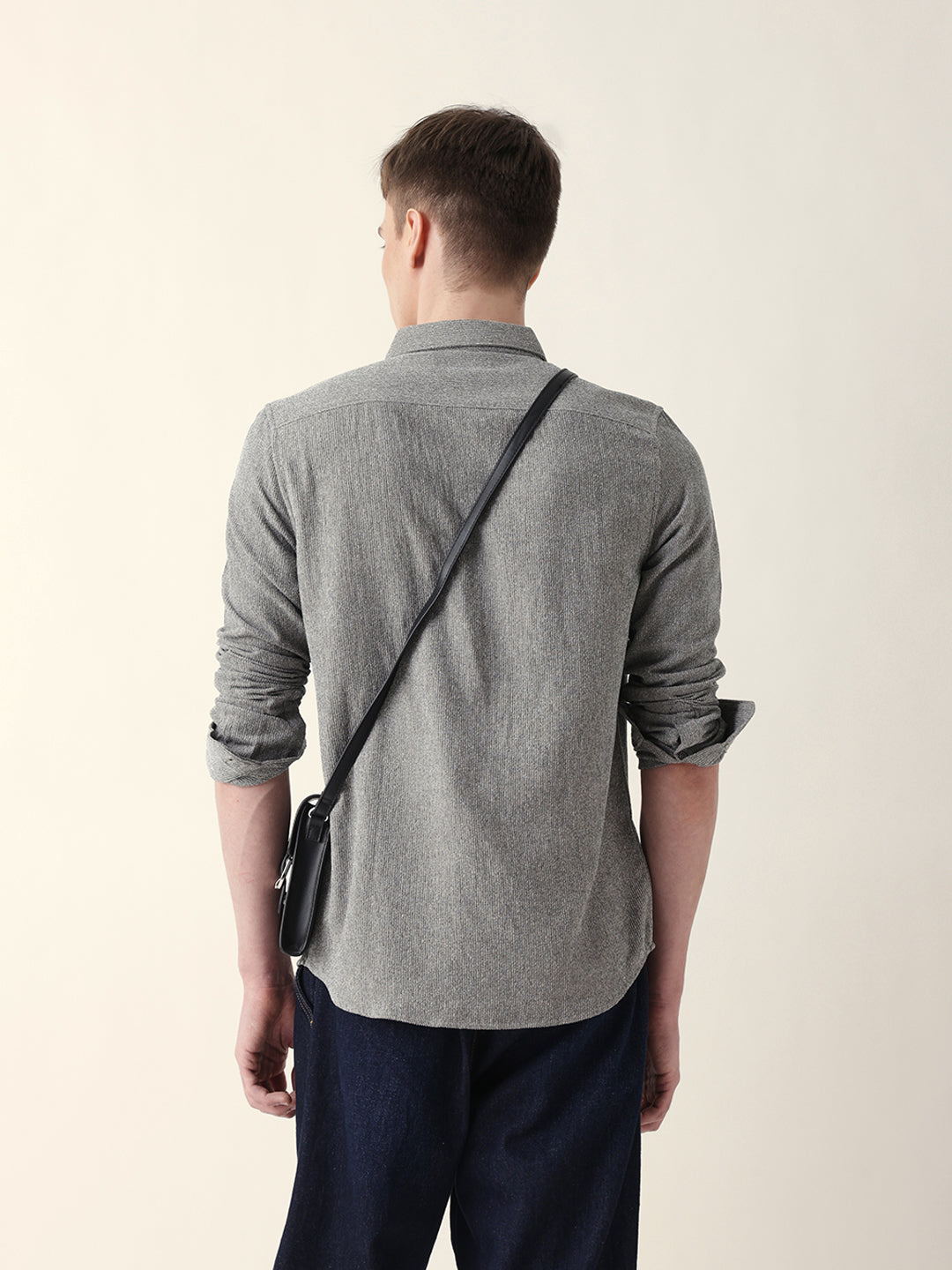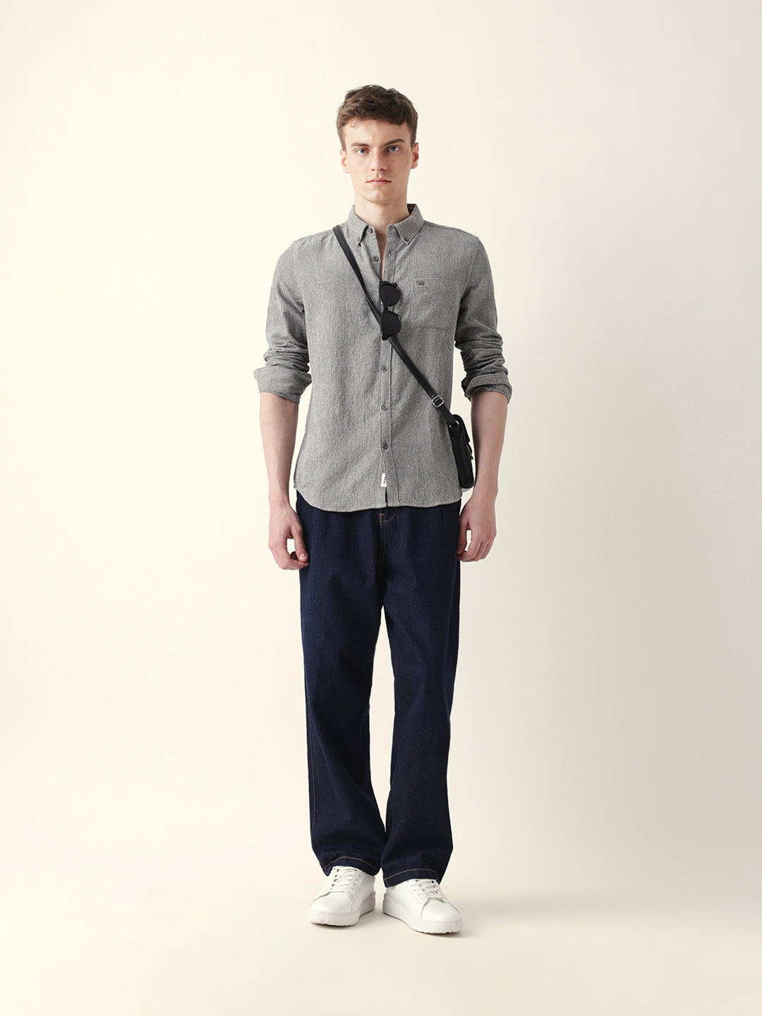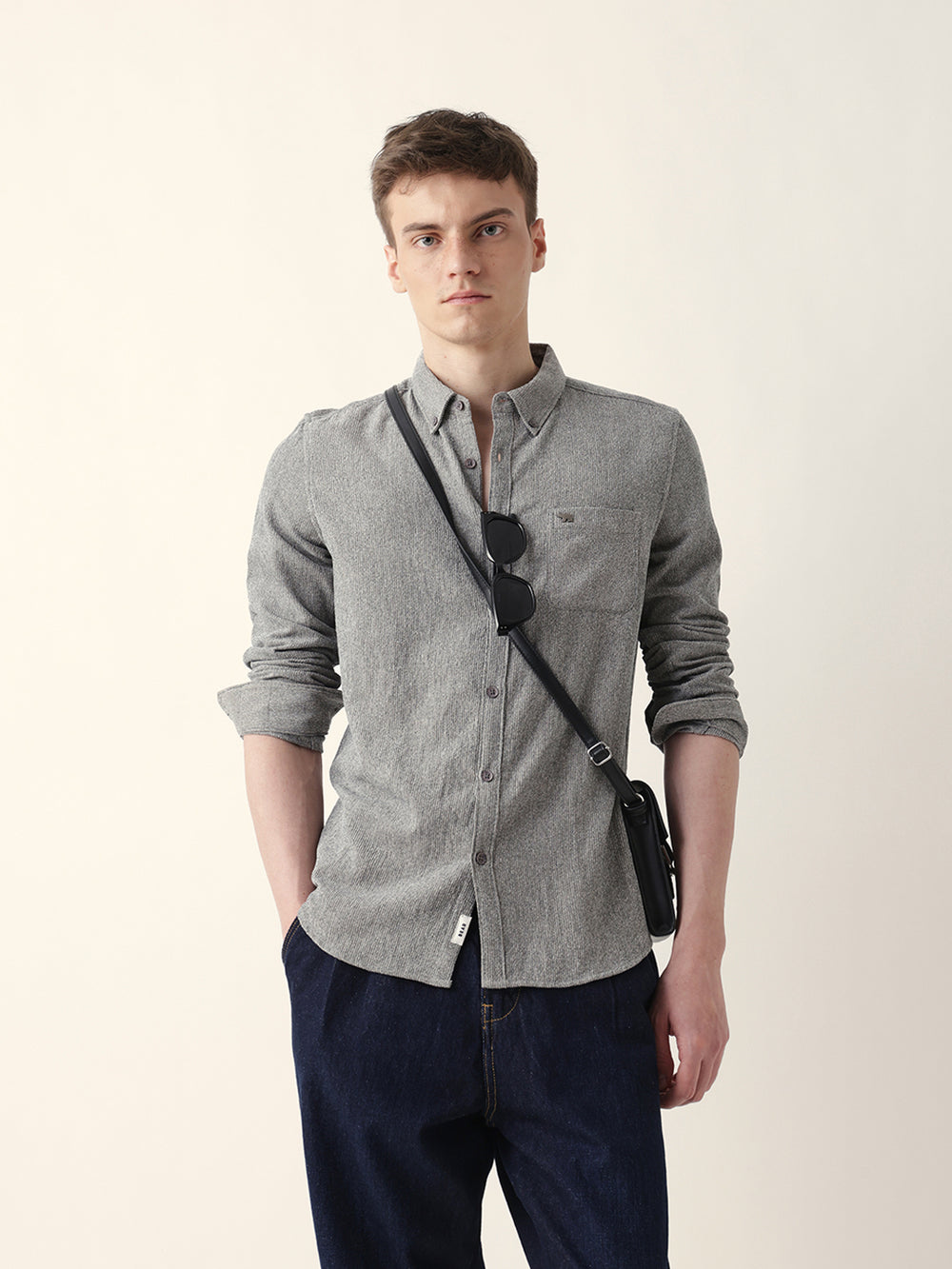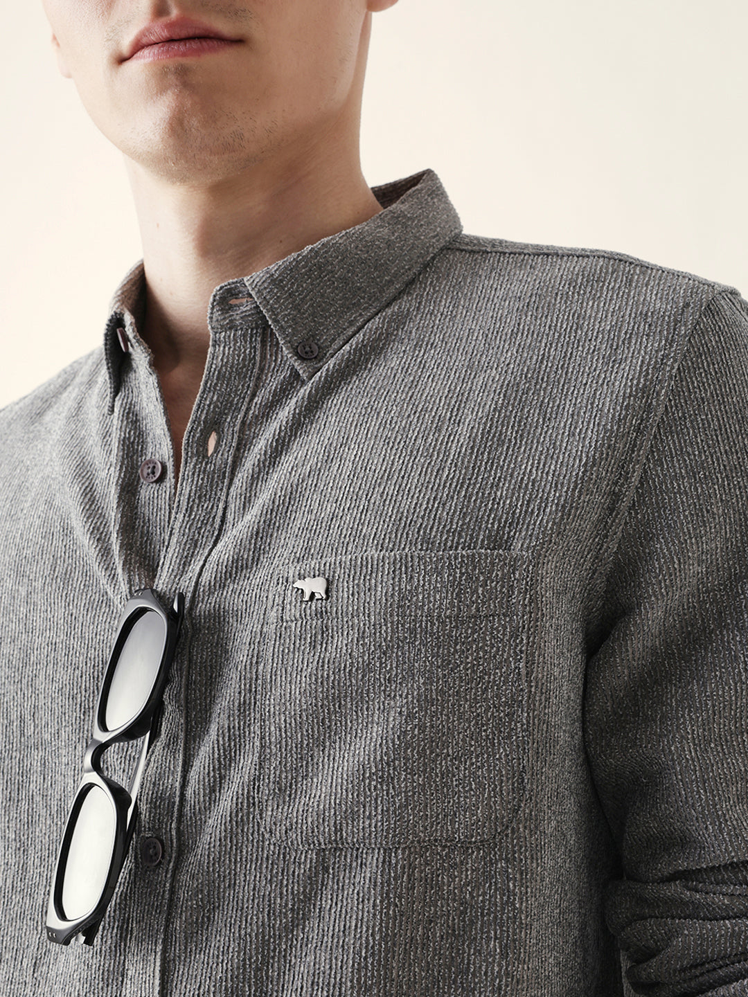 Shop Grey Textured Woven Striped Slim Fit Casual Shirt Online.