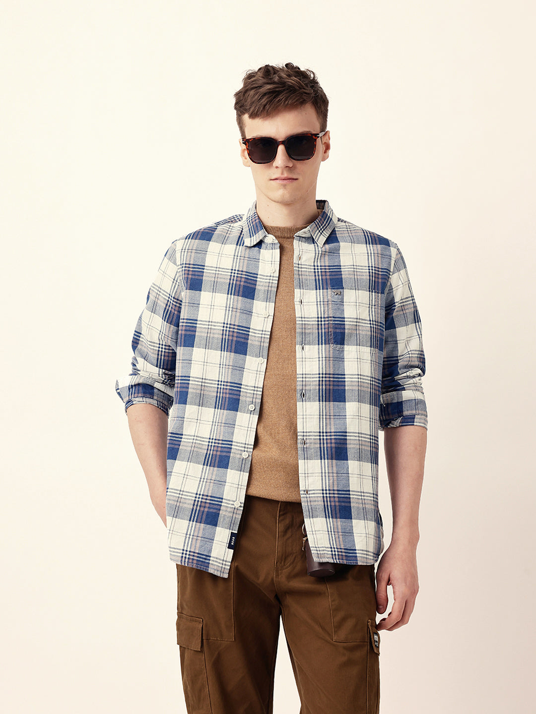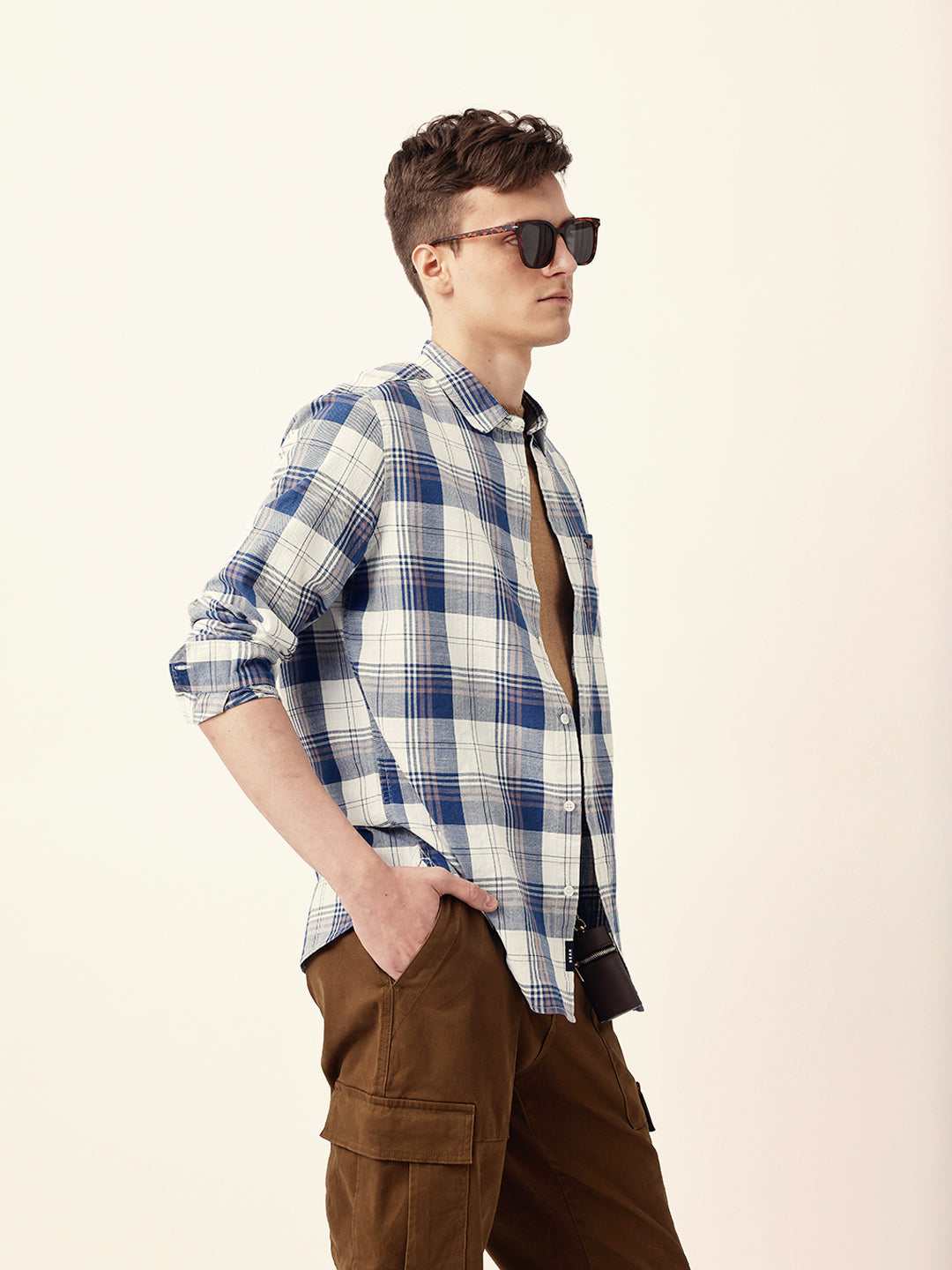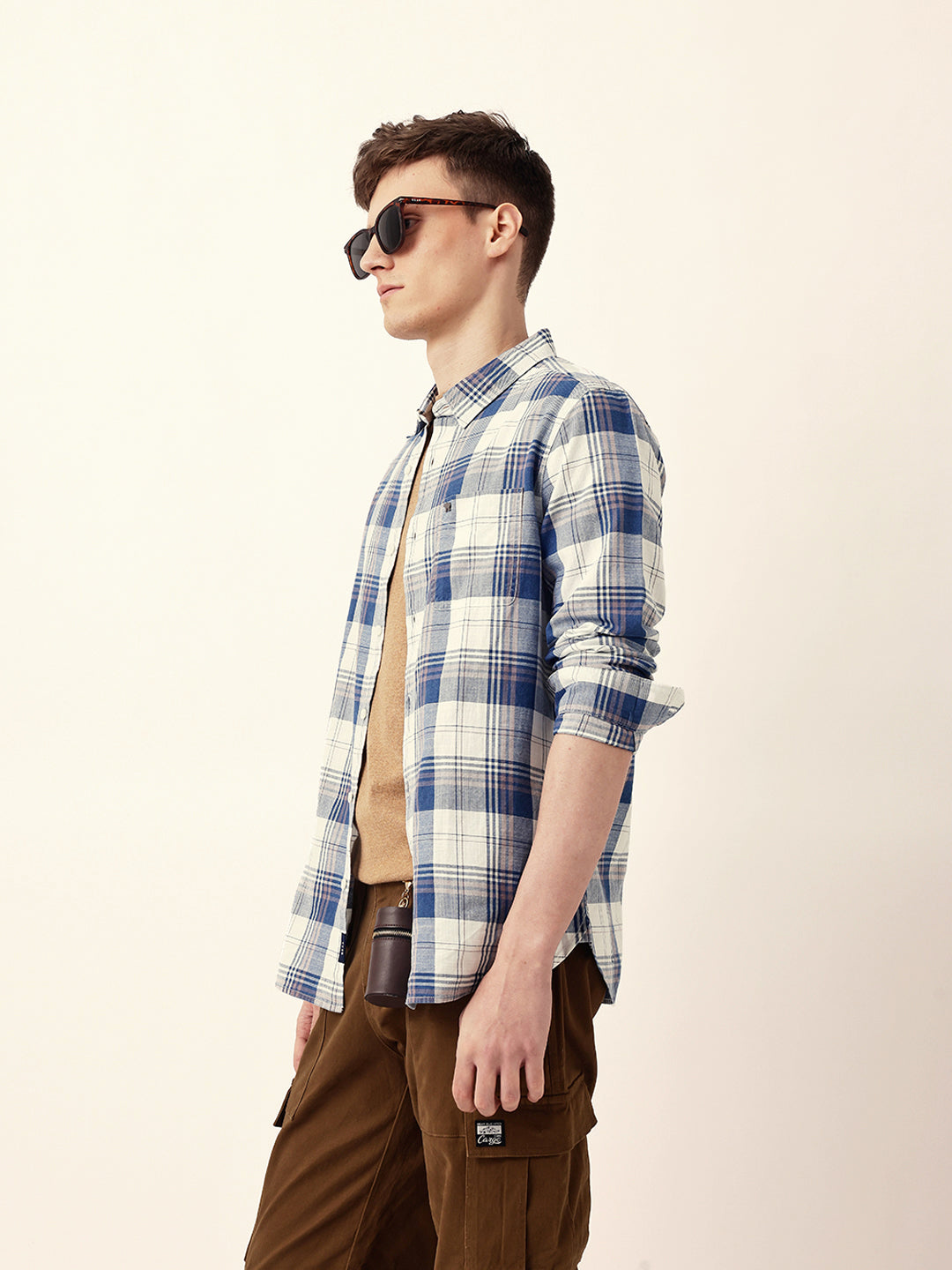 Shop Blue Woven Checkered Slim Fit Casual Shirt Online.