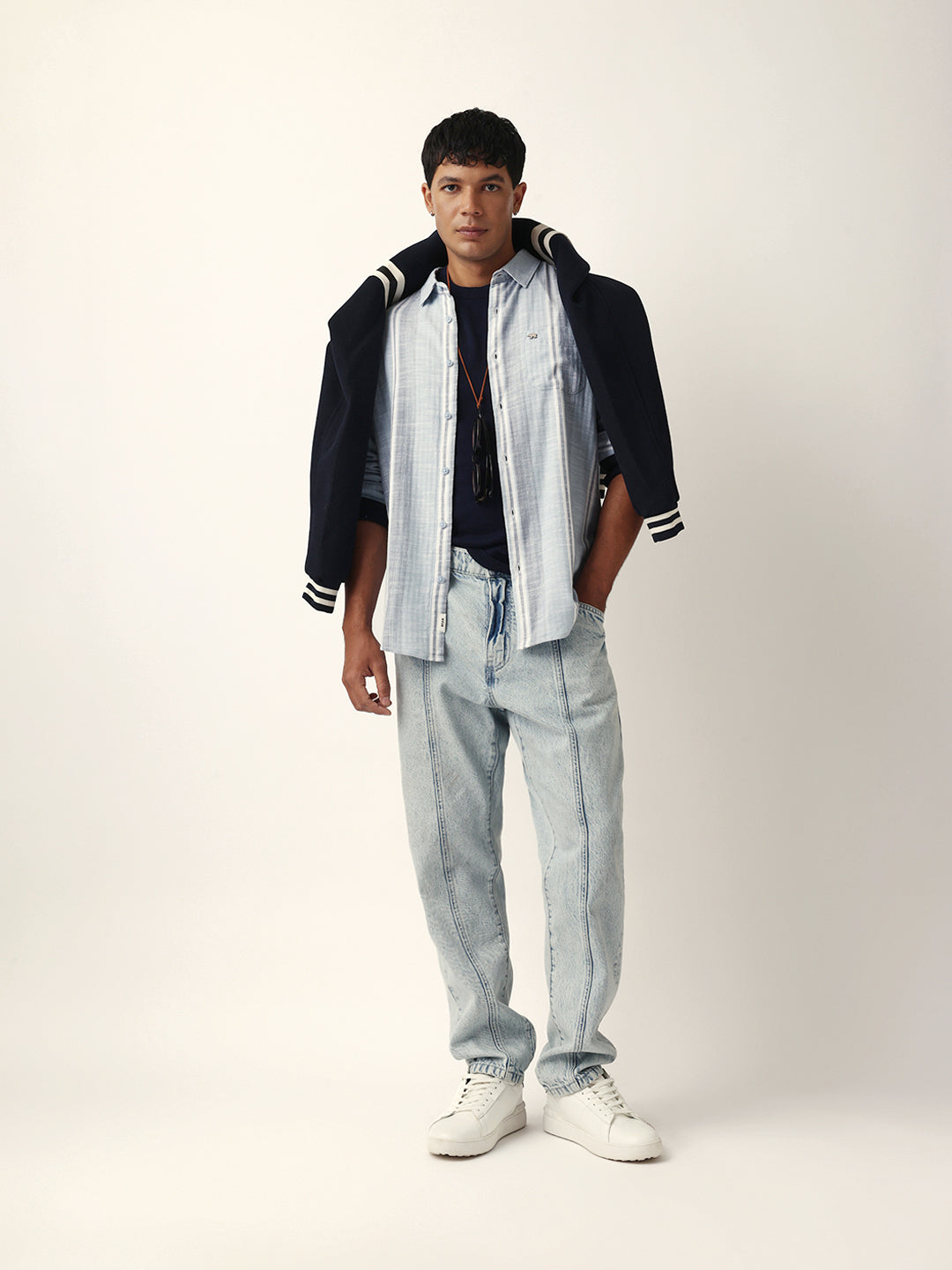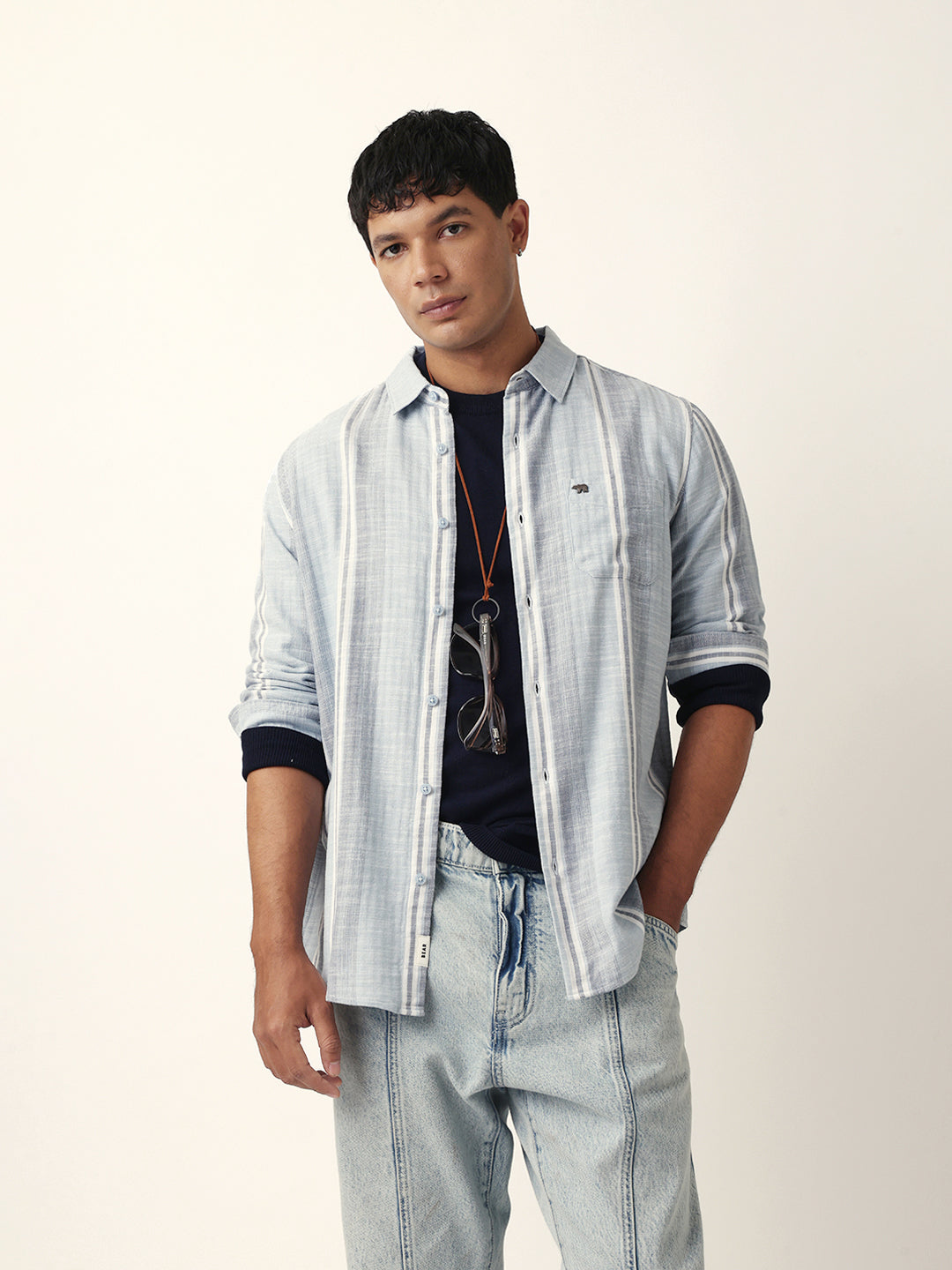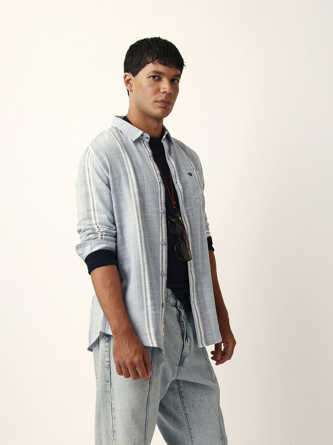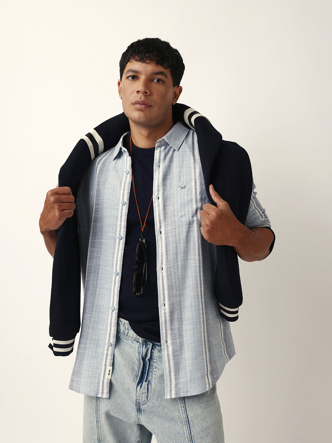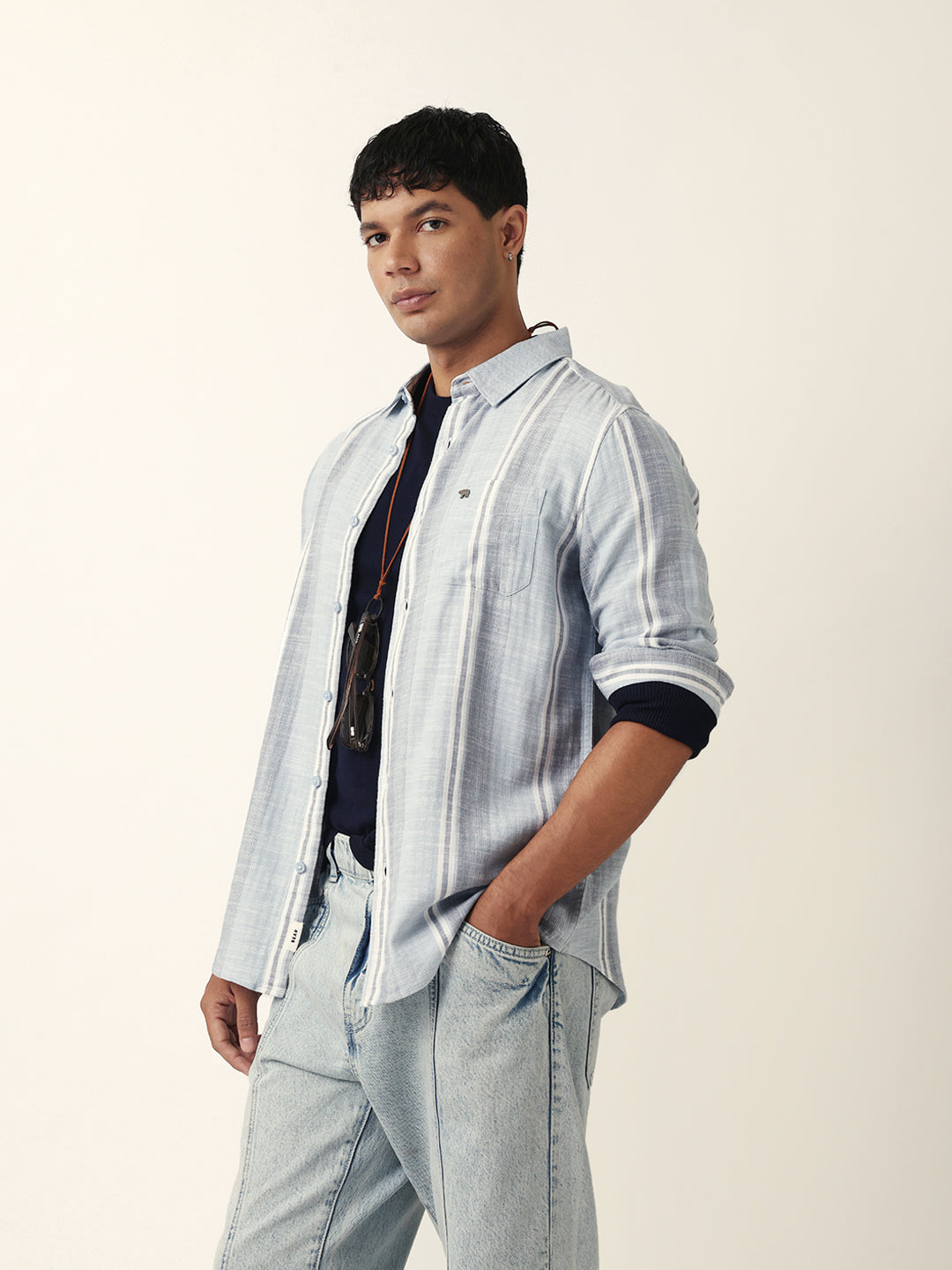 Shop Blue & White Herringbone Striped Slim Fit Casual Shirt Online.