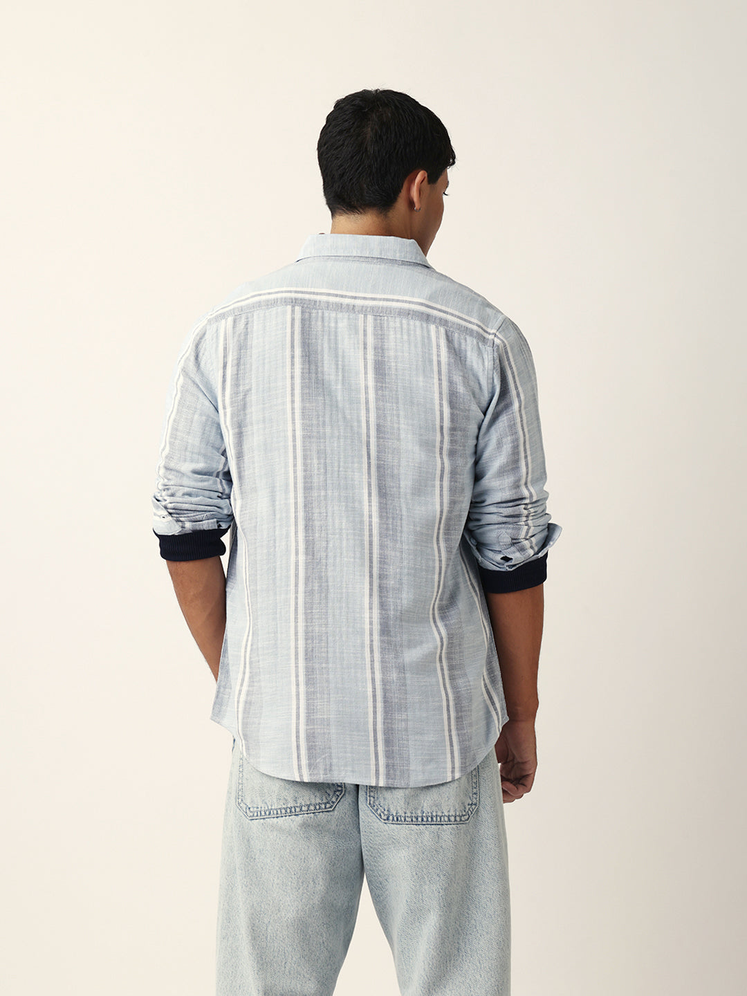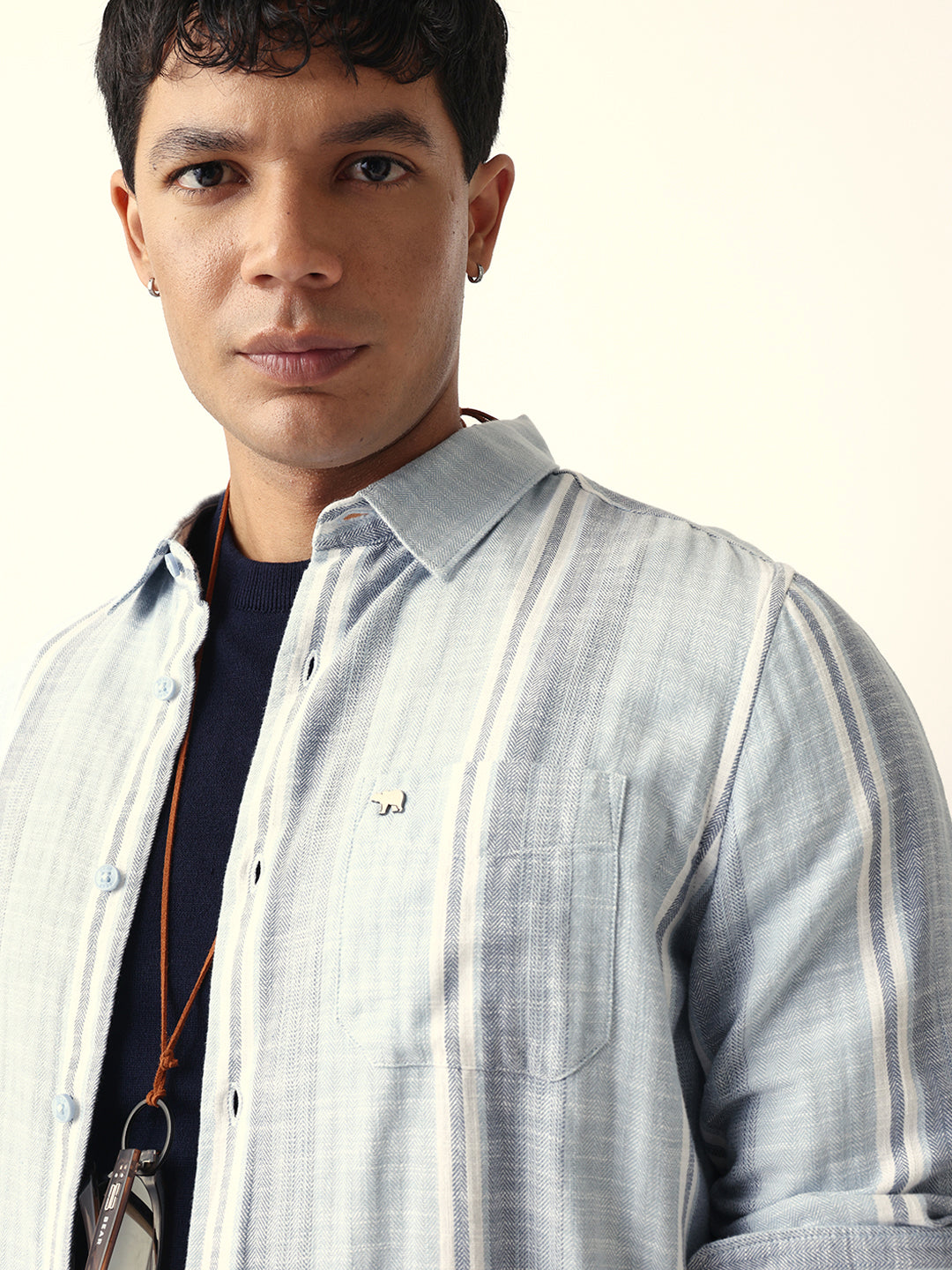 Blue & White Herringbone Striped Slim Fit Casual Shirt