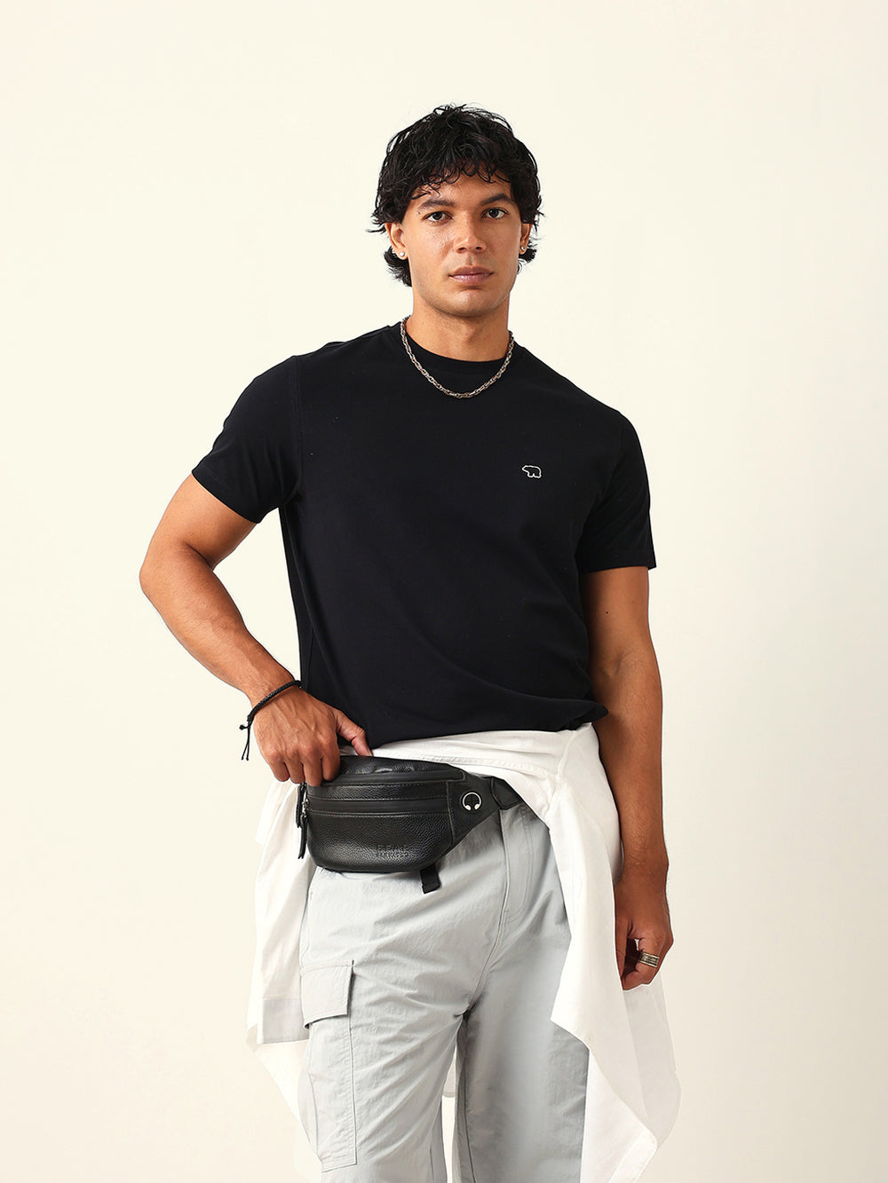 Shop Black Crew Neck Slim Fit T-Shirt with Bear Logo Embroidery Online