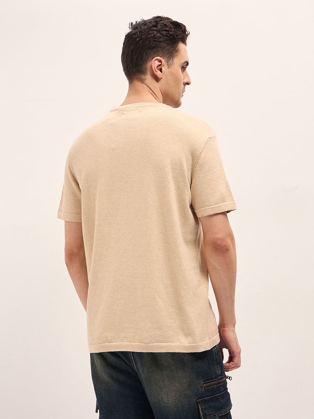 Beige Solid Regular Fit Ribbed Crew Neck T-shirt