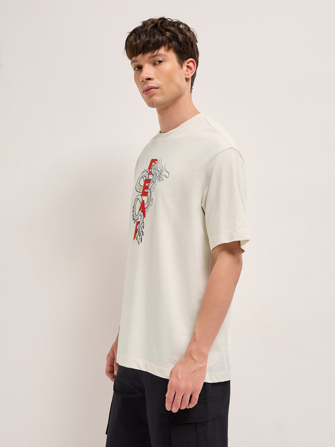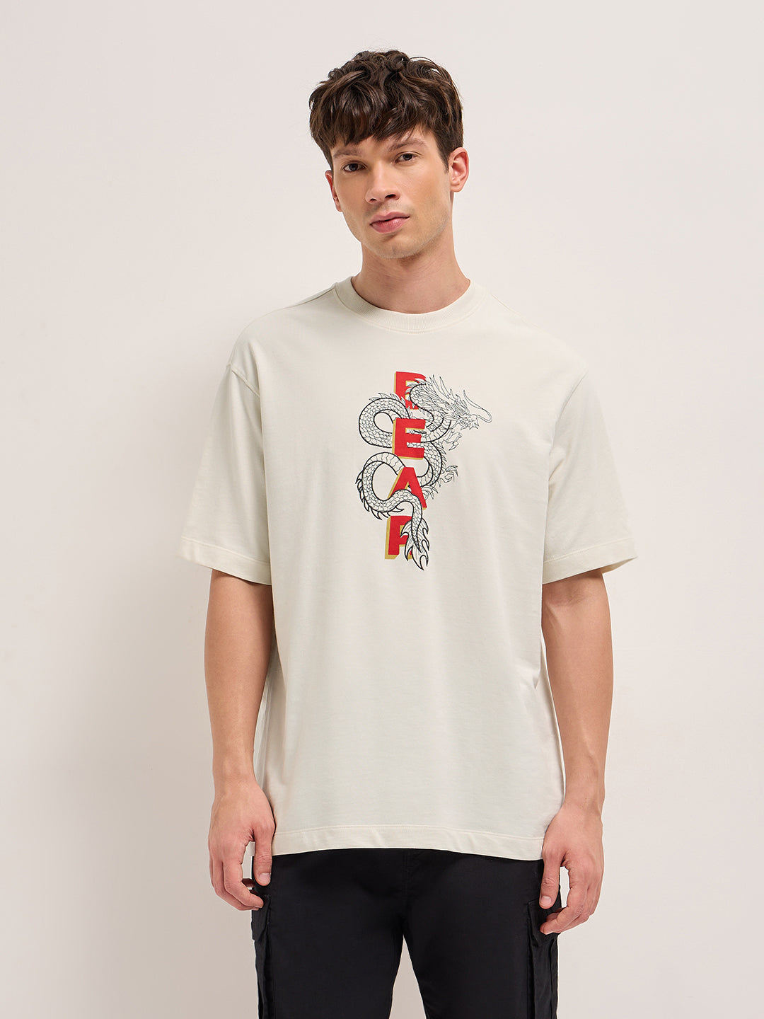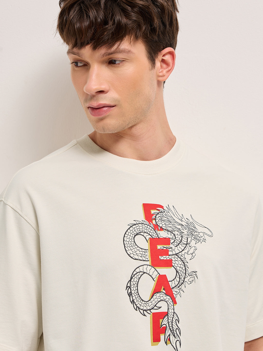 Shop Cream Oversized Crew Neck T-Shirt with Embroidered Dragon and “FEAR” Text Graphic Online